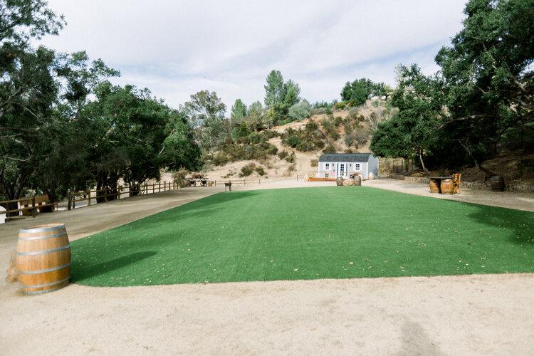 Bride get ready barn, large lawn with wine barrels and rustic wood furniture. Majestic Oak Trees. 6, 8 feet wood tables with wood benches and 2 chairs per table. Use of the area around the School House for cocktails. On-site parking, bathrooms, lighting, beautiful views and amazing picture spots all around our 5 acre venue.