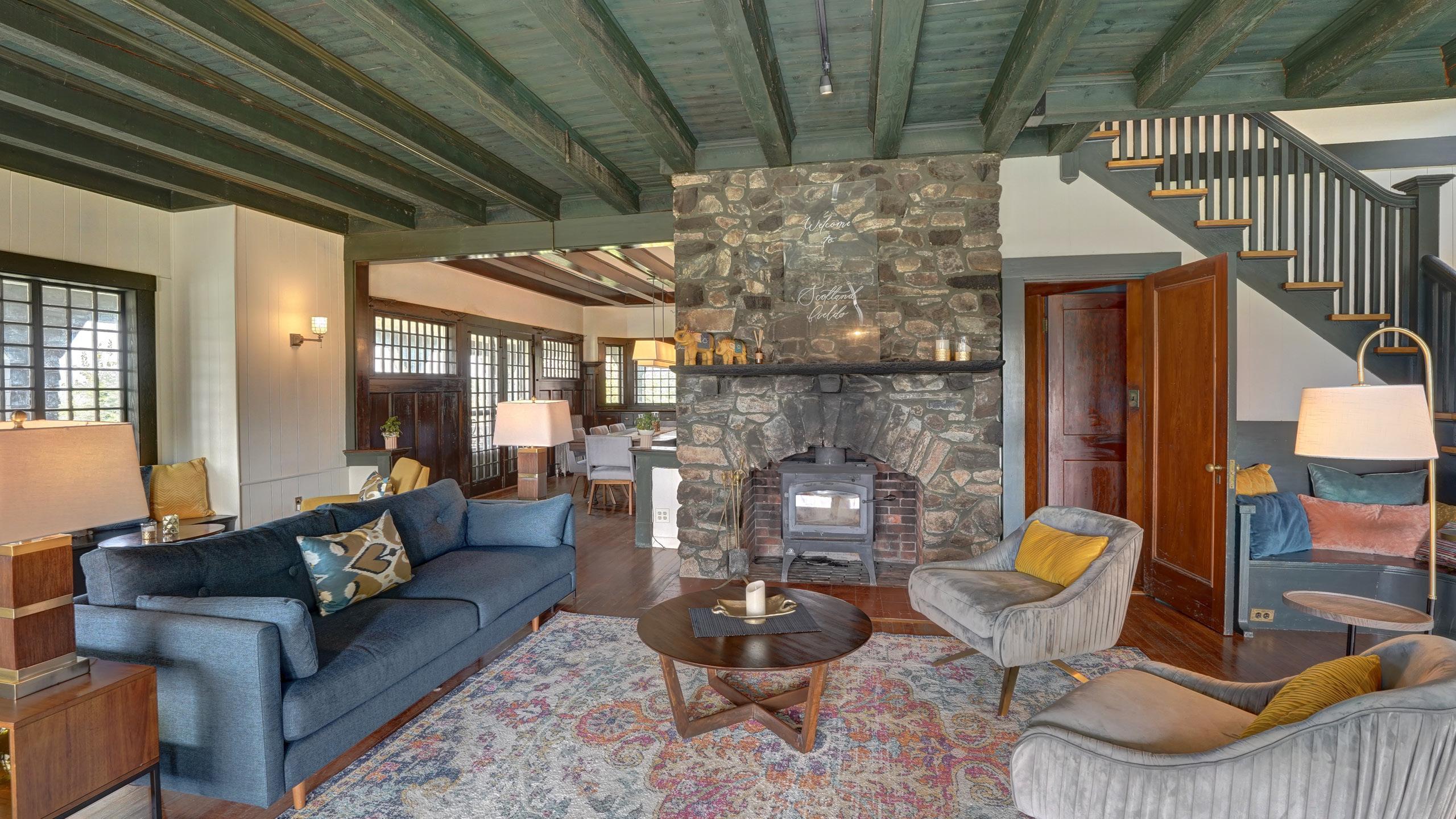 1 Master suite with clawfoot tub and rain head shower (king bed) - 3 Bedrooms (2 w/queen beds, 1 w/ two twins) - 2.5 Bathrooms - Fully equipped kitchen with soapstone counters - Butler’s pantry with copper sink - Open concept living / dining room with built-ins - Grand, original stone hearth - Spectacular wrap-around porch - Propane grill