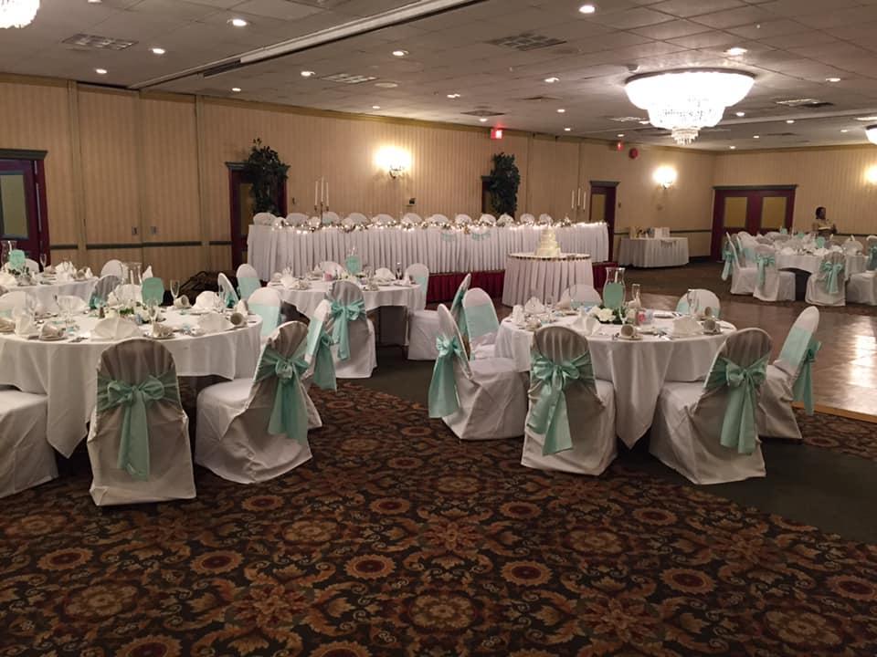 Seated service style reception with Cocktail hour. Includes 3 hours of open bar. Buffet style reception with served oup and salad. Dinner includes your choice of two or three proteins for your guests. Includes 4 hours of open bar. Package includes: Complementary guest room for Bride and Groom, Hospitatlity room for Bridal Party, Skirted head table, White table linen, Chair covers with your choice of sash color andCandlelight centerpieces for each table