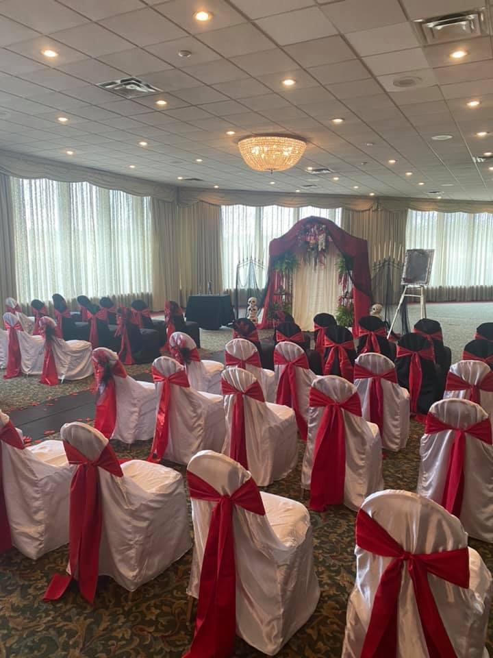 Served style reception with butler served Hors d'oeuvres. Champagne toast, Served dinner and 4 hours of open bar. Package includes: Complementary guest room for Bride and Groom, Hospitatlity room for Bridal Party, Skirted head table, White table linen, Chair covers with your choice of sash color as well as this package only... fresh flowers for tables and cake