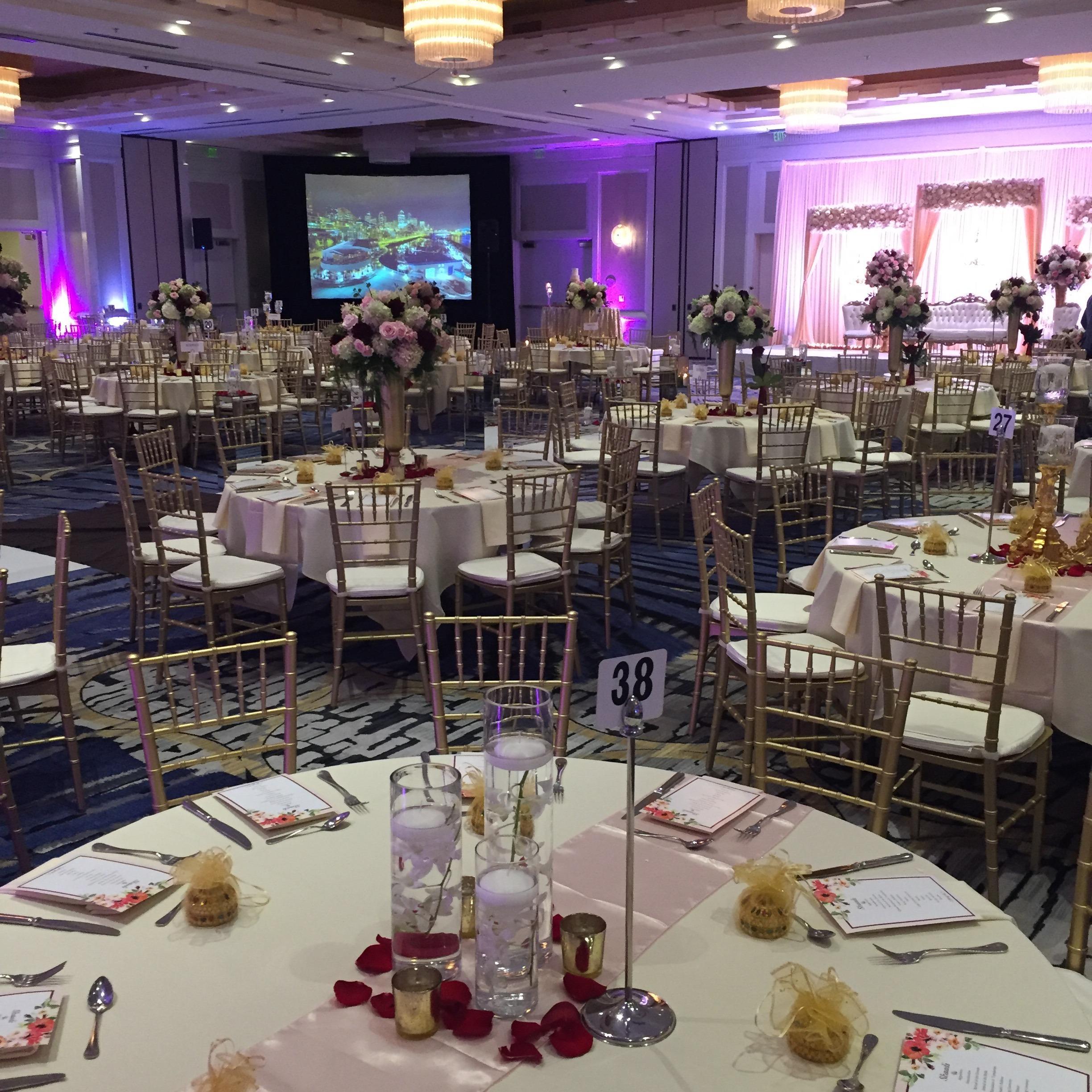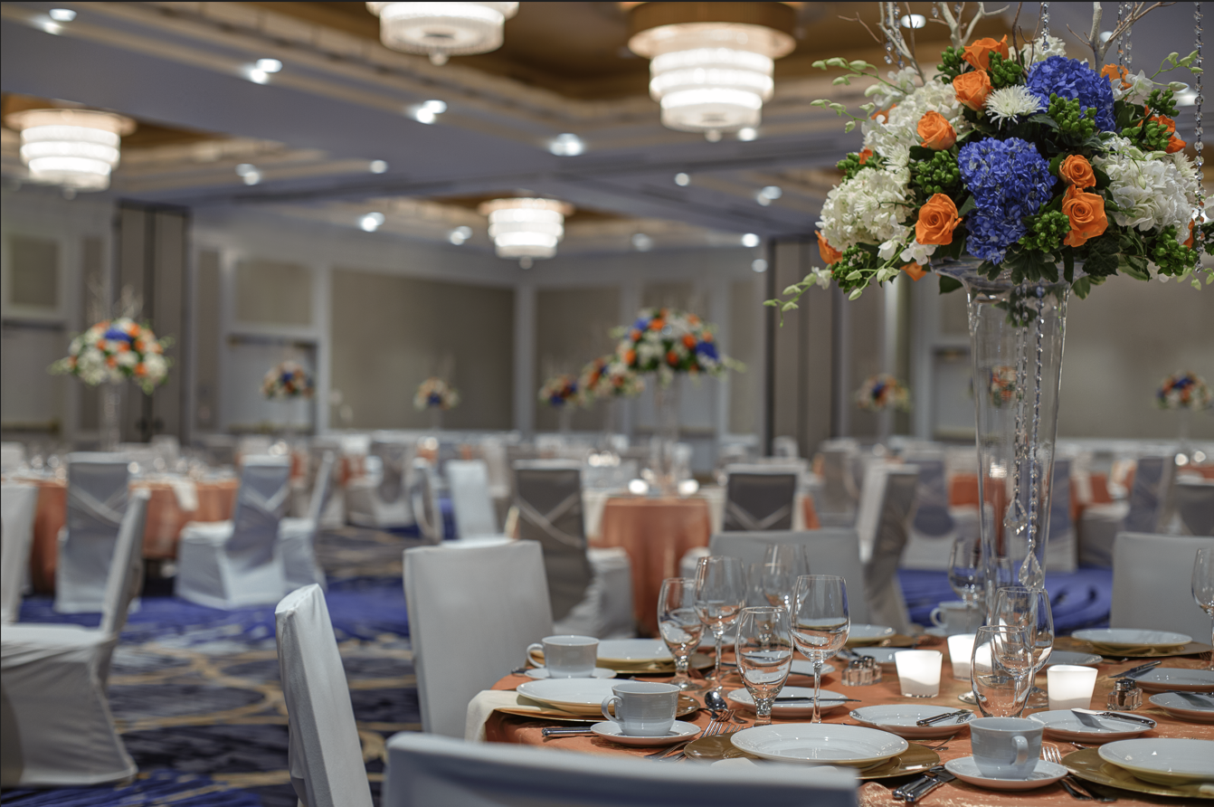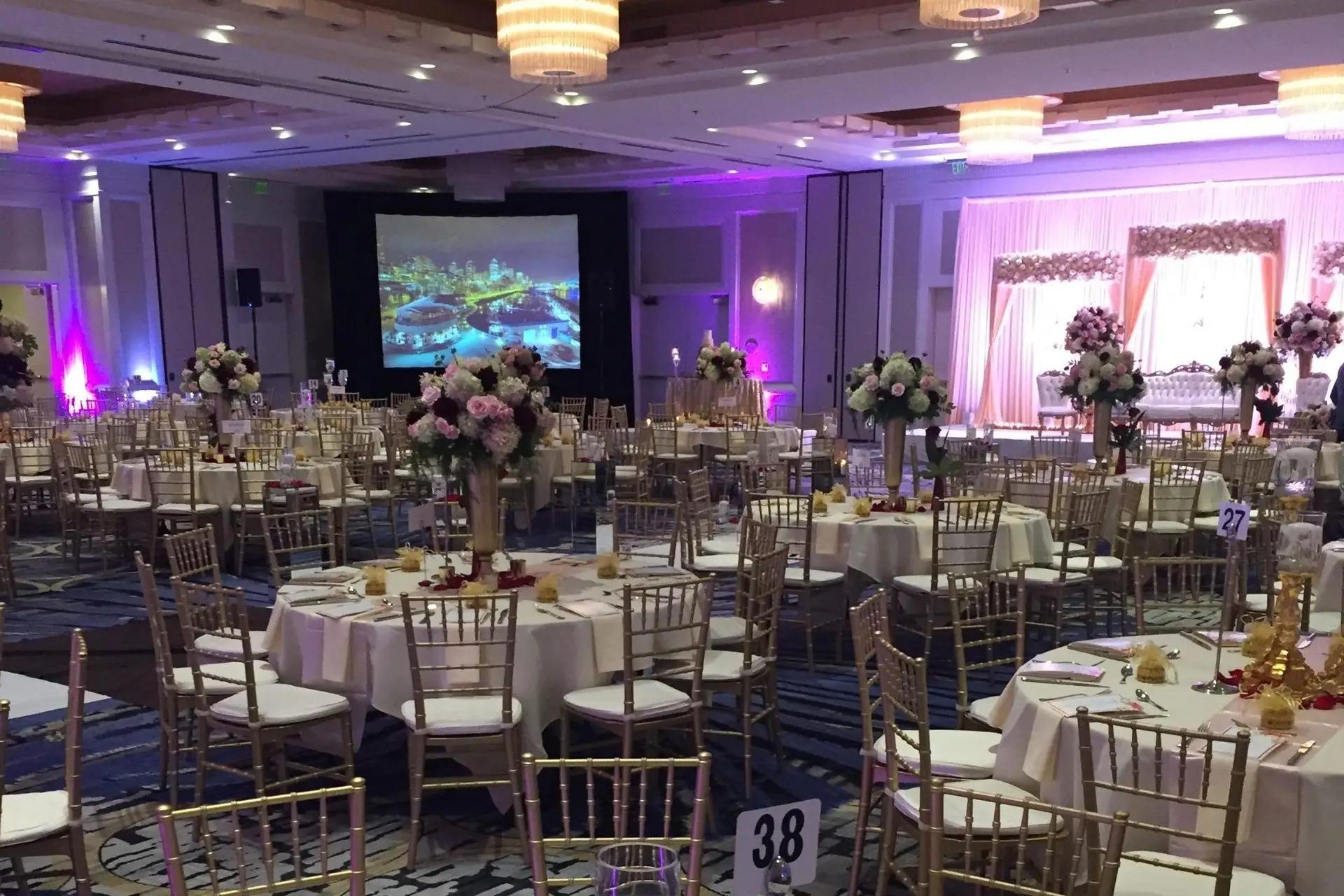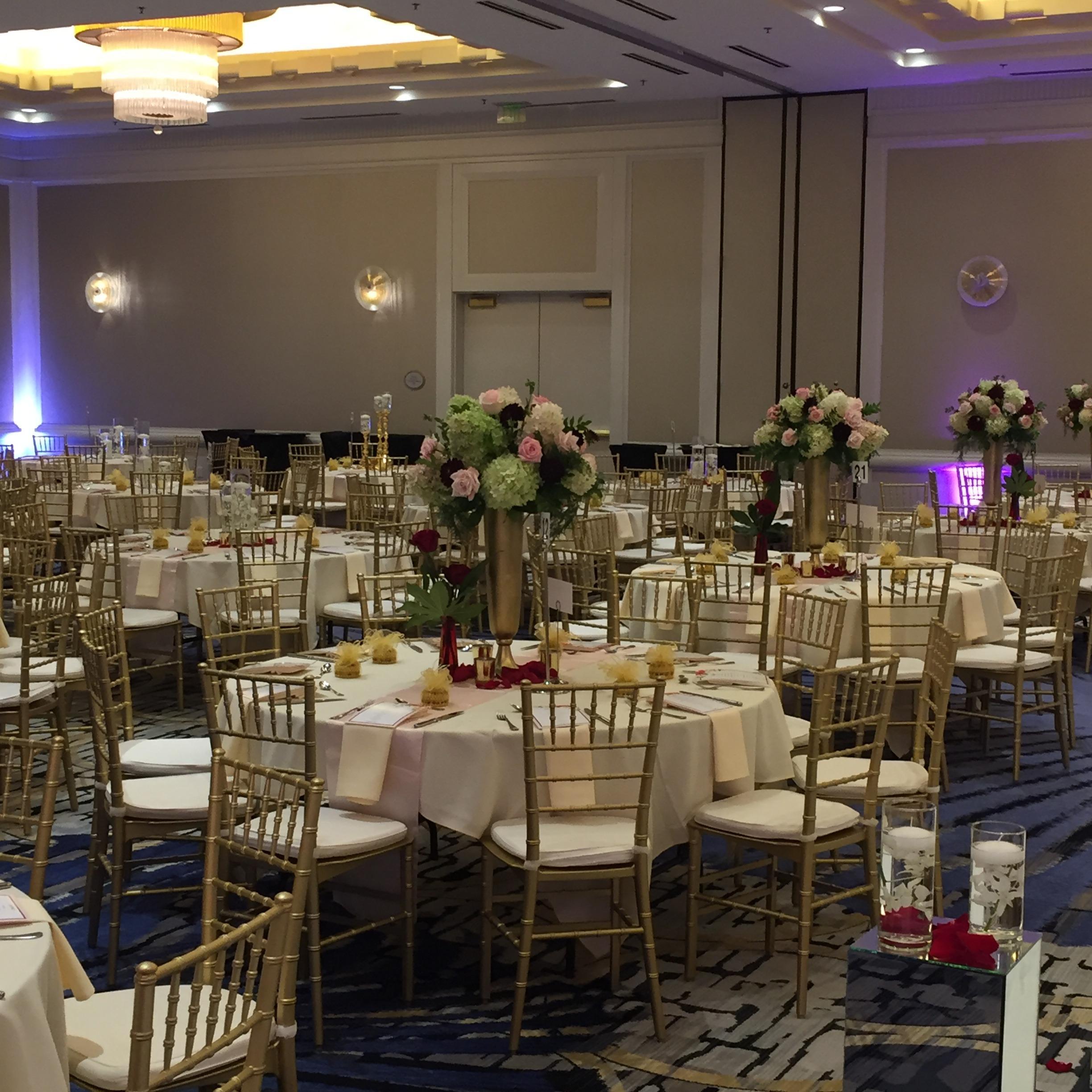 Marriott certified event manager, dedicated banquet manager, tables, chairs, staging, votive candles, in-house linens (choice of color), 2-hour venue rental, set up and breakdown, sound system with wireless microphone, discounted courtesy room block (up to 10 rooms)