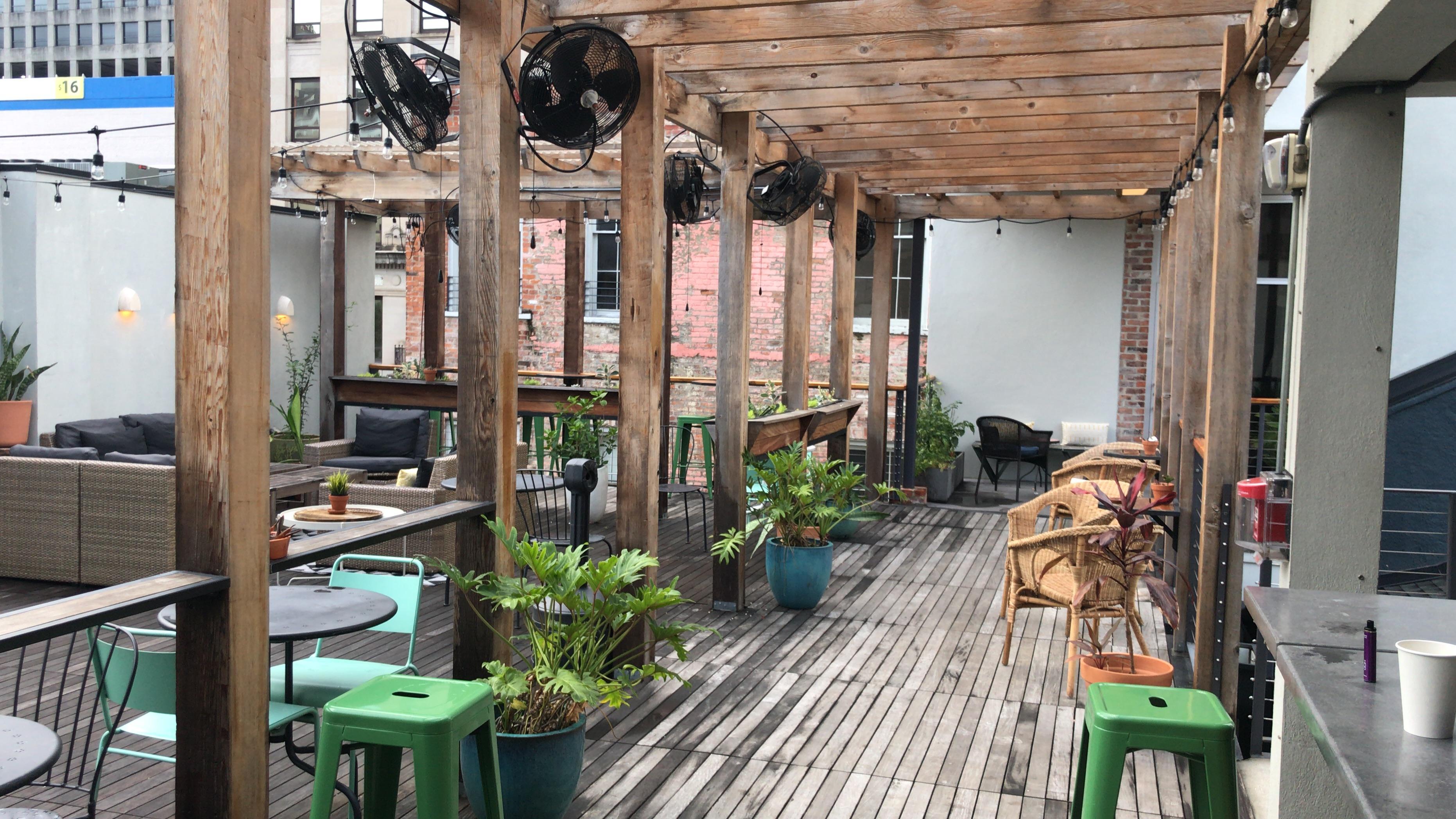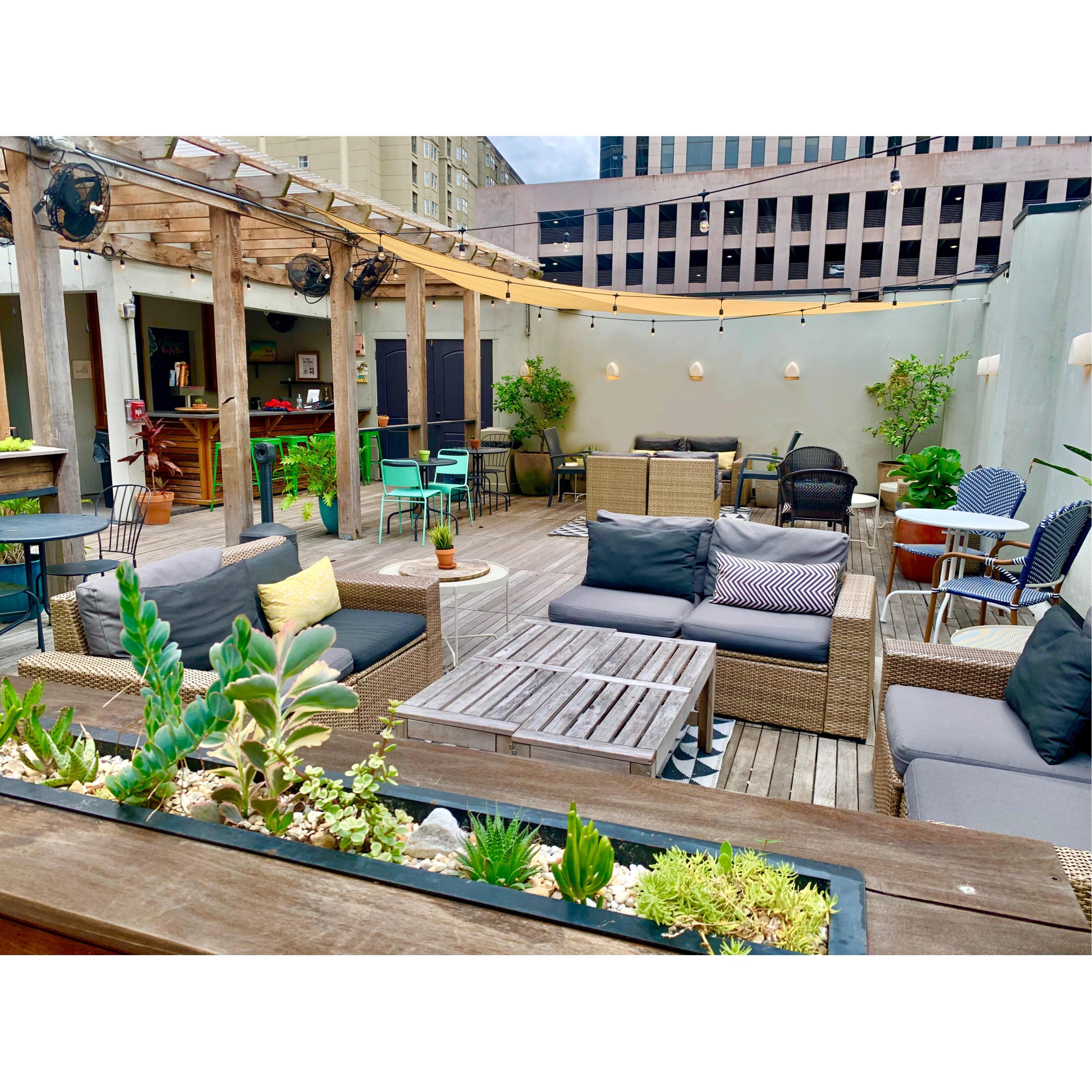 The Rooftop Terrace is located on the third story of our three-story restored Creole Townhouse. The Terrace features an Ipe wooden deck, wooden pergola, lounge furniture, large palms, and upward skyline views of New Orleans. The Terrace also has a full-service cocktail bar. The space is ideal for a lively cocktail party. It can hold a maximum of 75 people and can be used for a maximum of 4 hours with events ending by 10 pm.