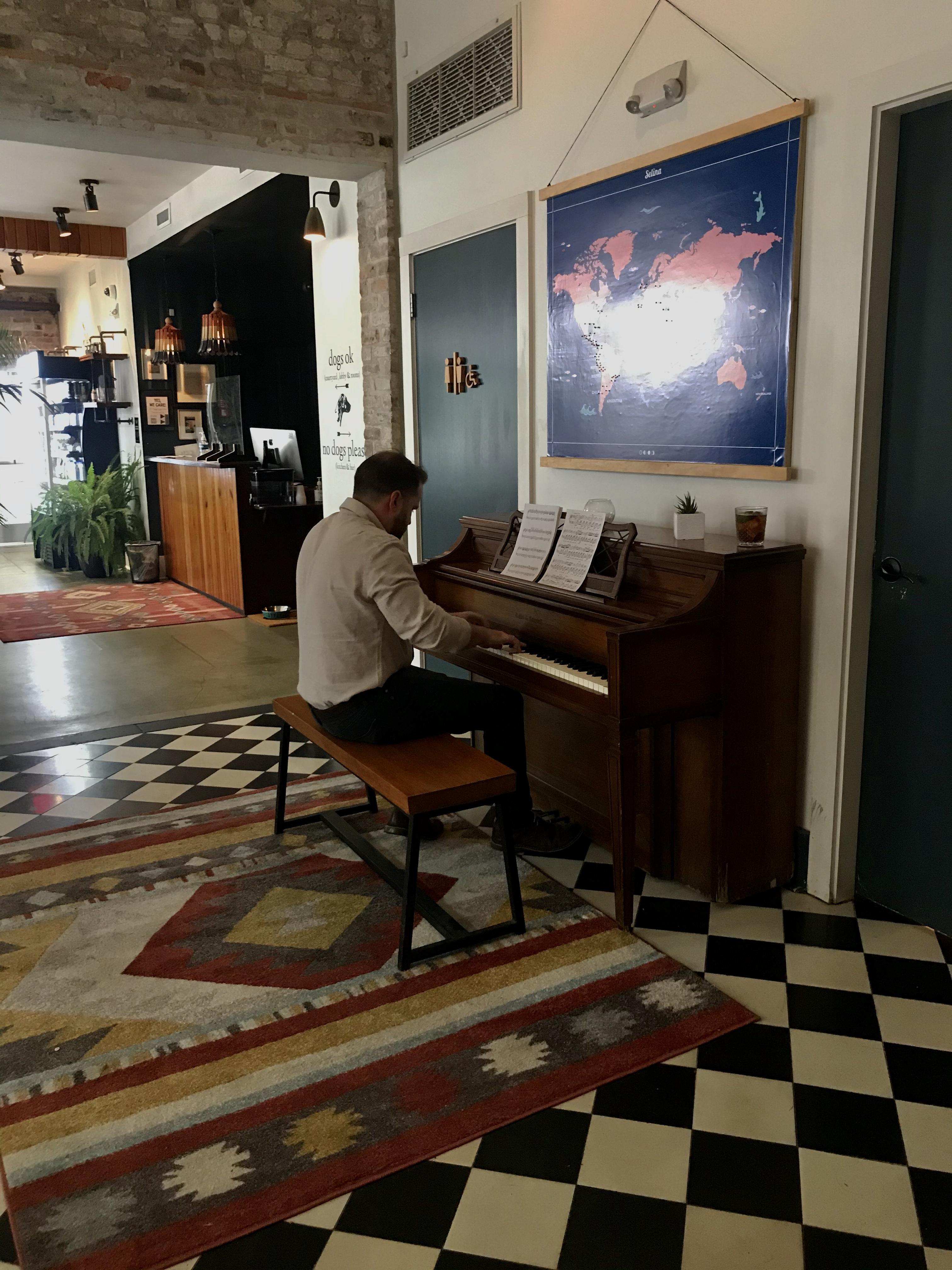 The Piscobar and lobby are located on the first story of our three-story restored Creole Townhouse. The Piscobar connects to the lobby and featured black and white checkered tile floors, Venetian plaster and exposed brick walls, and artwork by well-known local artists. A piano is available as well. The spaces together are ideal for a lively cocktail party or a medium-sized seated dinner.