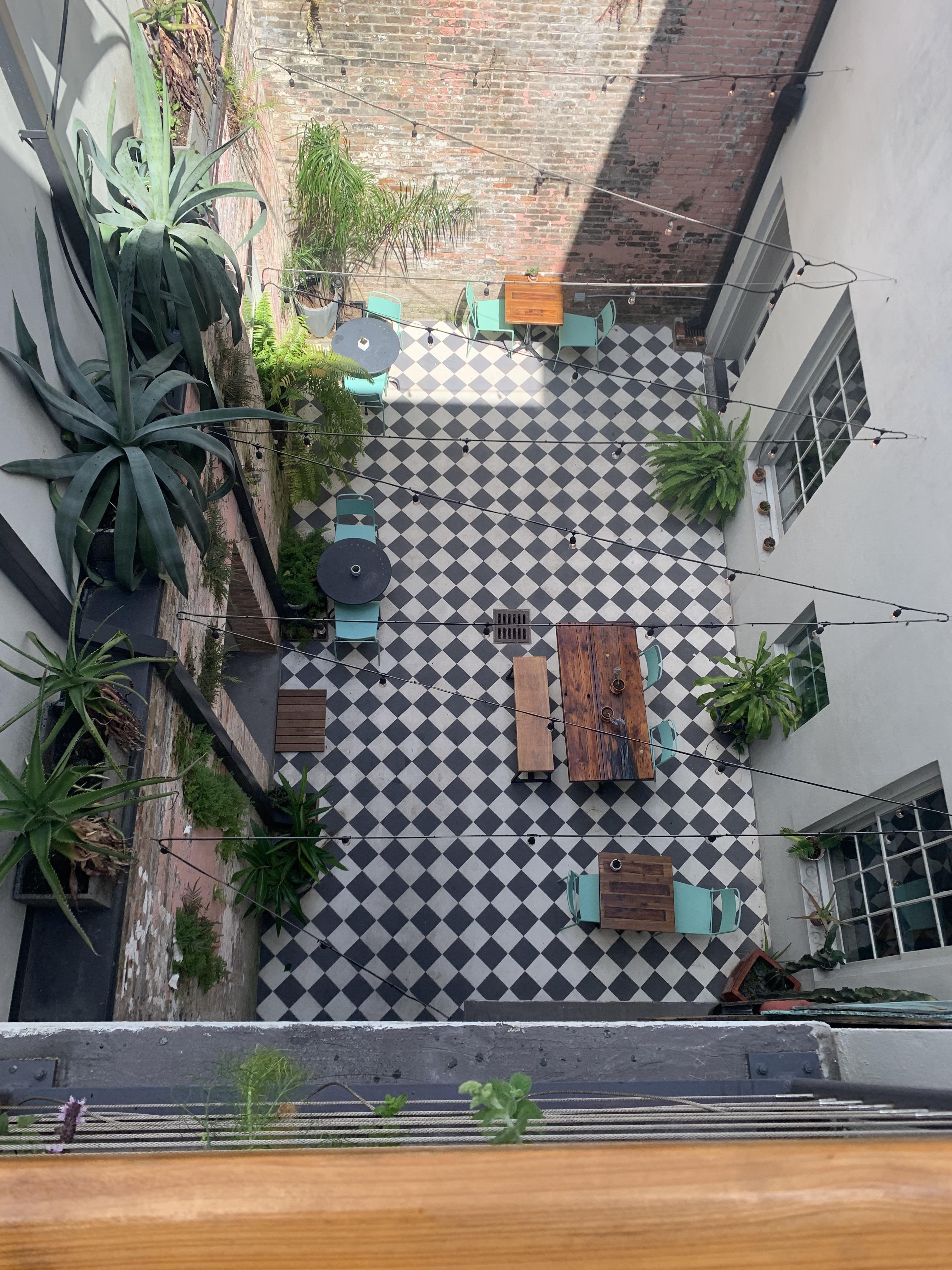 A wonderfully decorated courtyard with checkered floors, brick walls, and great lighting.