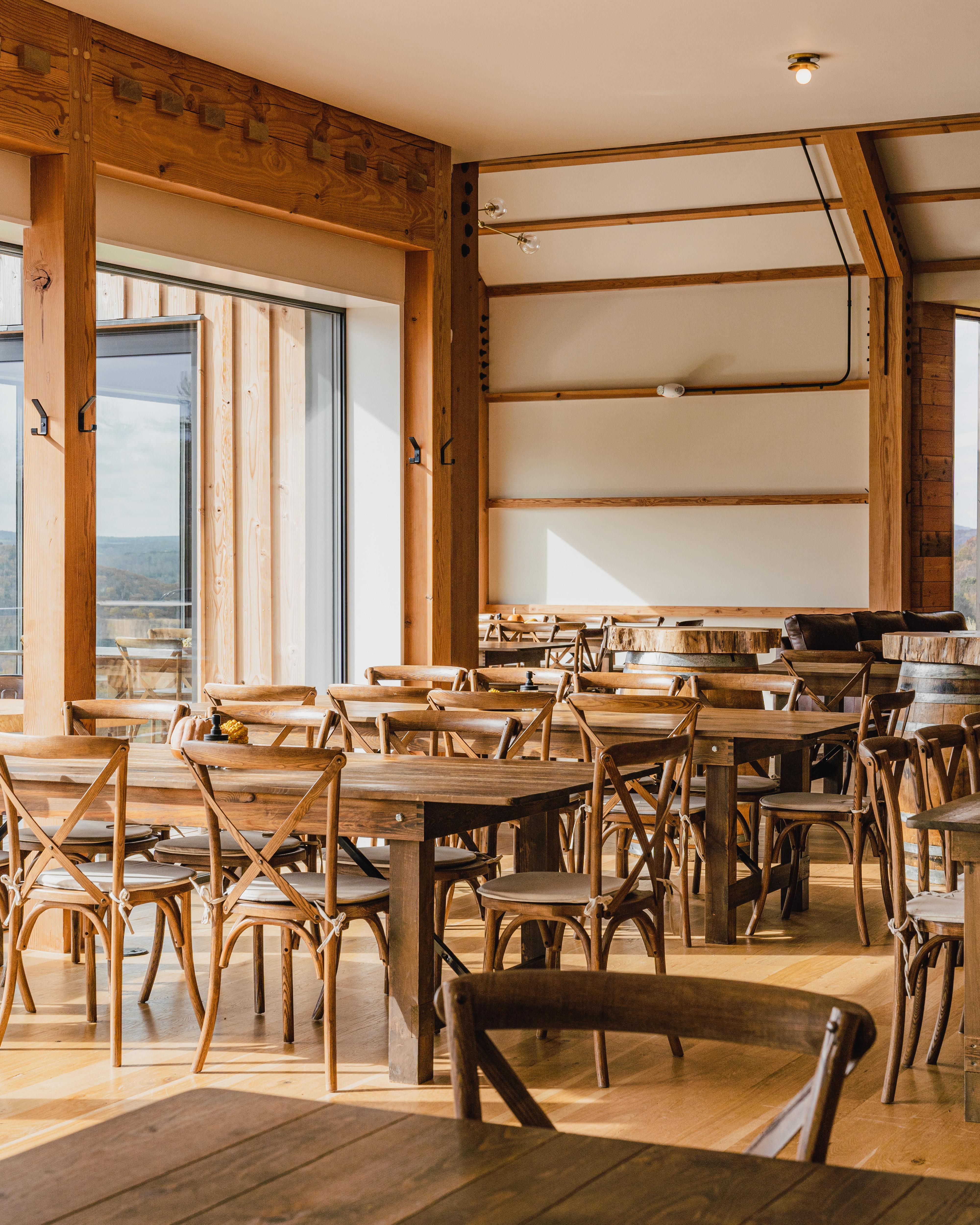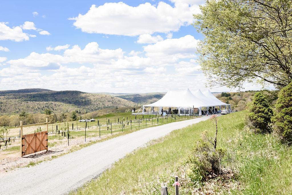 Overlooking the orchard, the cidery combines a ground-floor production facility with a top-floor tasting room and event space. You will have exclusive use of the tasting room during your event. In addition, a permanent tent can hold up to 250 guests for your reception. Whether you stage your event indoors or outdoors, you will have spectacular views of the Catskills and the Delaware River Valley.