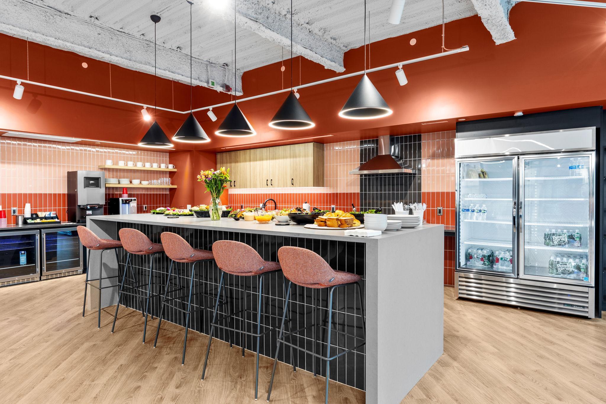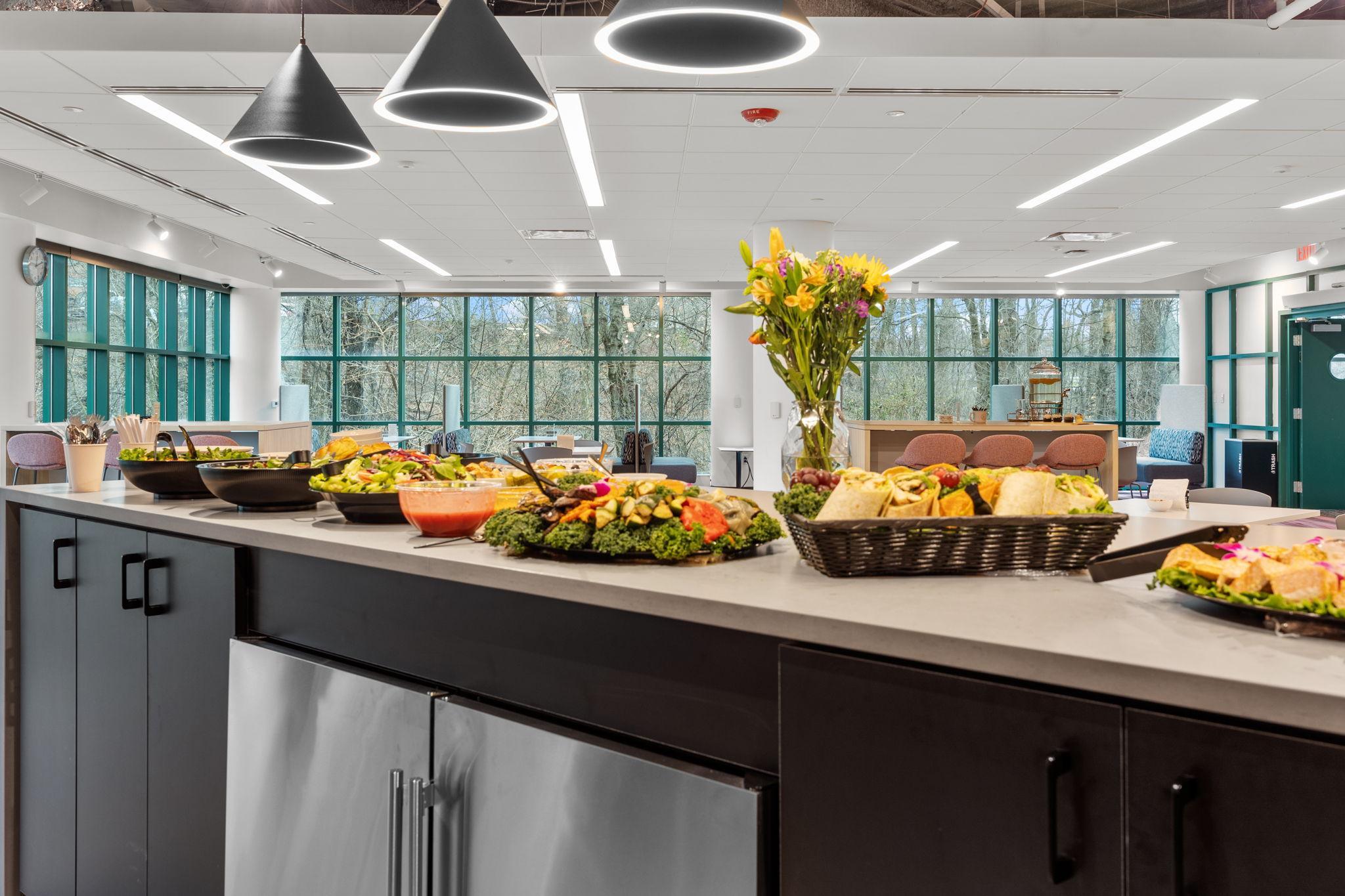 This room includes a TV screen, refrigerator, an large island for prep, two microwaves, a non-commercial oven to keep food warm (not for cooking), and freezer access.