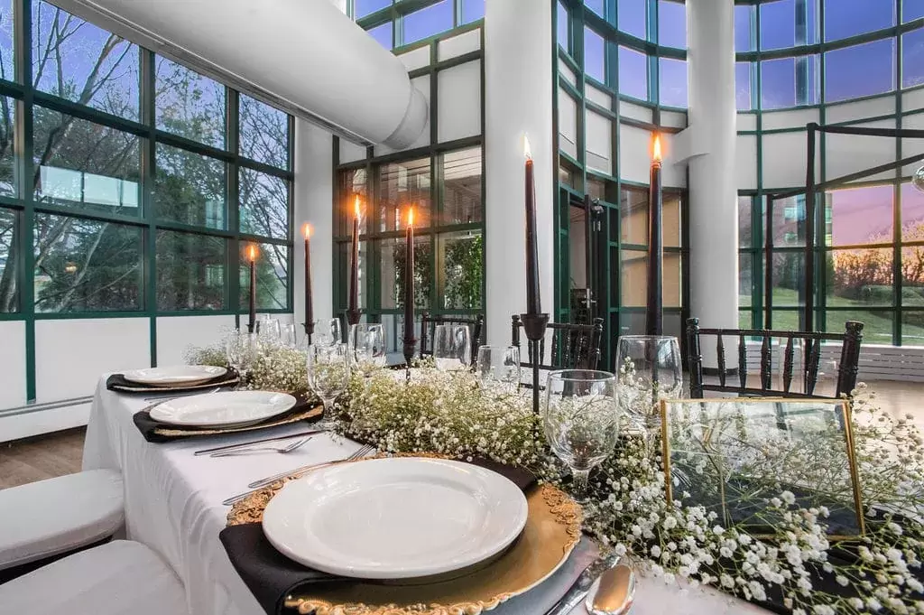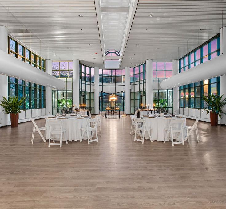 Located within Sentient Workspace, a prestigious event venue, the Solstice Room boasts a stunning & unique setting. Originally a bank, this space has been transformed into a stylish coworking concept and venue. The all-glass atrium provides a backdrop for both daytime and evening events, surrounded by lush trees & a tranquil creek. With a completely customizable layout, the Solstice Room is the perfect choice for weddings, bridal showers, & other social gatherings.