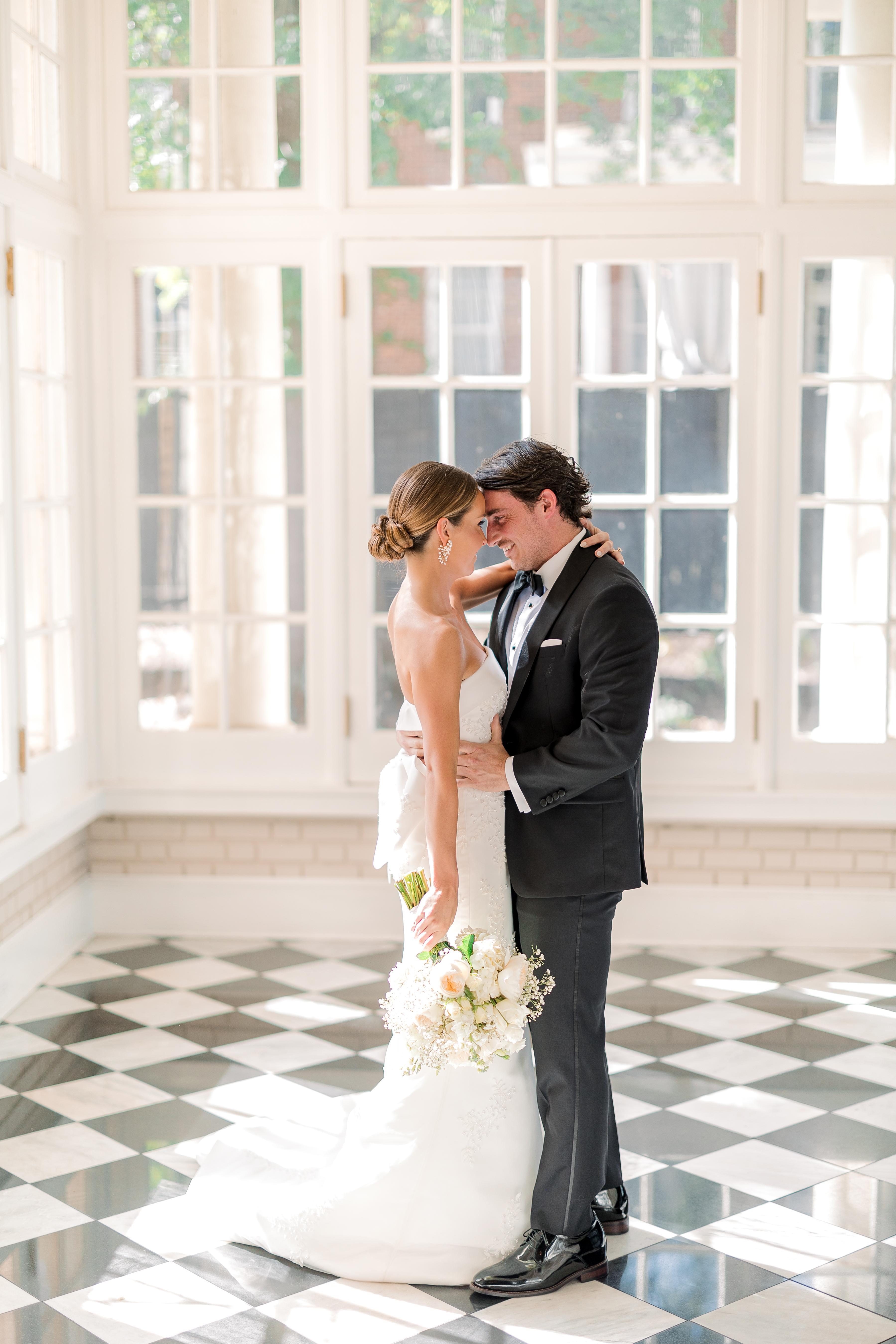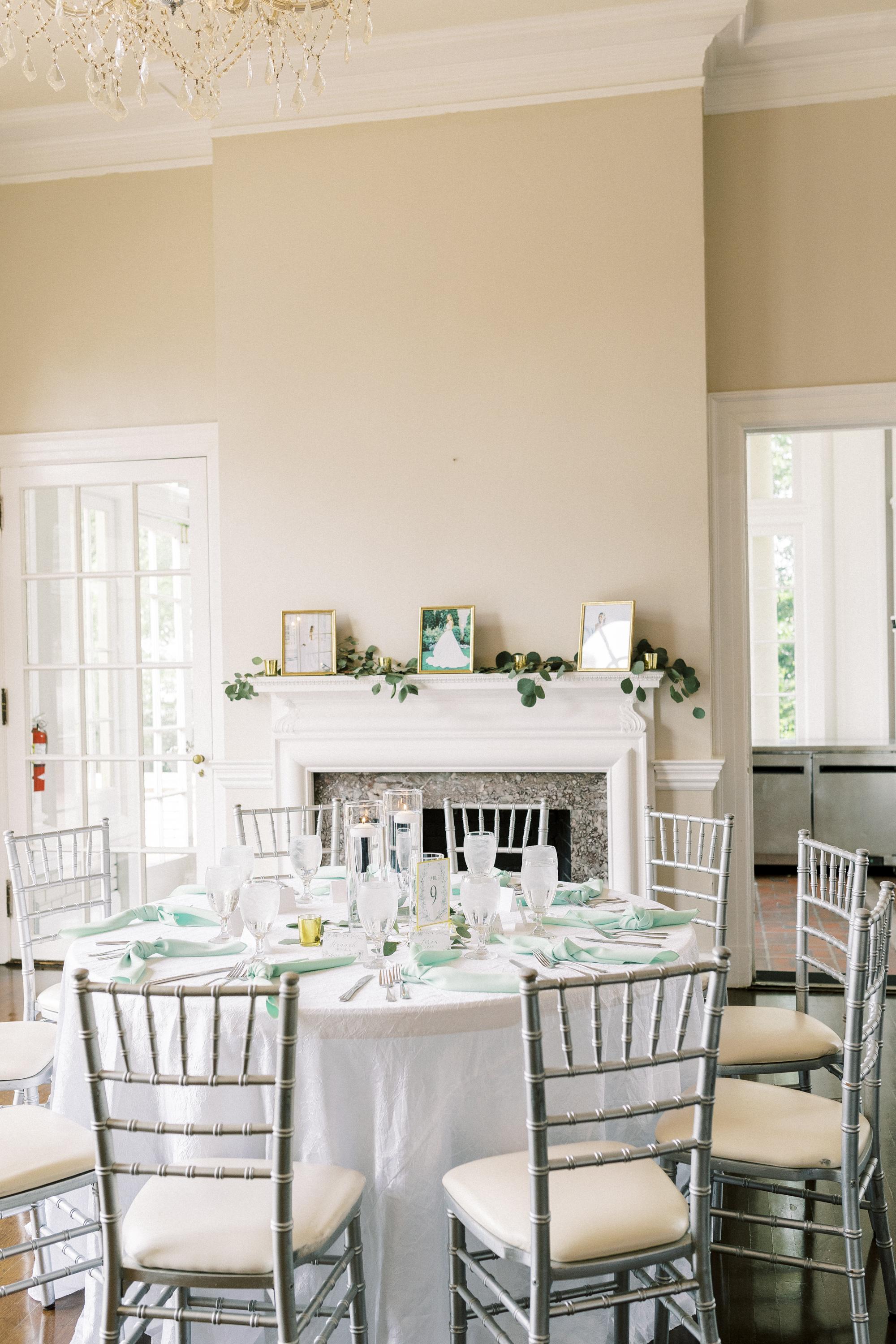 This stunning space is located right off of the Grand Ballroom and features three sets of historic French doors, black & white tiled floors, a fireplace and large windows to let in all the light. This spot is perfect for first looks and bridal portraits! Come time for reception, this makes the perfect space for a buffet set up and is conveniently set up to keep the line moving quickly.