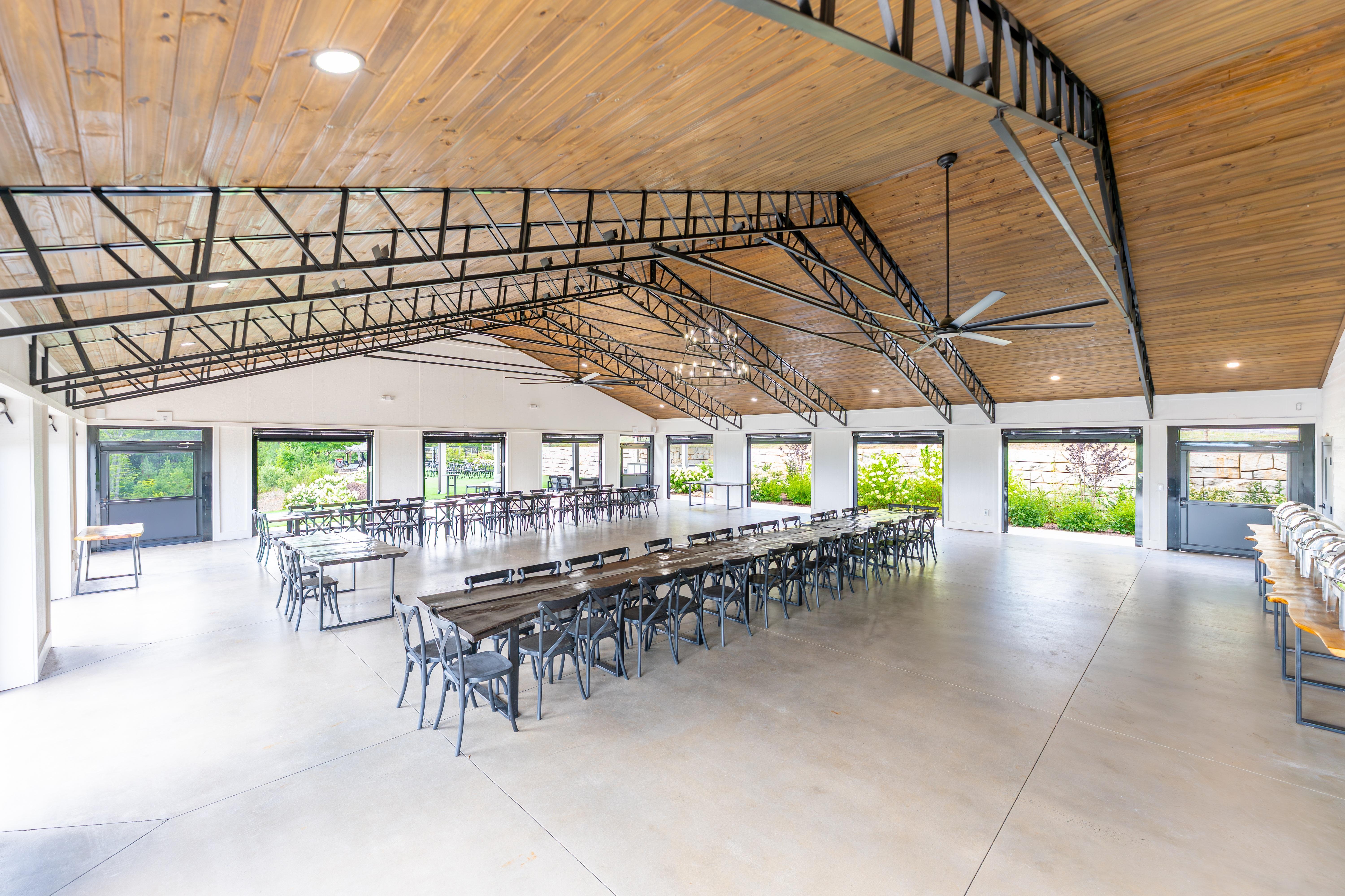 🪑 125 sleek black X-back chairs + handcrafted live-edge dining tables 🍽️ Plateware, flatware, glassware + chic black linen napkins 🎶 Built-in Sonos sound system to set the mood all evening 🌦️ Roll-down vinyl panels for a cozy vibe, rain or shine 🍸 Access to the adjacent Cocktail Lounge for mingling + happy hour