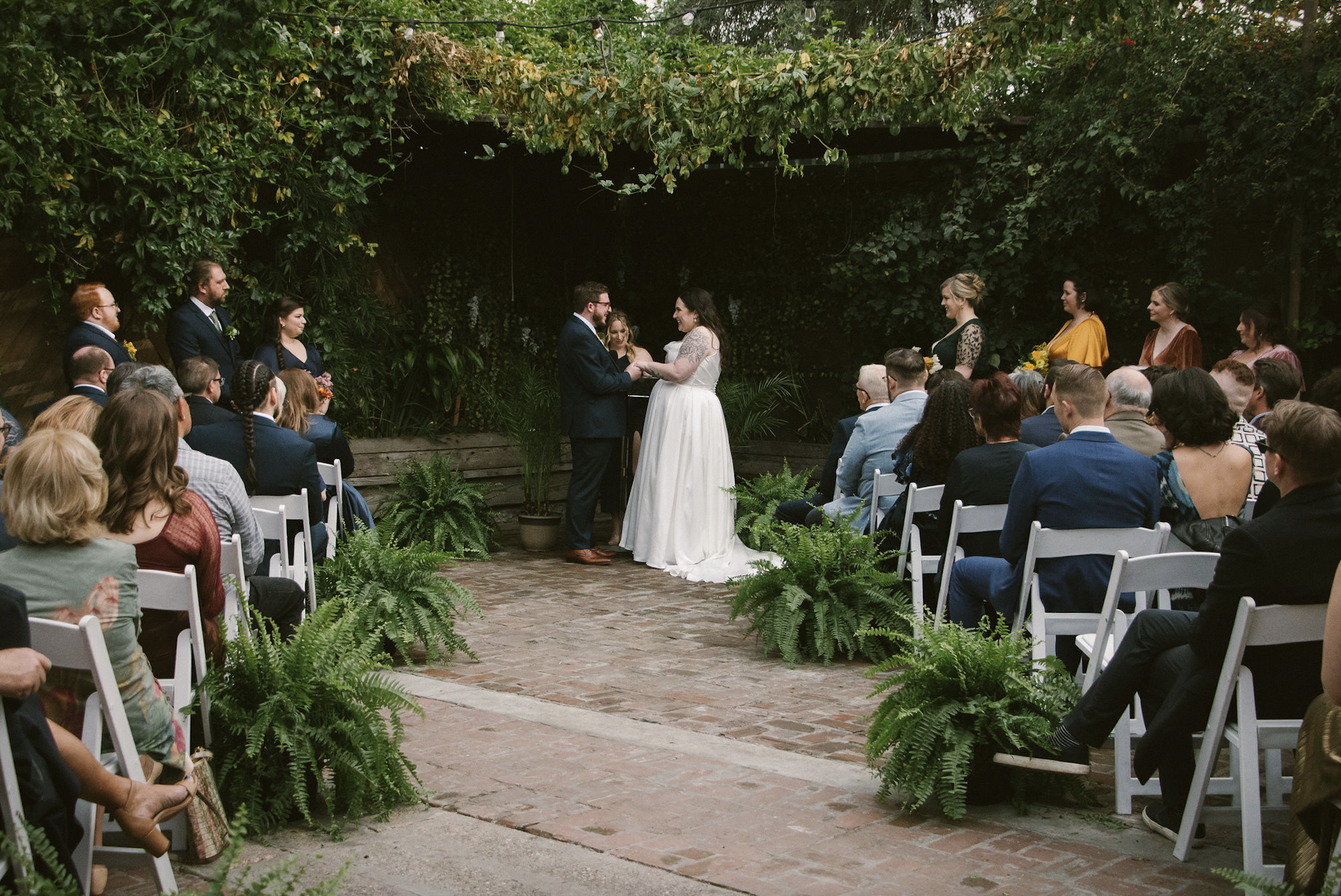 After a number of visits to potential wedding venues that just didn't feel right, my wife and I felt like a miracle had happened when we found Seventh Place. Seventh Place is a venue where you can truly execute your own vision, whatever it may be, while the space still brings a quality and characteristic that feels so unique to wedding venues. Having moved to Los Angeles from New York City, my wife and I were hoping to bring a bit of that Brooklyn energy to our wedding day, and the lovely brick interior and beautiful courtyard here absolutely helped deliver that. The space (and staff) was so flexible that it was easy to achieve exactly what we imagined for the big day, and our point person Lorraine was extremely helpful and communicative in the months and weeks leading up to our wedding. The interior is beautiful, with enough space for us to host 150 guests at large family-style tables (the wooden tables Seventh Place has are very very nice), and still have more than enough room for dancing and a cozy and comfy lounge area. Besides being the perfect setting for our ceremony, we hosted the dessert table and some more seating and cocktail tables outside in the courtyard, which has a lot of greenery all around and plenty of shade, making it easy to forget you are in DTLA. The hedge wall outside on the street also served as a great backdrop for our family photos (we put down some turf on the street). We are both so thrilled with how our wedding turned out, and the setting was a major factor in the success of the day. Seventh Place was an exceptional (and very well-priced!) venue with a wonderful team who made the process very easy for us. They also host a great preferred vendor open house which was a big help in wrapping our heads around the wedding planning process, and seeing the space in action! We can happily and confidently recommend Seventh Place as a venue for your big events!