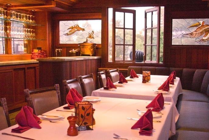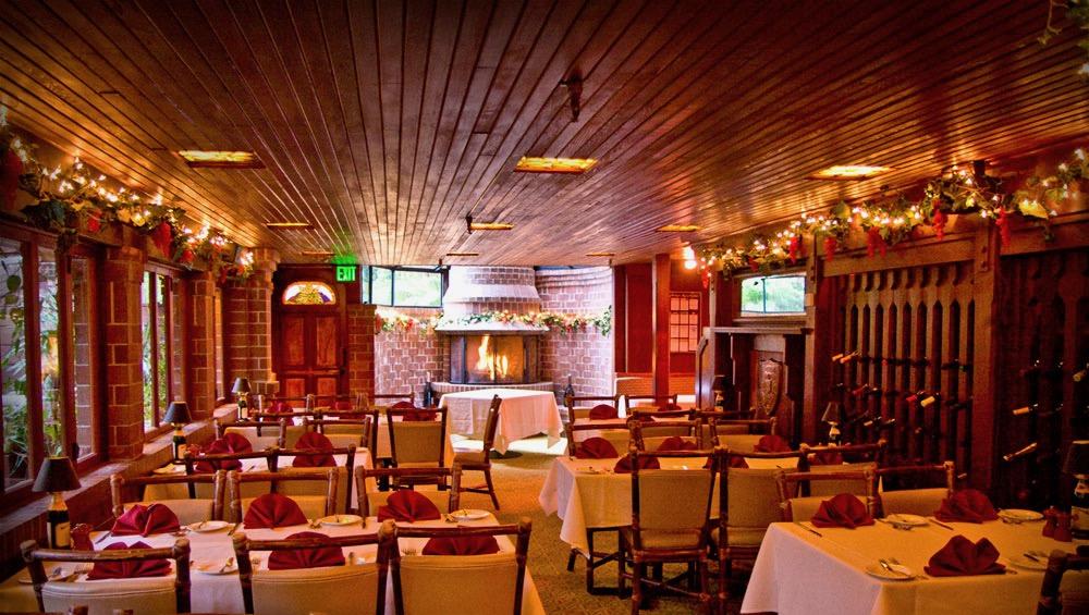 Greenhouse Room, which delights the senses with an abundance of plants and light. Windows along its entire length afford a view of the creek and open to let in fresh coastal breezes. Seats up to 60 guests on thirteen individual tables or one long table that seats 34-36 guests. It is set near the bank of Soquel Creek and opens onto our creek side brick patio. There are large windows running the length of the dining room giving the experience of dining at waters edge. The Wine Cellar seats up to 44 guests on nine individual tables or one long table that seats 20-22 guests. It is a delightful setting for private parties. Once used as the restaurant’s original wine cellar. Though now it’s cozy with a corner fireplace, rich redwood and old world brick craftsmanship plus hundreds of wine bottles nested in storage. It is a perfect setting for larger, yet intimate parties.