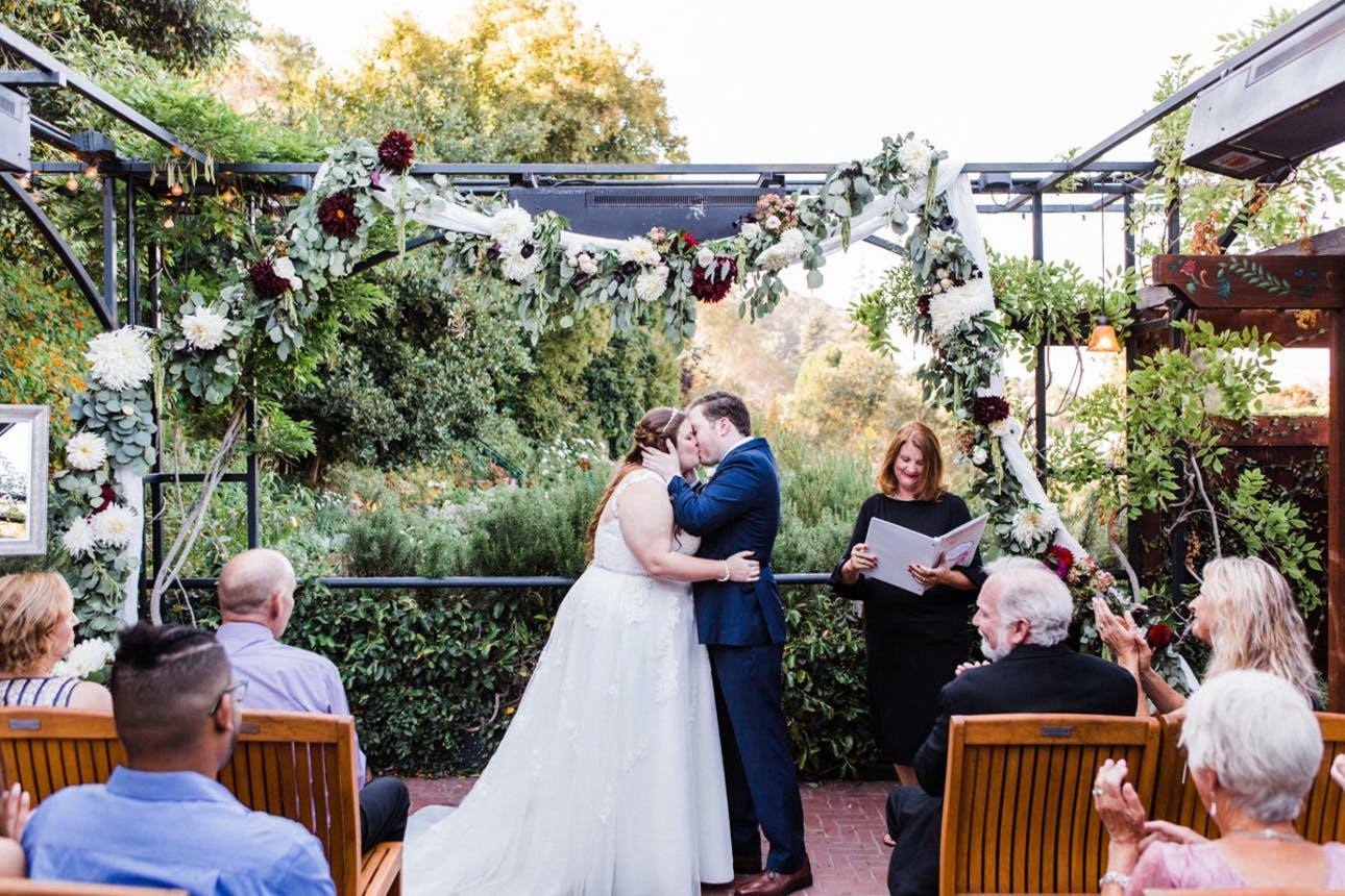 The Rock Room Lounge serves as our indoor location. Its beautiful rock wall and large bay windows look up at the garden terrace. There is seating for 60 guests and standing room for the remaining guests for up to 100. This room is not available for evening weddings. Our Creekside Patio sits right alongside the Soquel Creek and can hold up to 100 guests for a ceremony (8 chairs available for seating). The Redwood Patio can hold up to 26 guests and is joined with the Redwood Room; it overlooks the Chef’s Herb Garden and is fully heated.