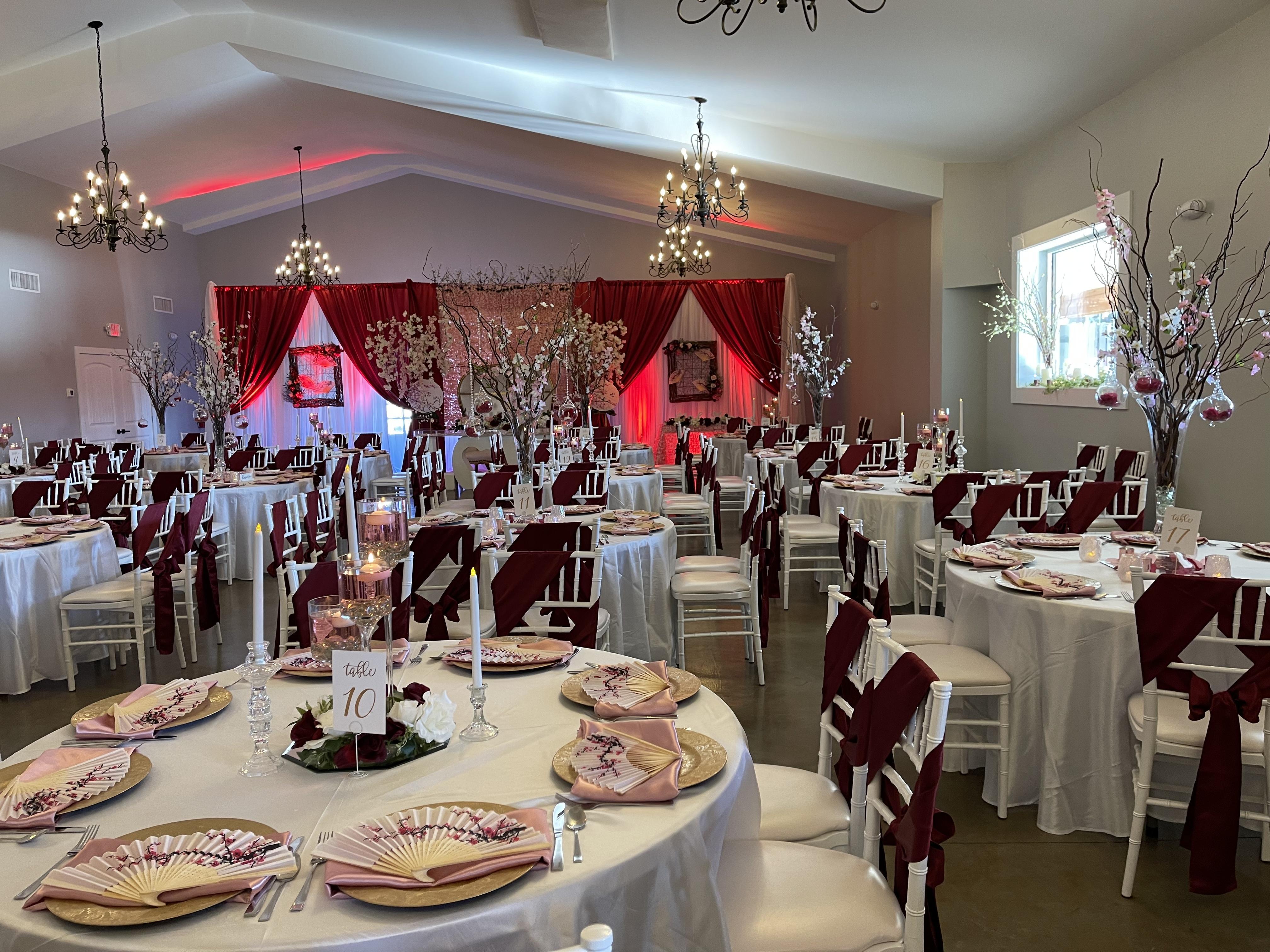 RSF includes tables, ceremony chairs, reception chairs, linens, napkins, chargers, china, flatware, glassware, bar, over 3000 decor items.