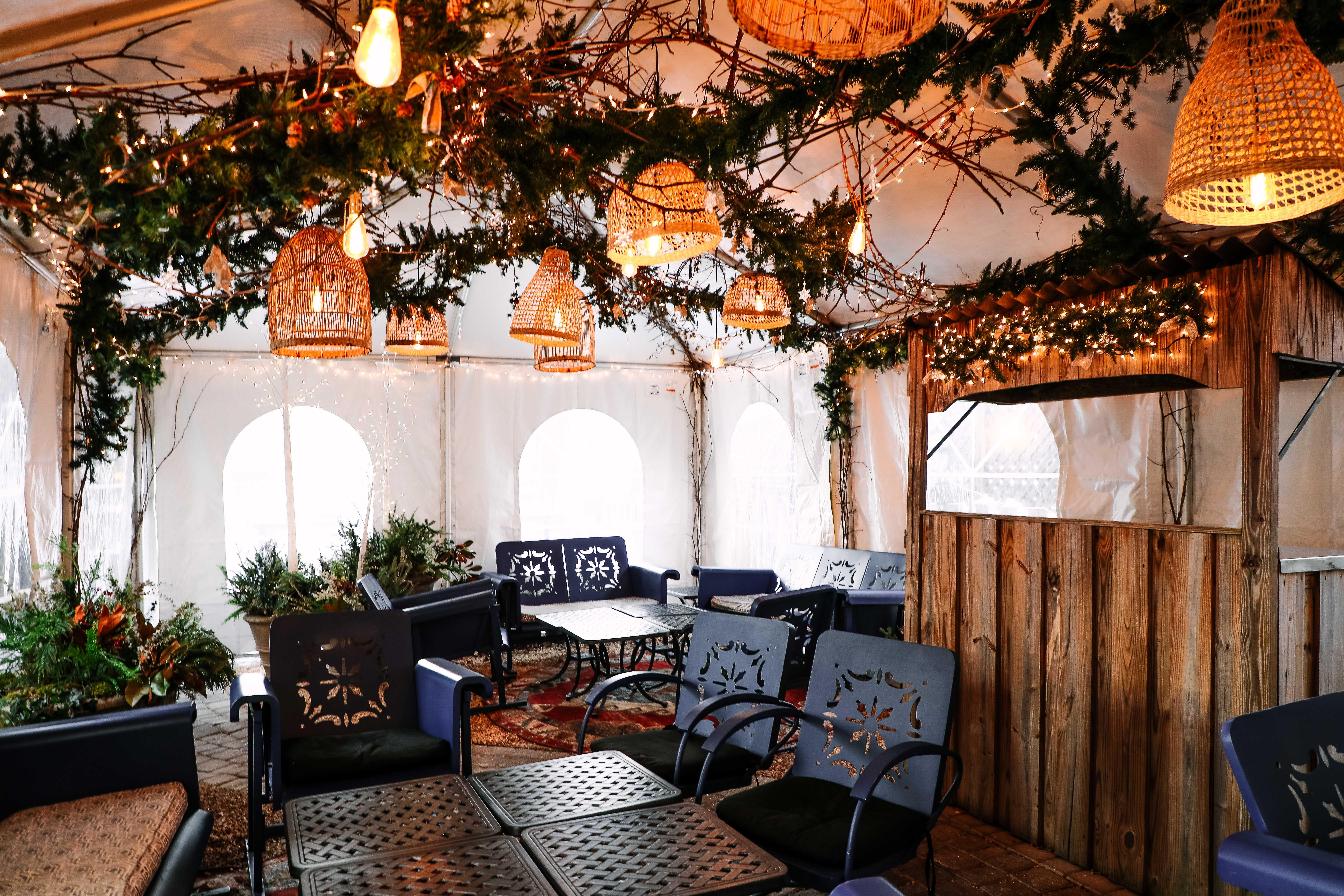 Our heated and covered winter space offers two heated tents with thermostats and can seat up to 45 guests. In milder weather, the sides can be opened. The bocce court is included.