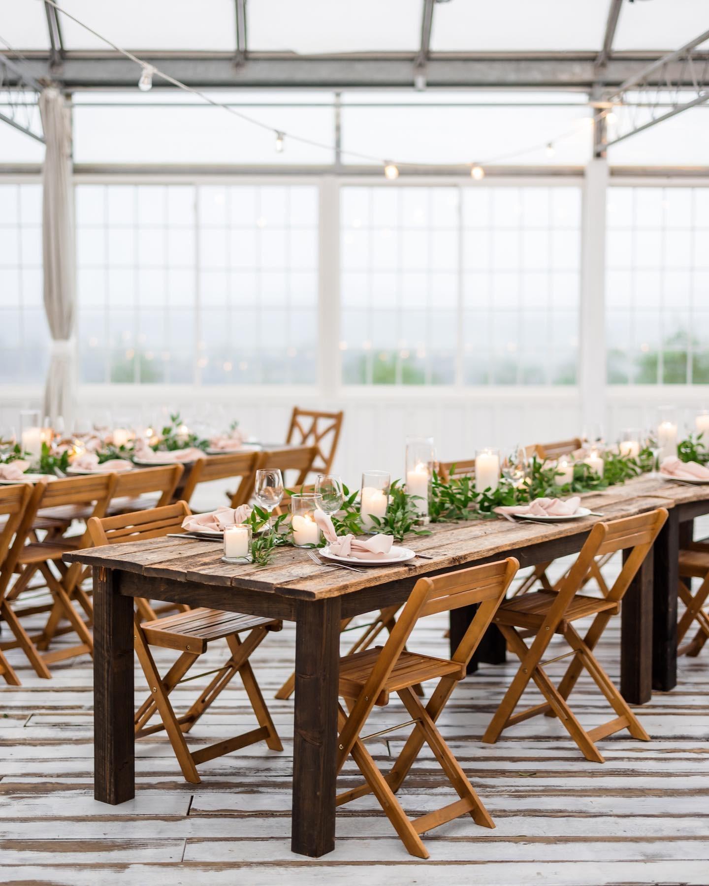 Showalter’s was one of two venues on our short list, and we’re very glad we decided to go with them. We wanted a mountain view during the ceremony and the terrace was absolutely perfect. The greenhouse is gorgeous and looks amazing both in person and in photographs and was the perfect backdrop. We served cider and apple cider donuts and our guests loved both. It felt so unique and special! Working with everyone at the venue was incredibly easy, and they were so kind and welcoming to us and felt like they really wanted to make sure our day went well. We booked all of the AirBnBs on the property and would definitely recommend doing so. The “bridal” suite off of the Greenhouse was great for staging and getting a moment away during the wedding, having the extra space for actually getting ready was a very good choice (especially with larger wedding parties and lots of people doing hair and makeup). We also stayed in one of the AirBnBs the night before and afterwards, and being on the property was incredibly convenient as hotels in Harrisonburg are a bit of a hike. The AirBnBs were cute and worked great for our purposes! We stayed in one of the AirBnBs through to the Monday after our Saturday wedding which was great and made it so that we didn’t have to rush getting everything out the morning after the wedding. Photos by Abby Carissimo.