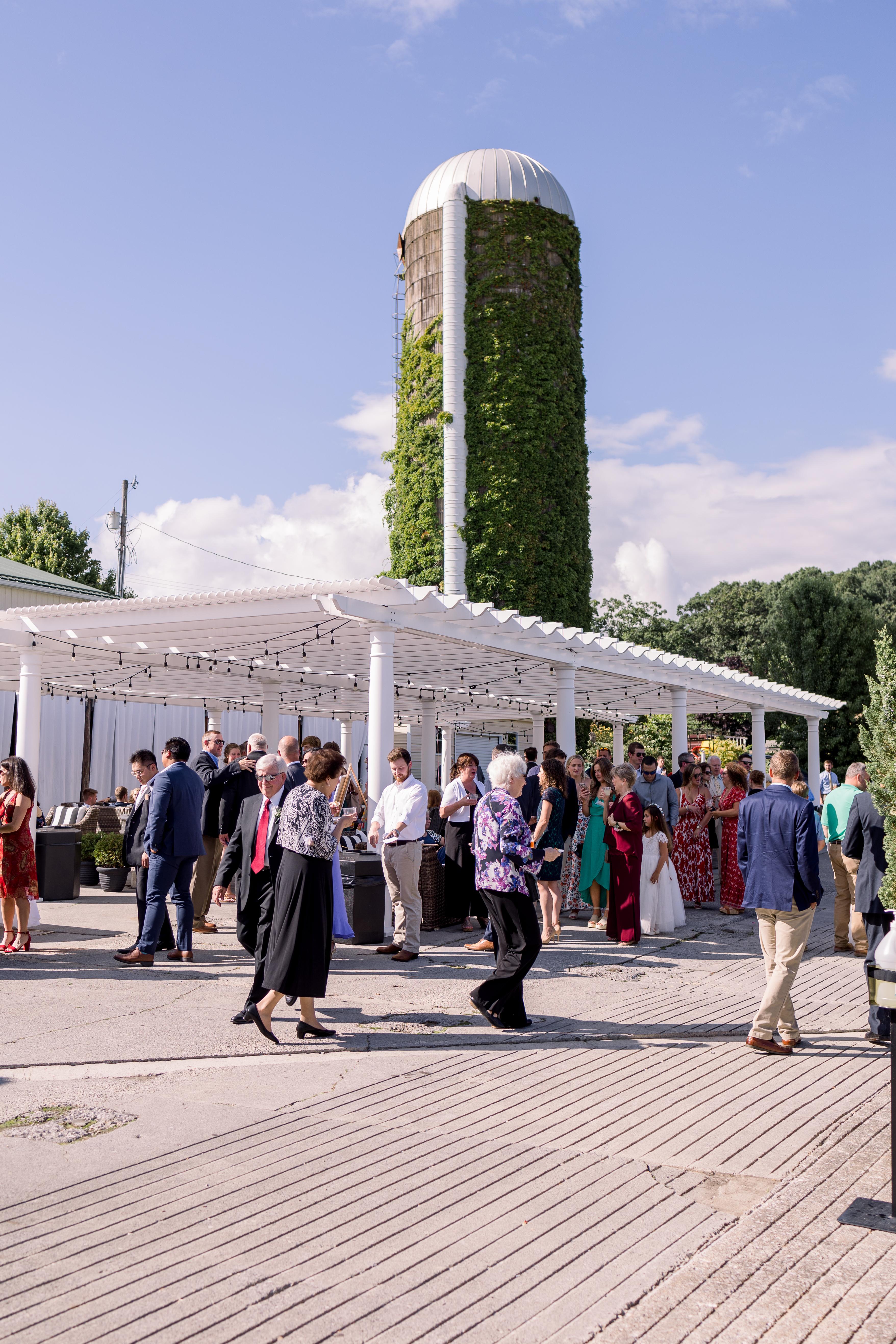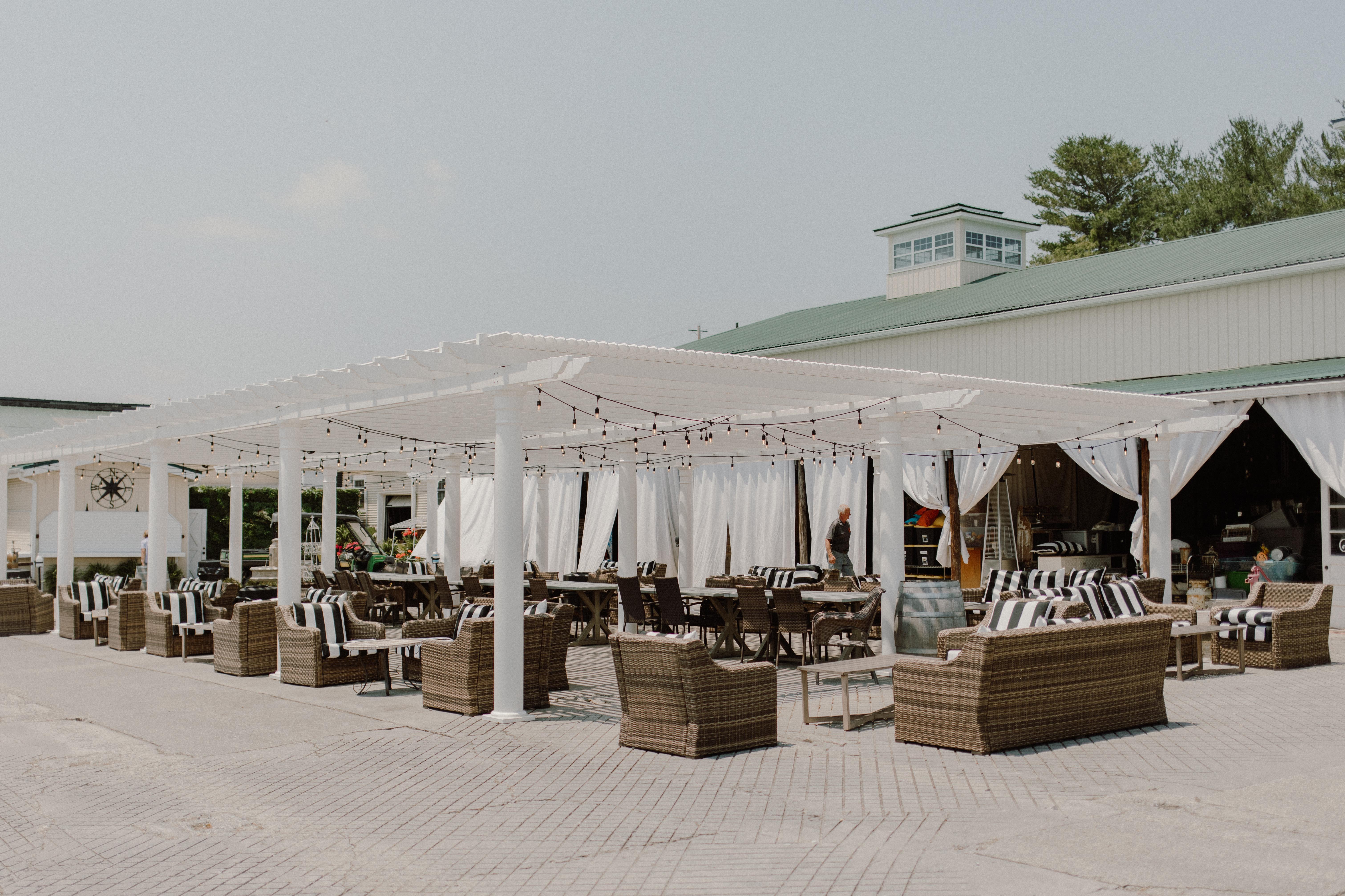 Adjoining our barns, the terrace that can host hundreds. An expansive white pergola invites guests to socialize and celebrate al fresco in this outdoor wedding venue space. Our Tuscan Terrace is an ideal location for cocktail hour, where your family and friends can look out on the lush natural landscape while enjoying libations. To the south, the barn doors open onto a beautifully manicured lawn with a firepit which can also host a seated farm-to-table meal.