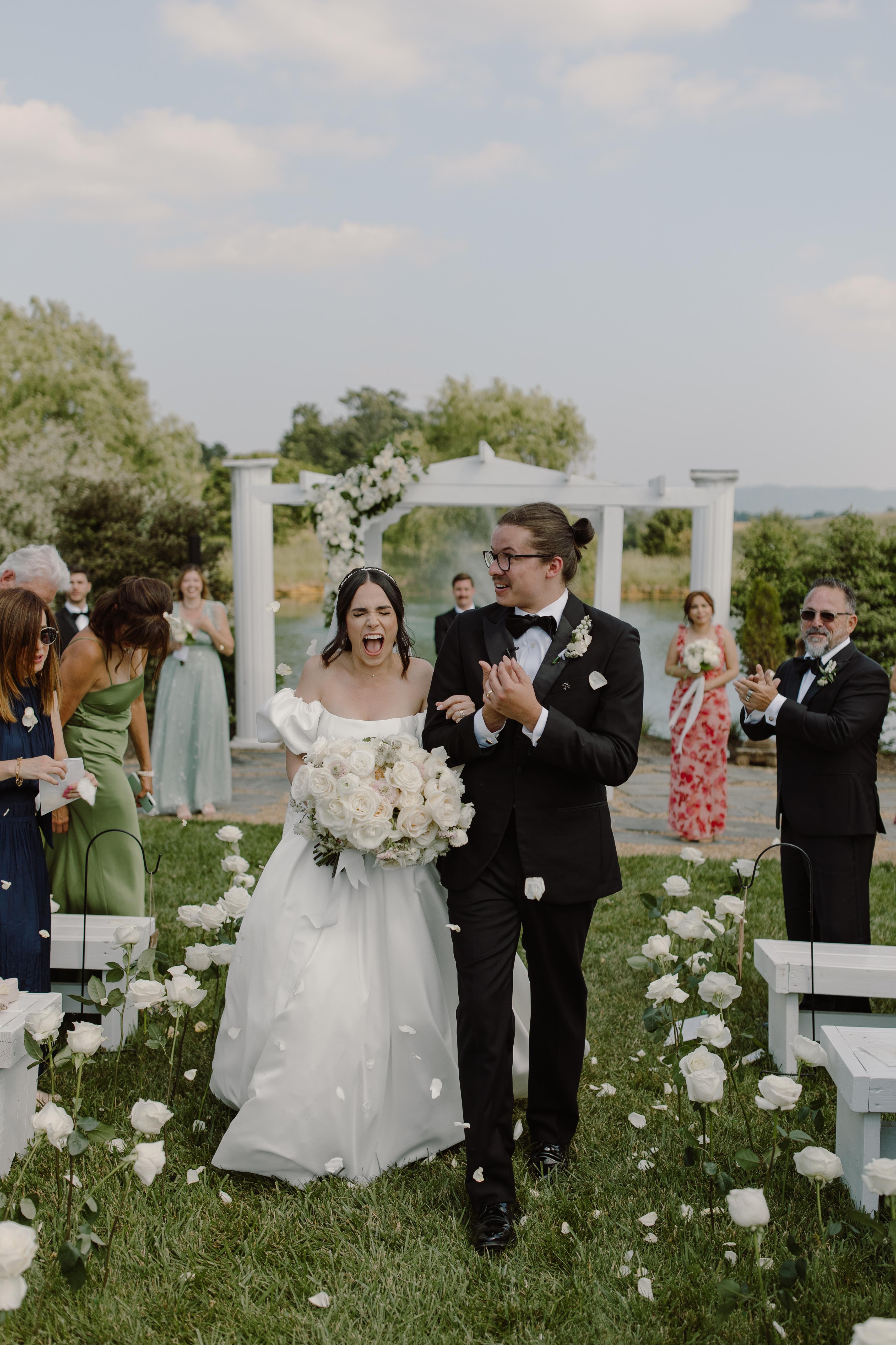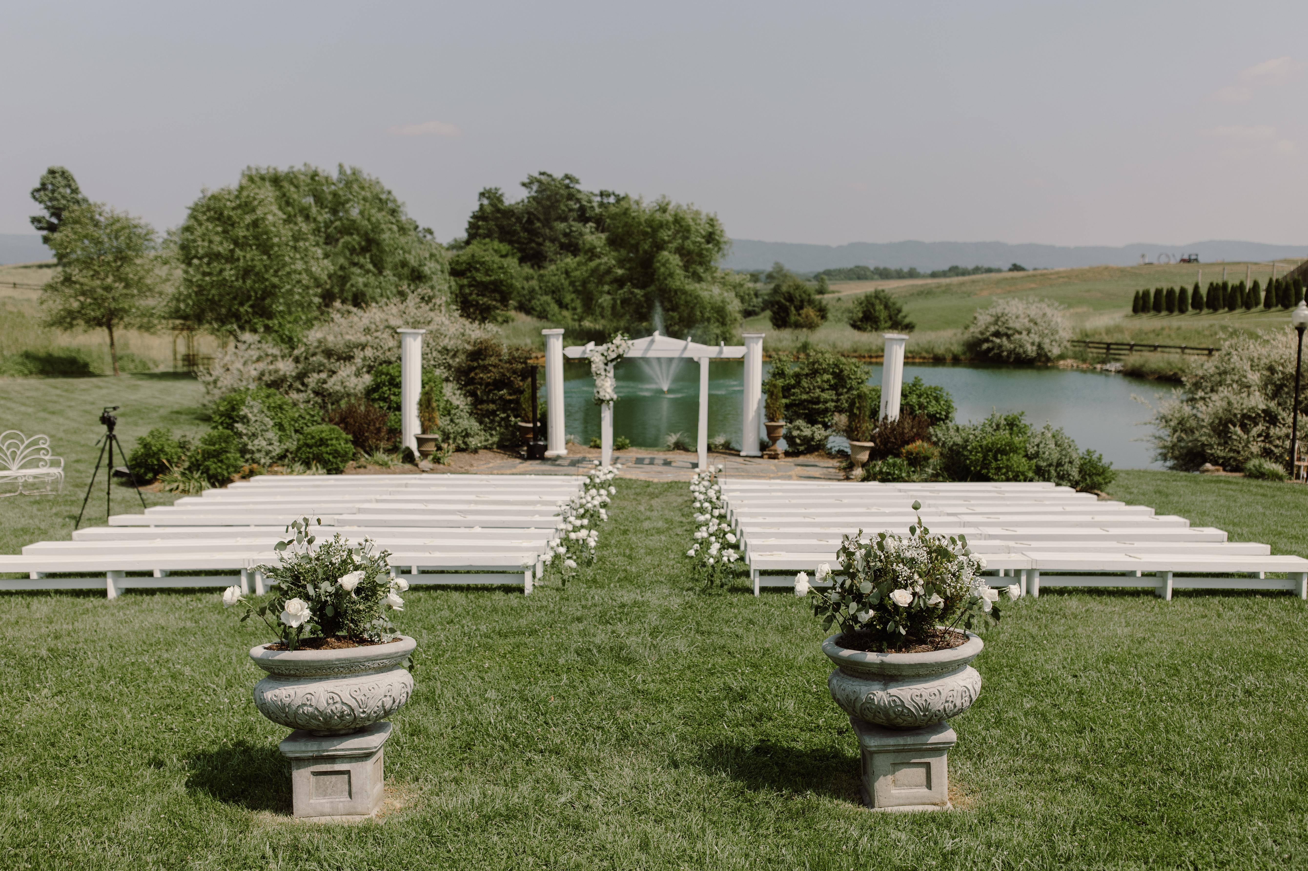 Set on five acres of lush gardens, our outdoor ceremony site features majestic pillars, a glittering pond, a trickling creek, and rustic bridge. The wildflower beds change color with the seasons. White, hand-made benches can accommodate well over 250 guests. Vows are exchanged on a Virginia bluestone terrace backed by rolling hills, green pastures, floating white ducks, and crystal clear skies.