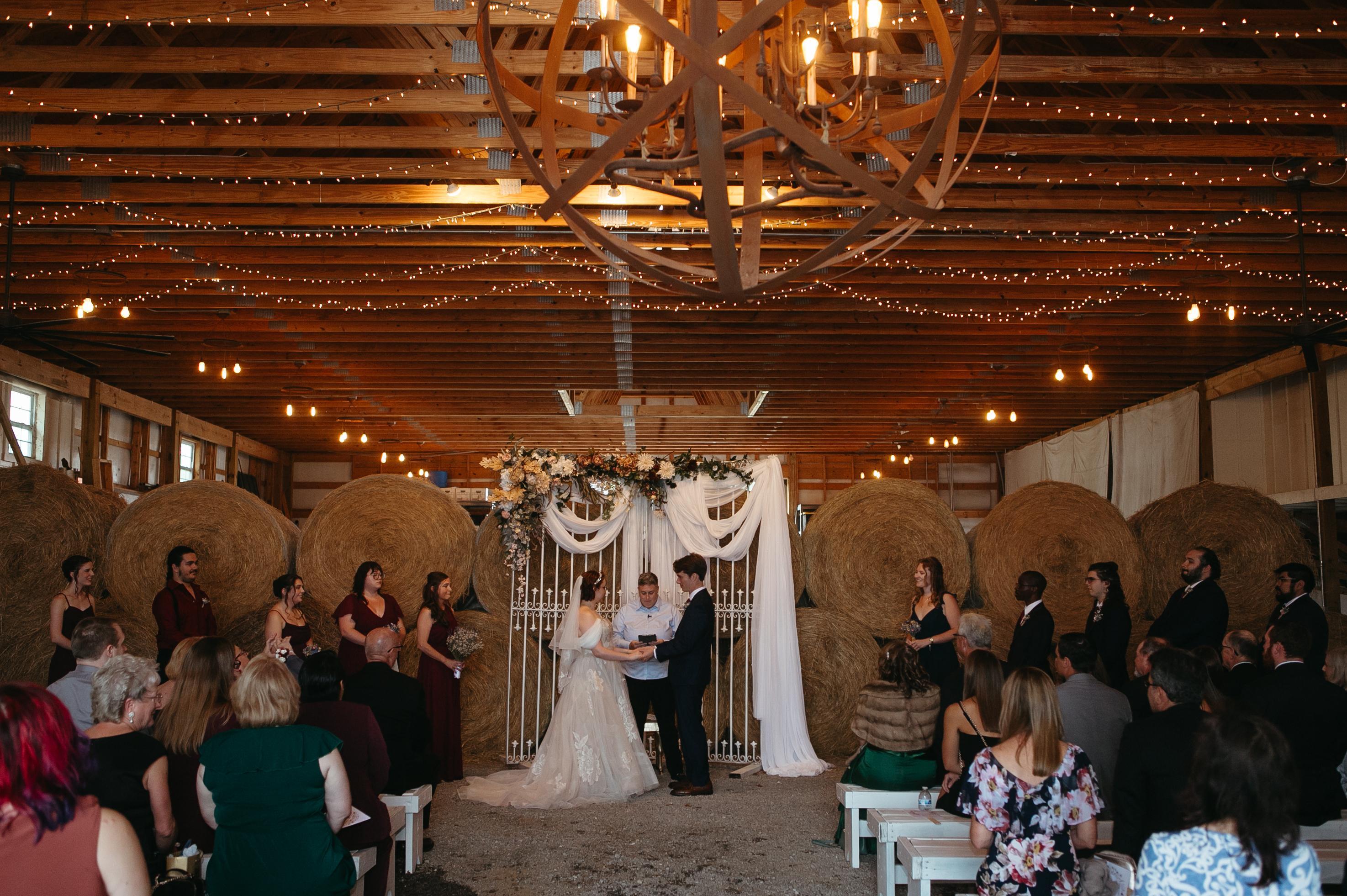 Should the weather change on your special day, our rustic Rain Barn can accommodate up to 250 guests. Your vows will be exchanged among hay bales and a iron sphere chandelier under warm and natural light.