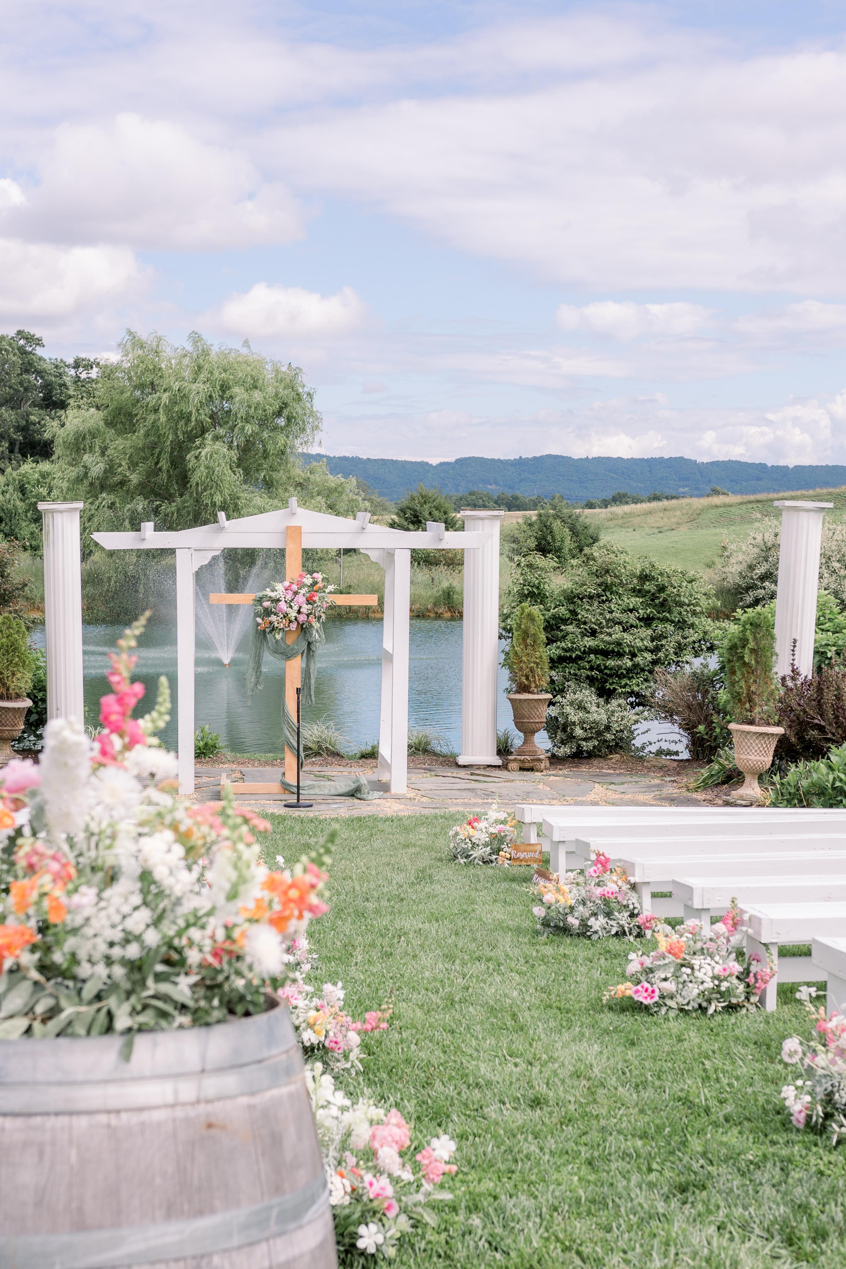 - Handmade wooden benches - Landscaping and florals - White arbor and pillars - Wedding bell