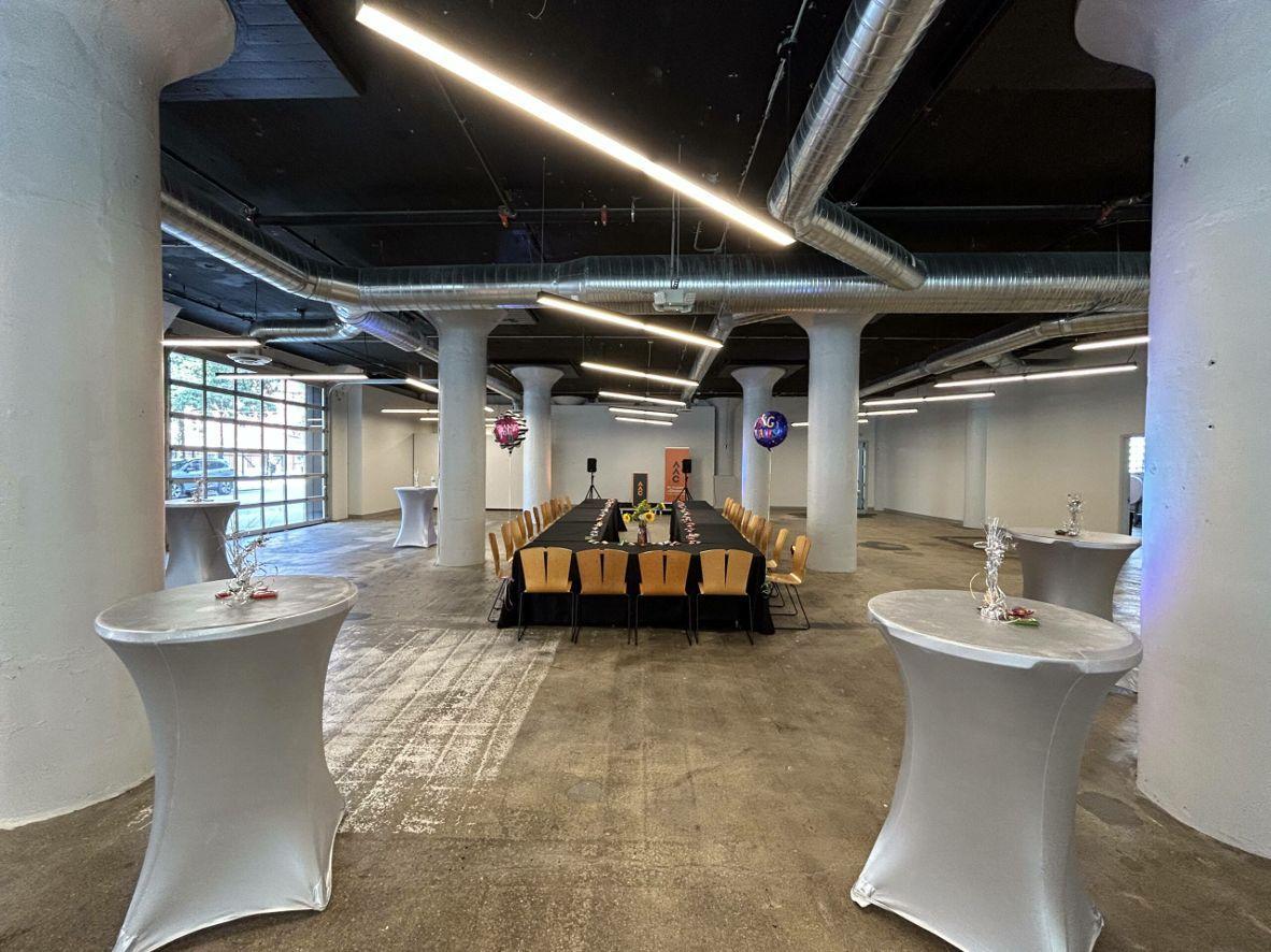 Features stunning windows, two operational glass garage doors, five movable walls, a private entrance, catering space, two gender-neutral restrooms, and is fully ADA accessible.