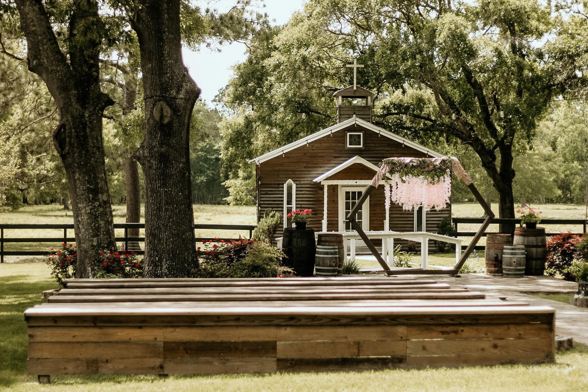 SJP Ranch is a tranquil rustic venue located in Cleveland, Texas. Our venue mimics an old western town and sits on 15 beautiful country acres. The venue is 4500 square feet and can accommodate up to 175 guests. There are endless photo opportunities for you to choose from for your memorable day, such as the half-acre pond with a fountain water feature or our Chapel facade surrounded by wide open pastures with roaming horses and Longhorns.