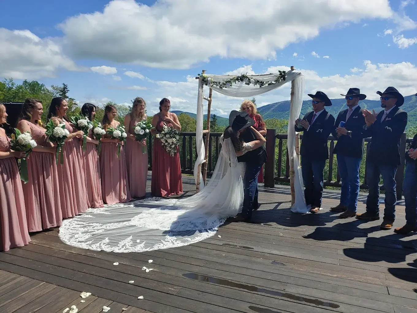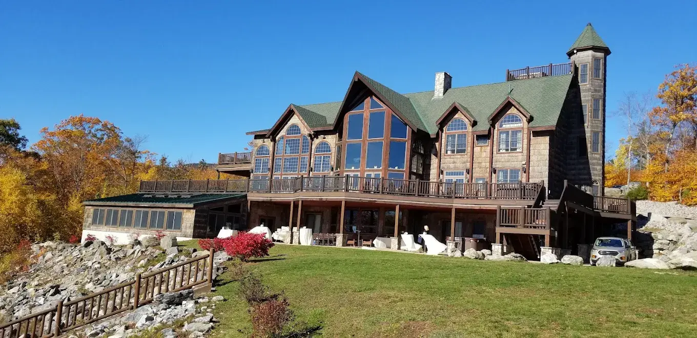 SkiEsta is a luxurious, cabin-style estate perched atop Powder Ridge in Newry, Maine, offering breathtaking views over the Sunday River valley. This expansive rental home combines rustic elegance and modern amenities–perfect for an unforgettable wedding weekend. Couples can host ceremonies on the balcony or wrap-around decks, followed by cocktail hours amidst panoramic mountain vistas. The formal dining room features two 11-foot tables seating up to 28 guests, plus additional dining space in the chef’s kitchen and bar areas.
