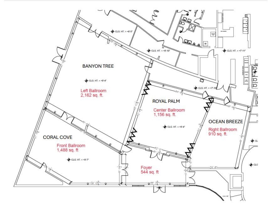 Step into the Grand Ballroom, where your fairy tale wedding becomes reality in a space as grand as your dreams. With its coastal-inspired decor of soft whites and tranquil blues, the atmosphere exudes elegance and serenity, creating the perfect backdrop for any celebration. The expansive layout offers versatility, allowing you to host a sweeping event or split the space into three intimate rooms with the airwall feature.