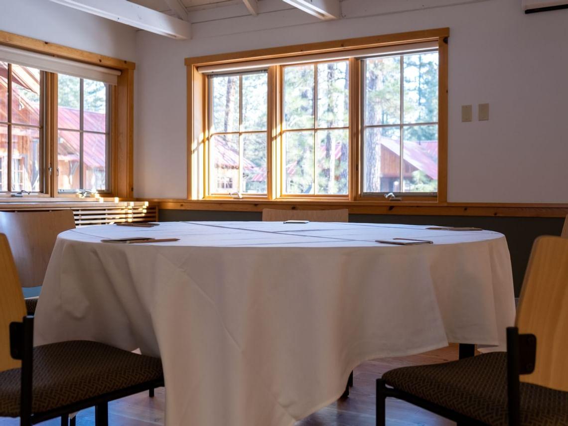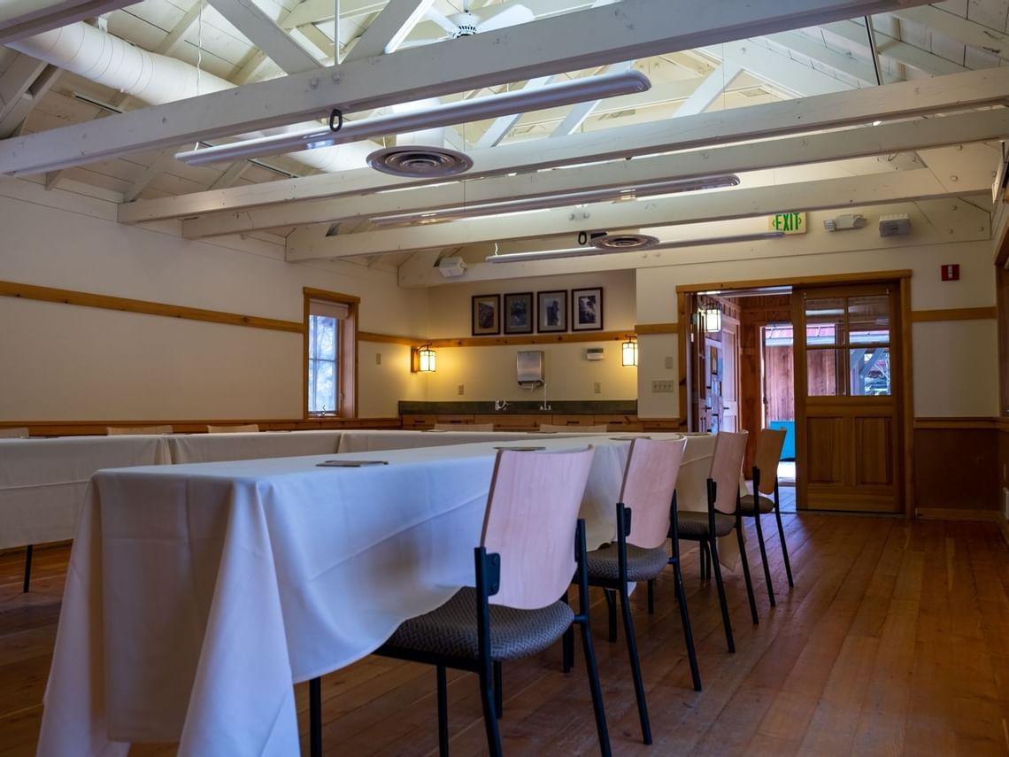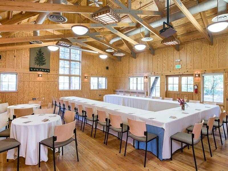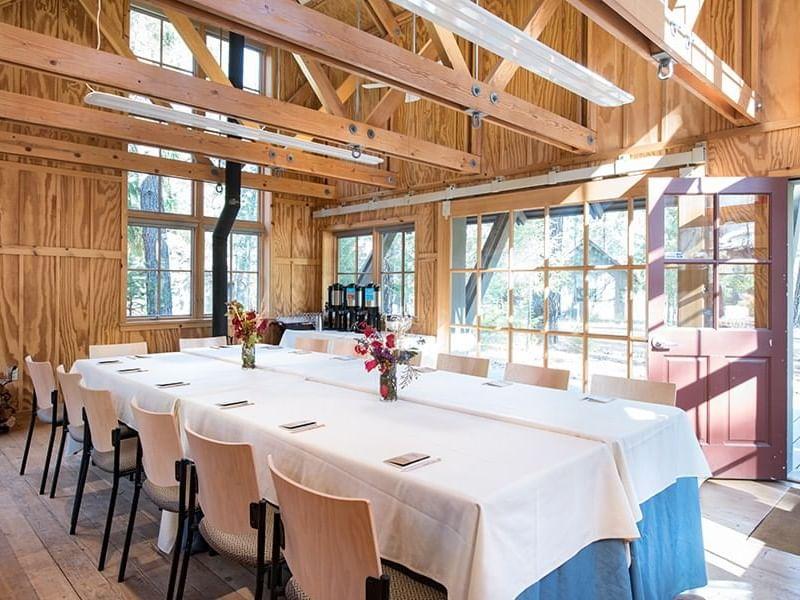 With 1,500 square feet of unobstructed meeting space you can imagine your event here anyway you'd like it. This space provides high vaulted ceilings, windows on all sides including French doors that open to an outdoor stone landing, a wood stove and pre-function space that is ideal for a working lunch and break delivery without interruption.