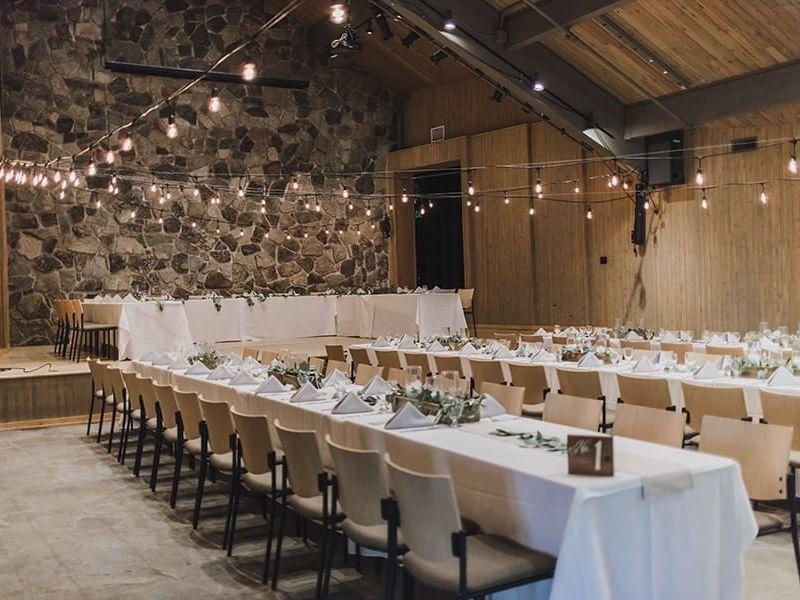 The Chapel Theater is an original building on the Sleeping Lady property, built in the 1950's by the Catholic Church when the site operated as Camp Field. Today, the Chapel Theater is a great setting for large groups with its dramatic granite walls and high vaulted ceilings.