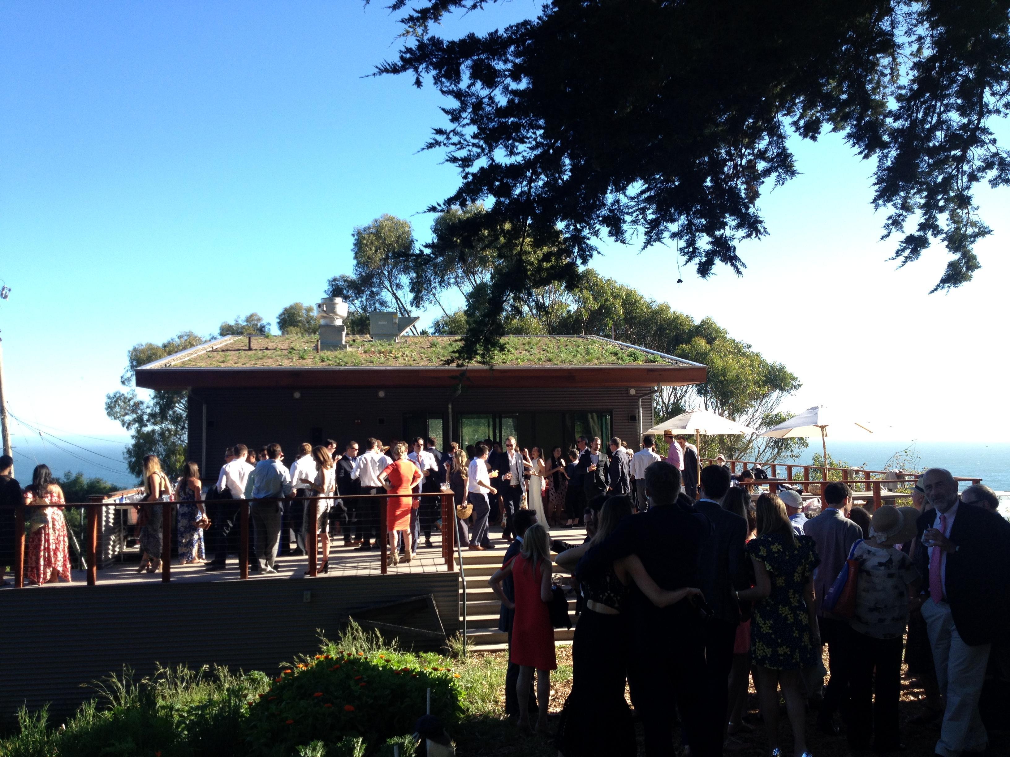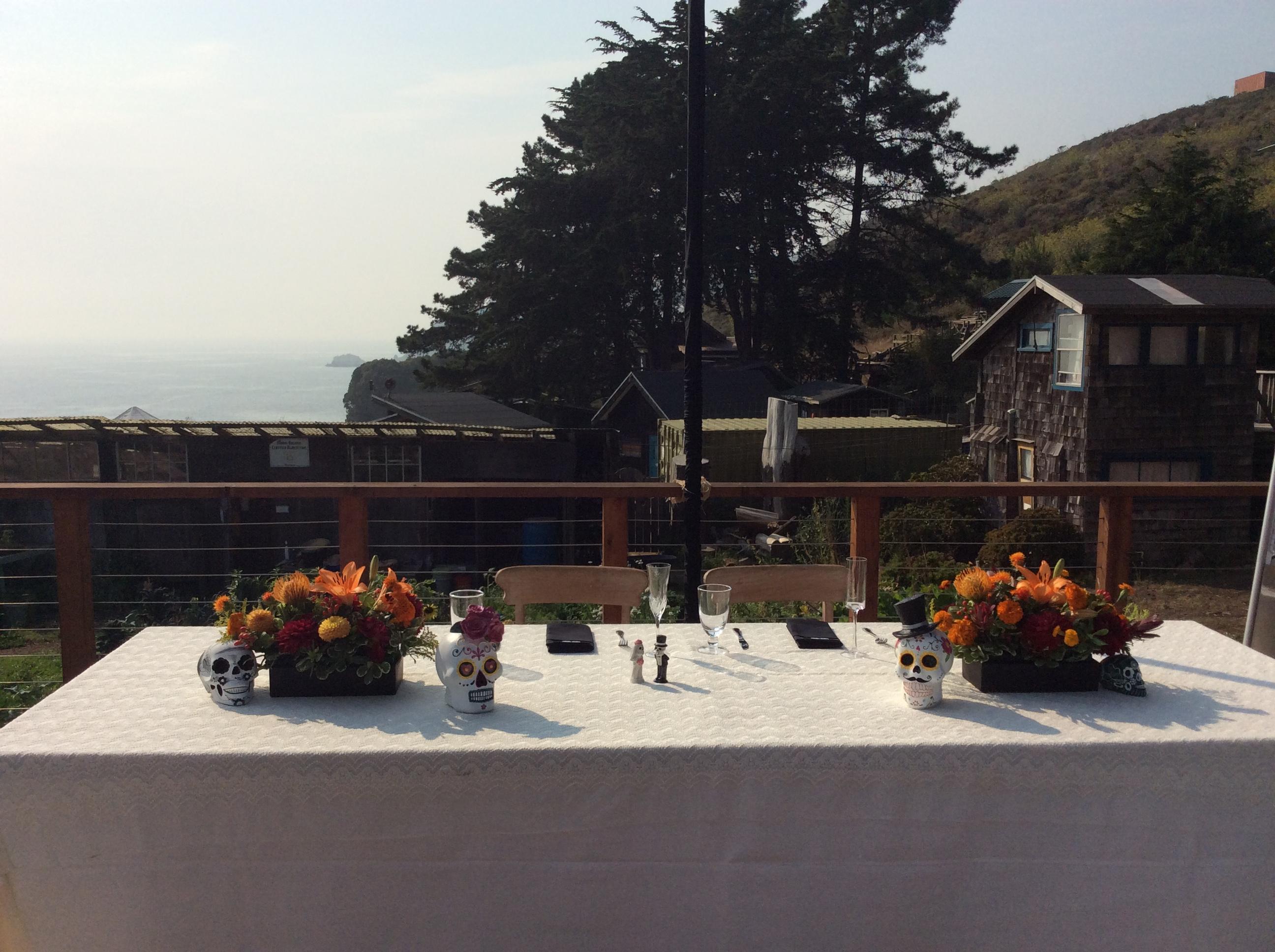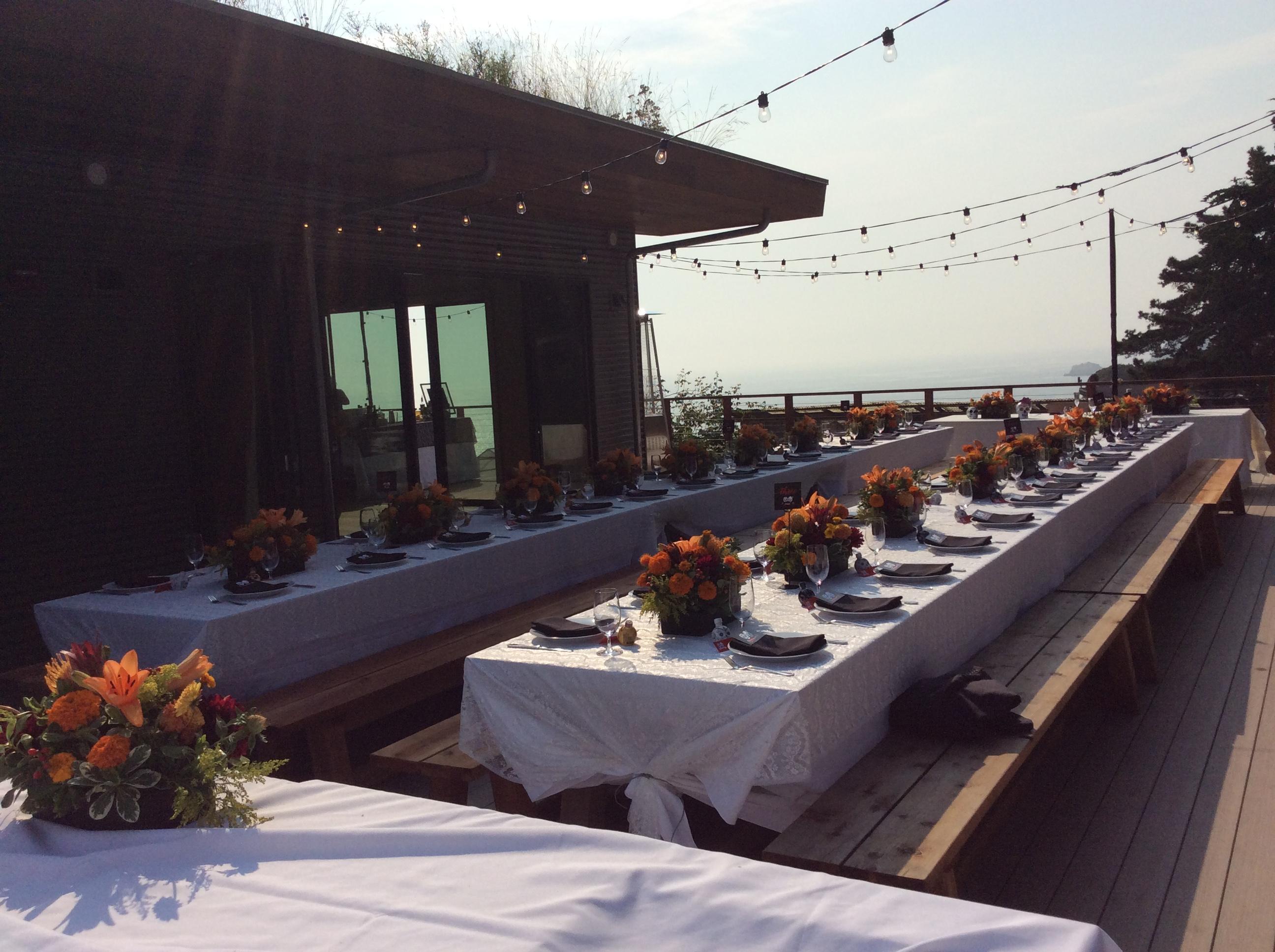 Indoor space for 38 people w/ 20 chairs, Beautiful deck overlooking the ocean with room for 80. Numerous large picnic tables w/benches for 72 To host 150 people by the FTTC, you’ll get to seat some people in our Organic Garden under majestic Cypress Trees! Optional (+$1,500 for 4 Hours) Commercial kitchen includes: 8 burner, stove, 2 ovens, lots of counter space, a 3 basin sink, a hand-washing sink, Fridge & Freezer space