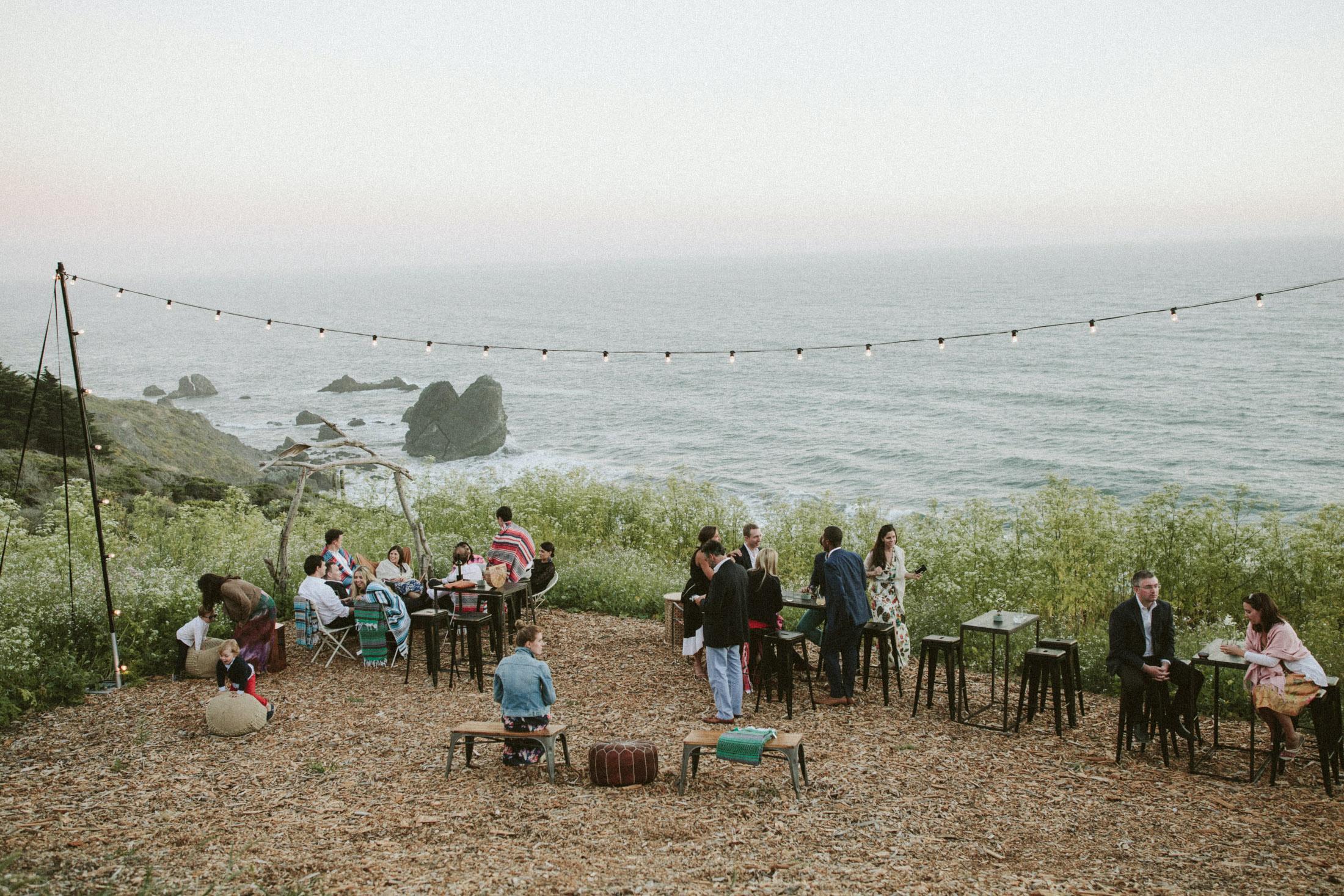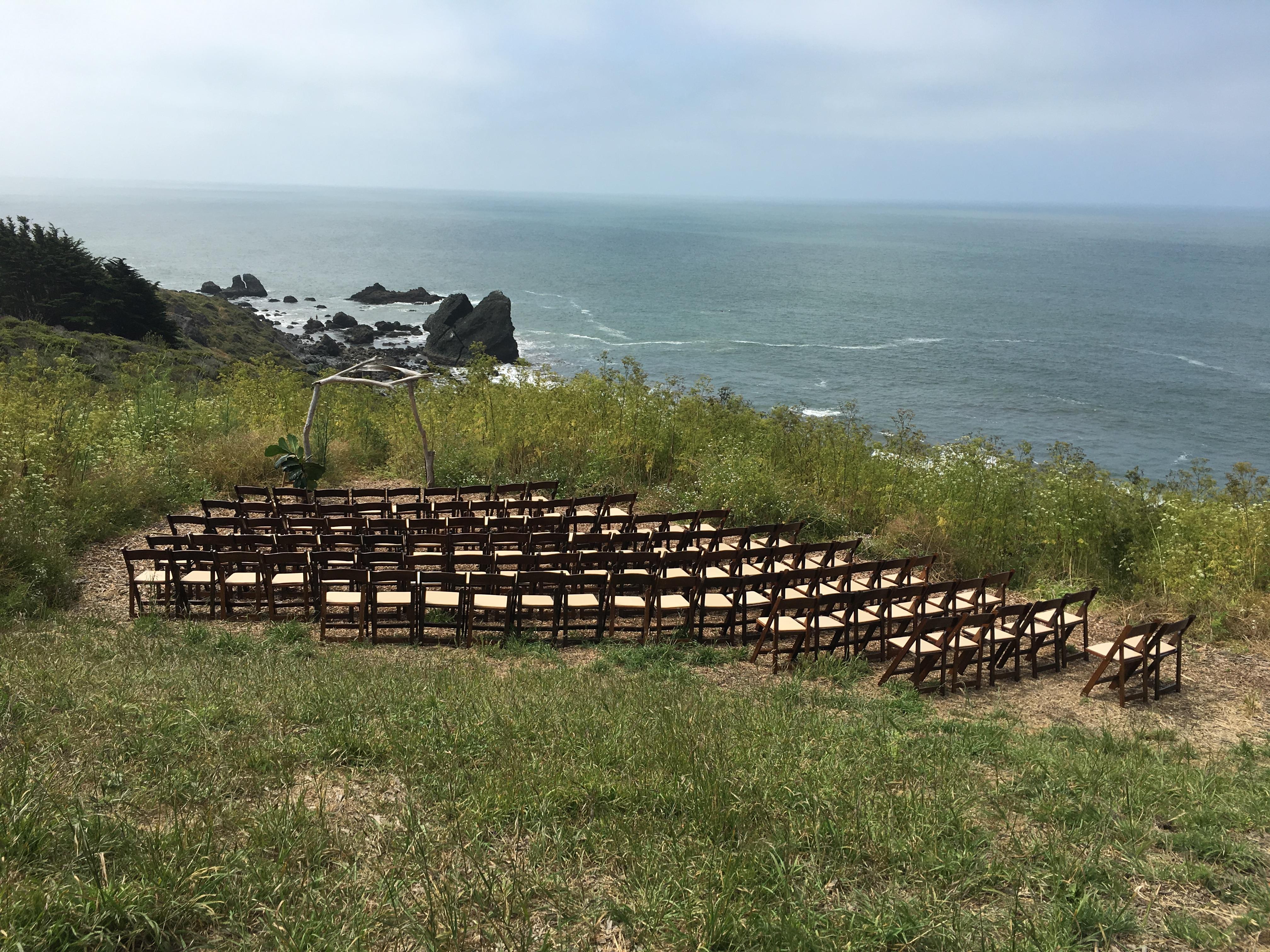 This space includes 2 level terraces, one for your ceremony and/or cocktails, with a driftwood wedding arch, one with picnic tables for dining and room for a bar and photo booth, as well as a 30 foot diameter Yurt with twinkle lights, great acoustics and a stunning view of the ocean and the sunset AND a campfire circle for either catering use, or a S'more Station and Bar!