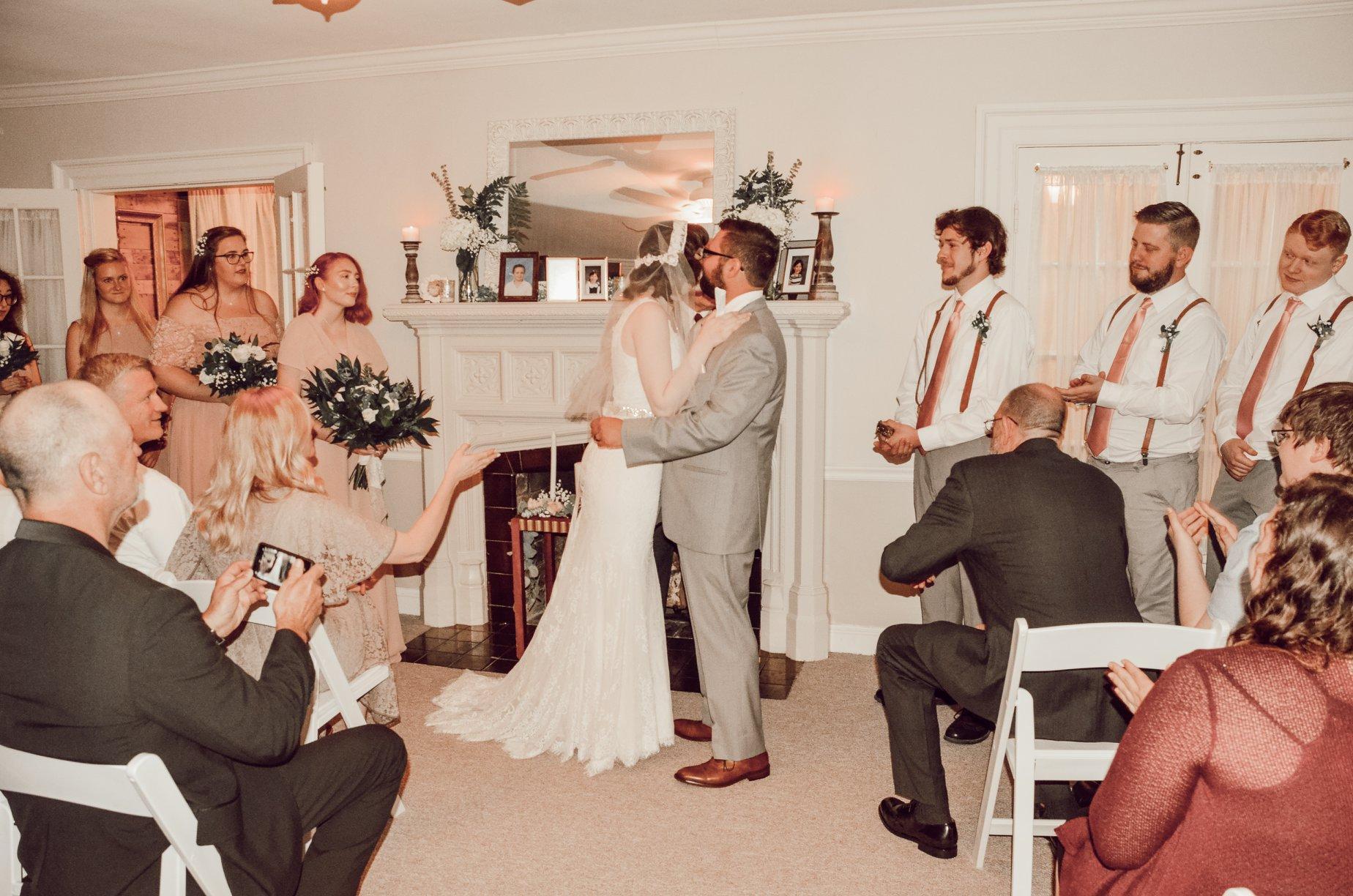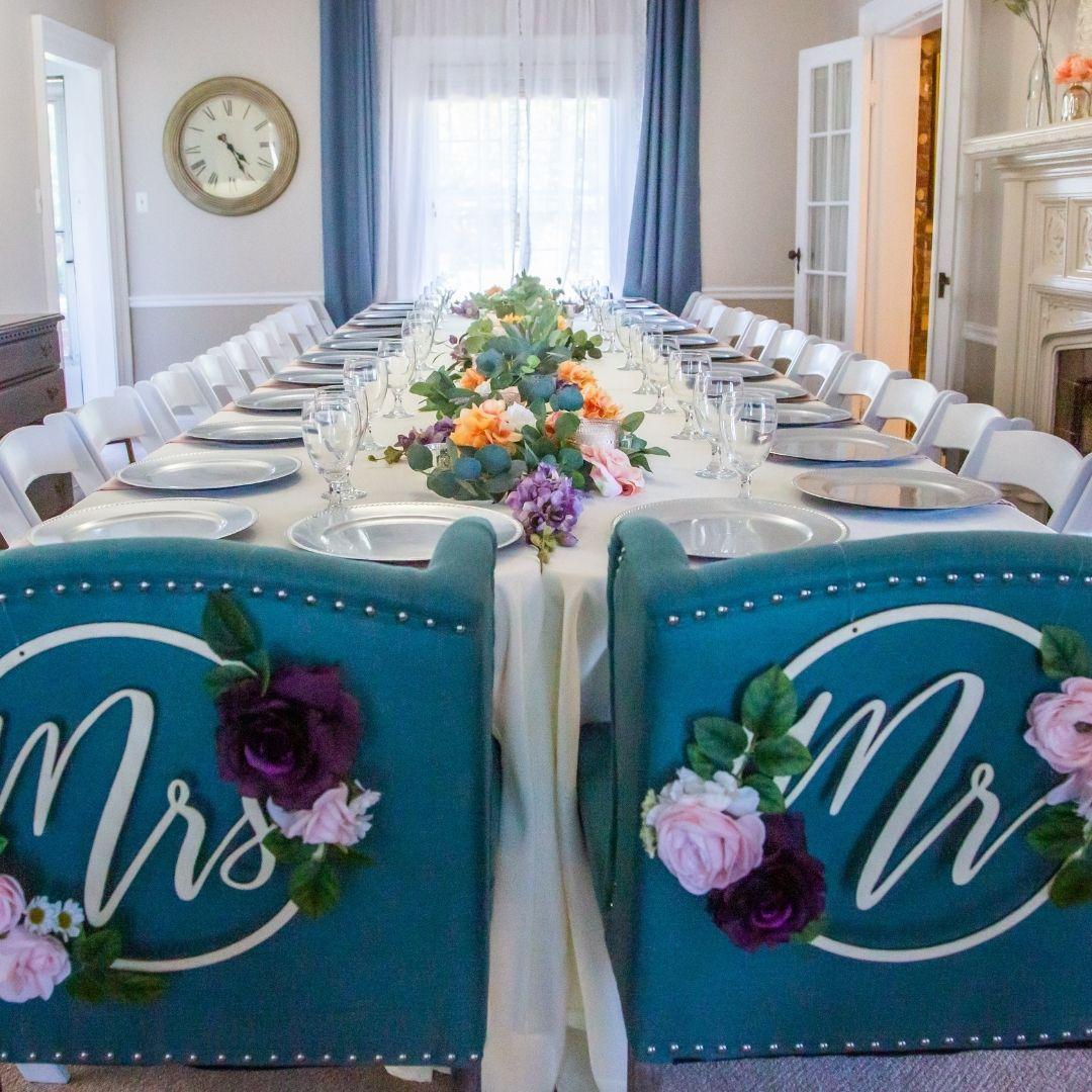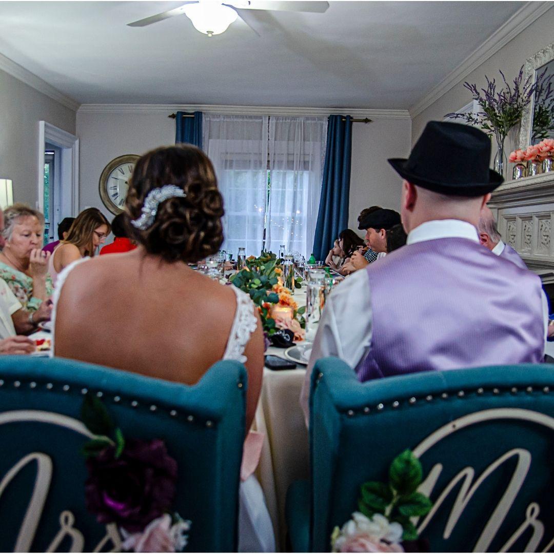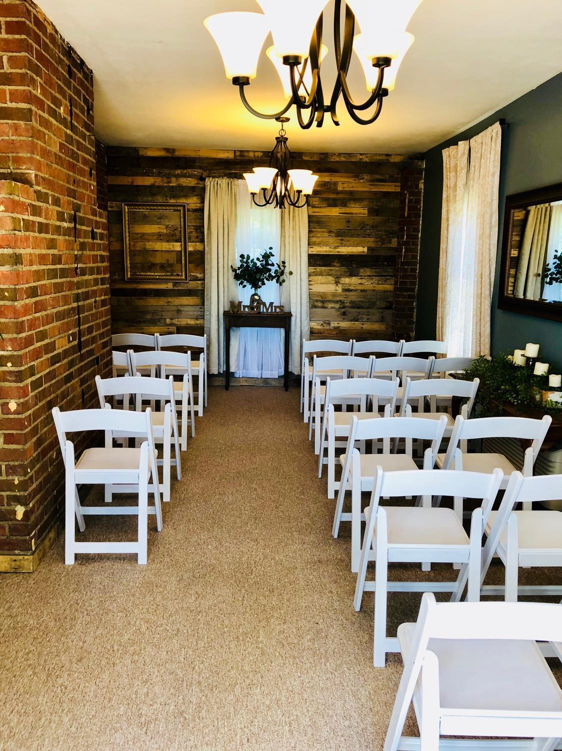 This Formal Dining Room can be set up for a seated dinner or small wedding ceremony. The reclaimed wood wall makes an excellent background for all your pictures on your special day!
