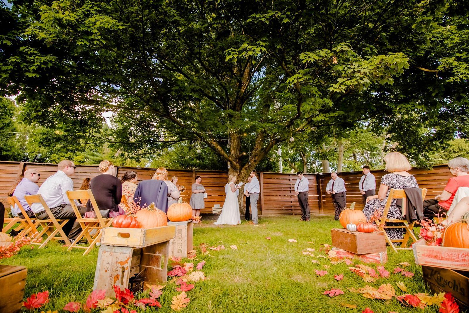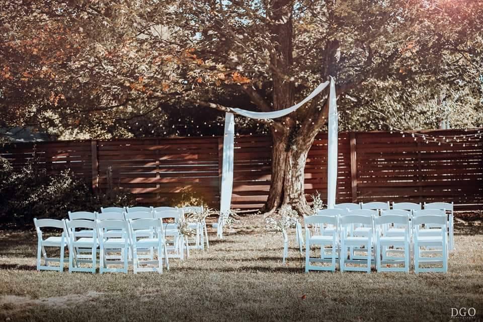 This space features room for a seated ceremony as well as a tent with tables for dinner, a dance floor, bar, food stations and more! Fully fenced for privacy.