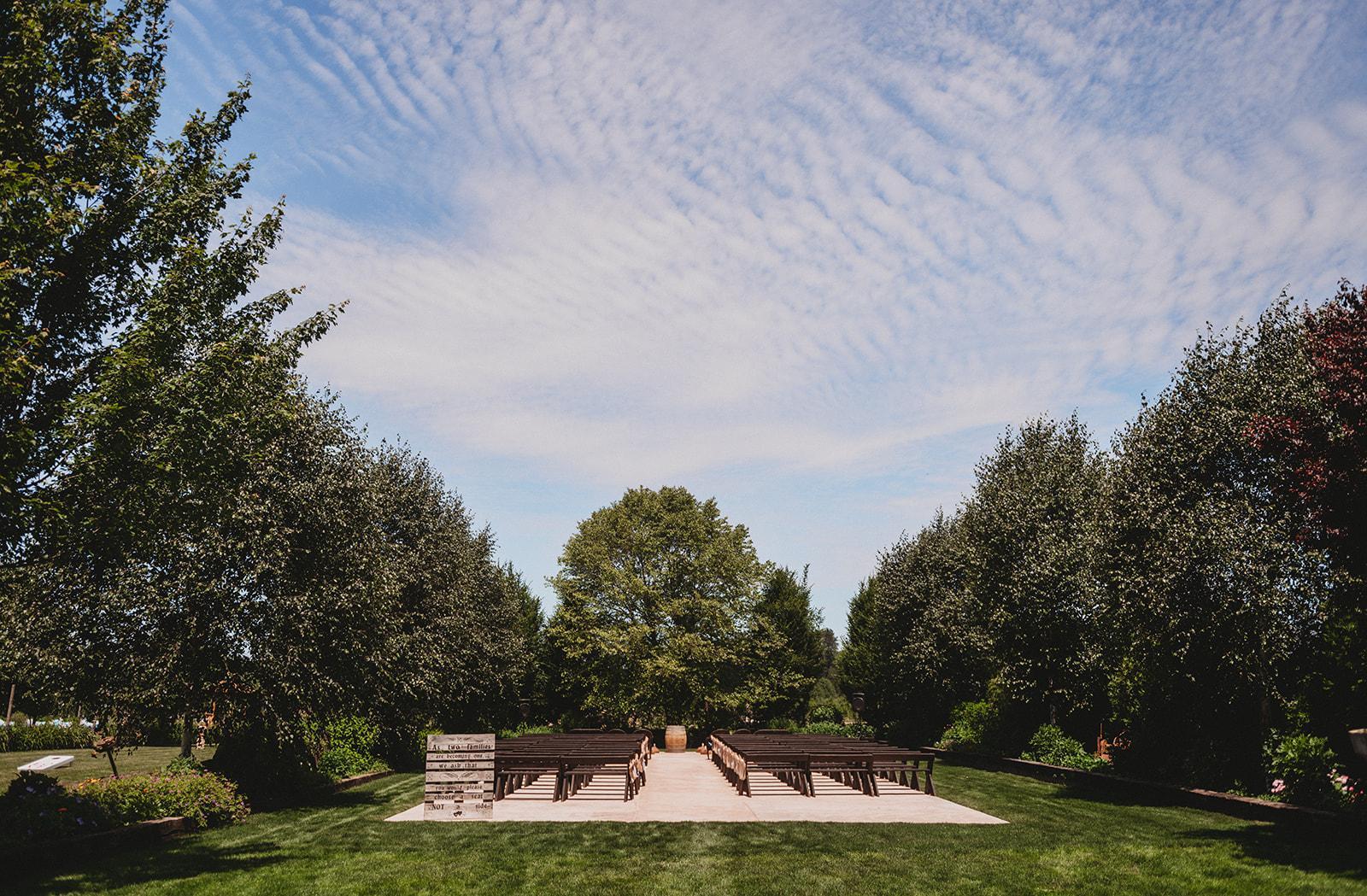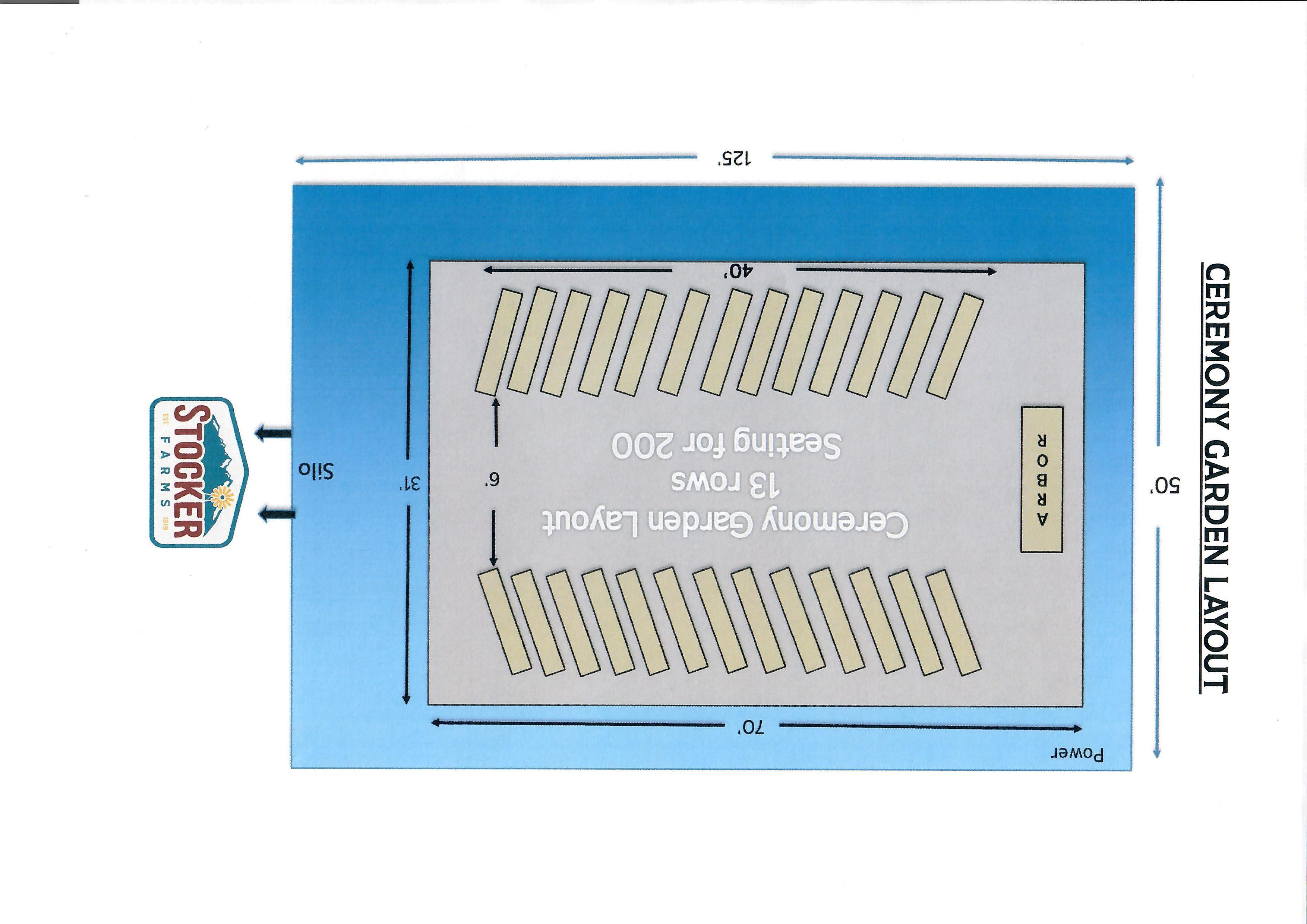 - 100 wooden ceremony benches - Wedding Arch for behind the bride and groom - Assorted flowers and trees planted surrounding the space - Limited power nearby