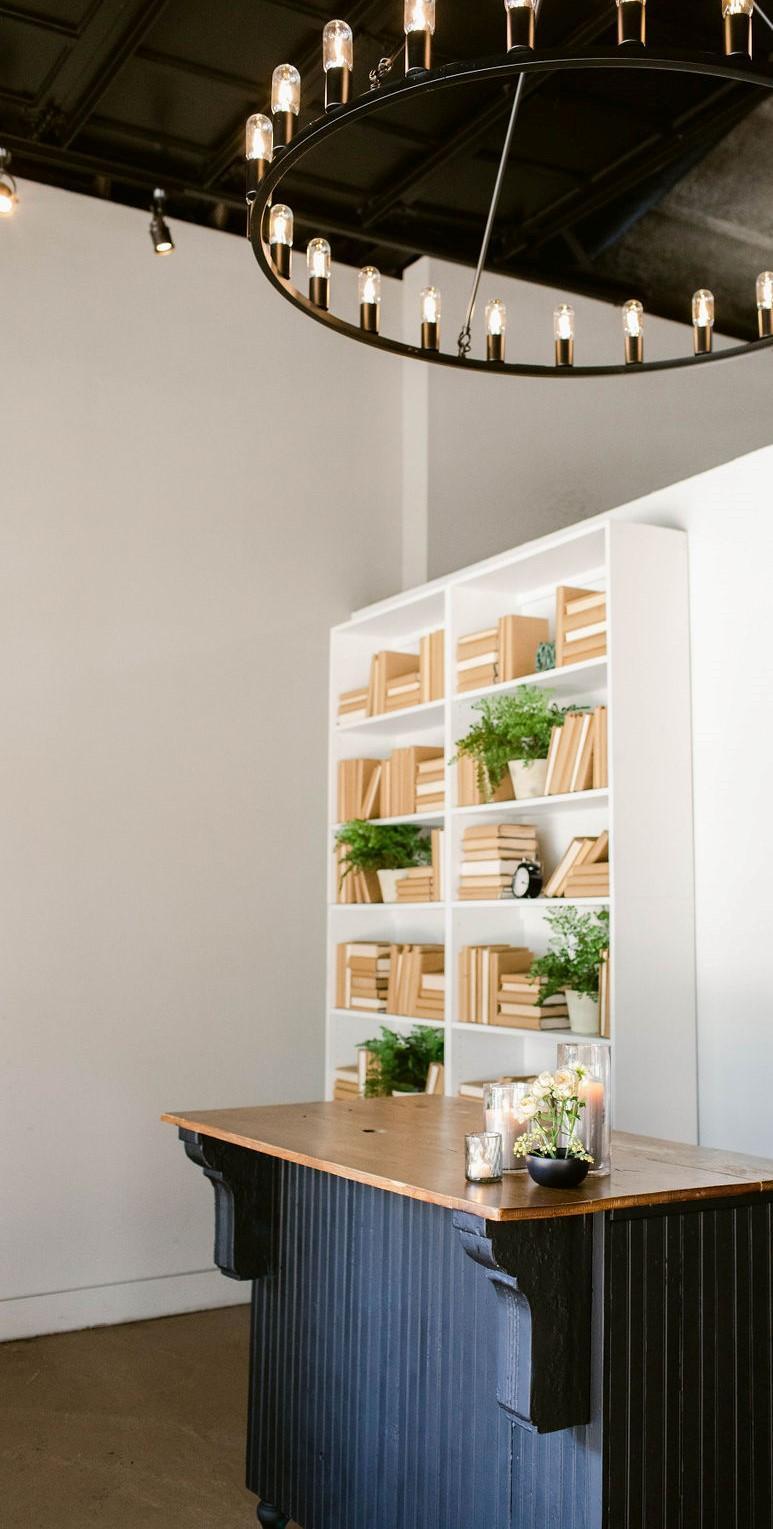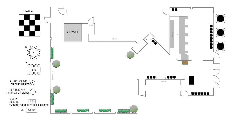 -Round or banquet tables {require linens} -Black x back style chairs -White and black checkerboard dance floor {additional $500 rental} -China -Glassware -Flatware -Cafe lights in front of garage door -Edison style light bulbs strands in ceiling -Dimmers for total lighting customization -House sound system -Four large trees in wood planter boxes {on wheels} -Six low, wood planter boxes {on wheels}
