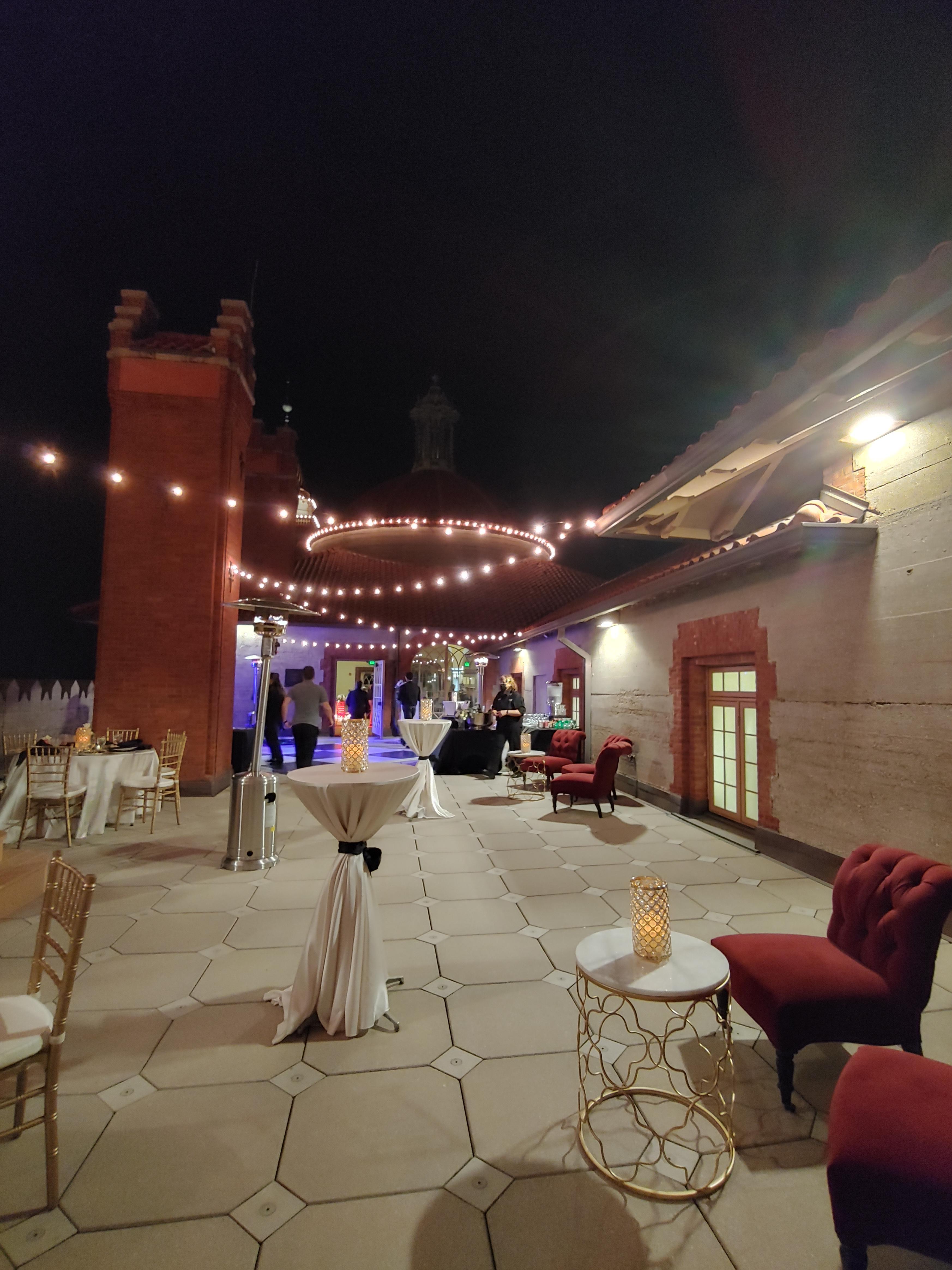 The centerpiece of the Solarium is a vaulted dome, supported by eight square columns, with a skylight at the top. This interior 55-by-50-foot room with boasts sliding windows to view Ponce de Leon Hall's Courtyard. There are two open-air terraces on the east and west, each with a rising tower. with views of the Memorial Presbyterian Church, the city plaza, Cathedral Basilica, beaches, and the Lighthouse. Your guests will be stunned by the views!