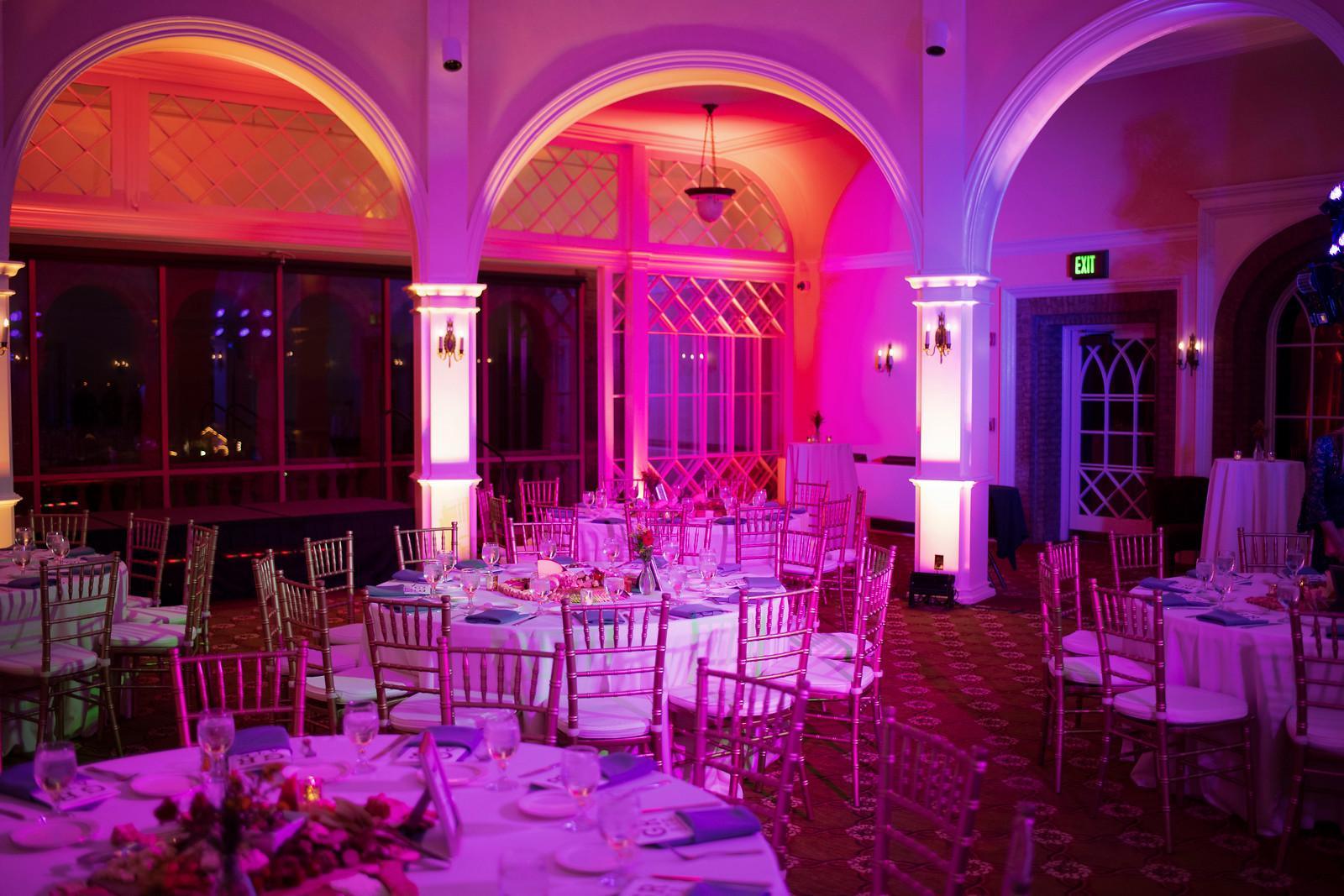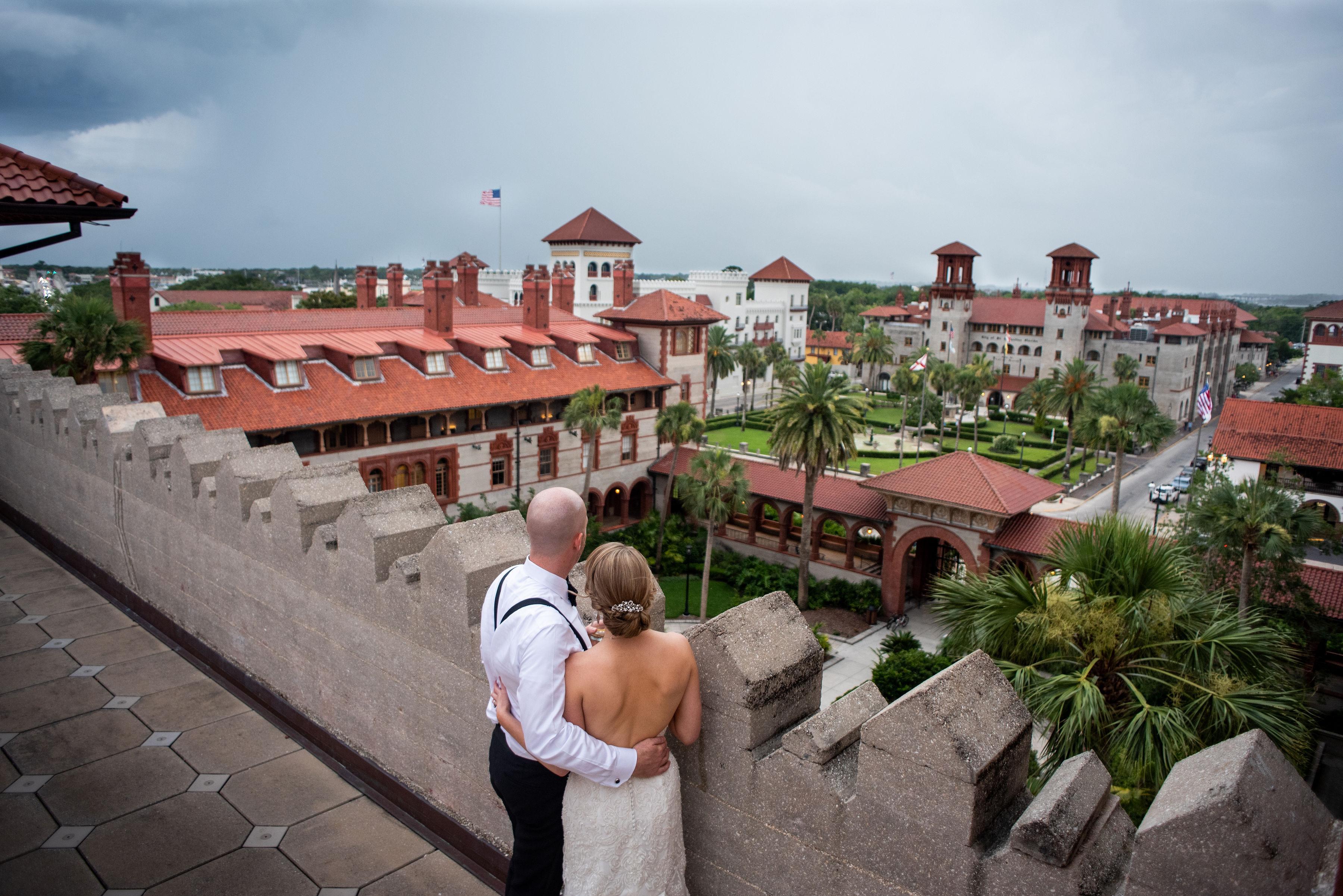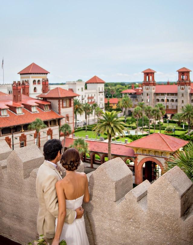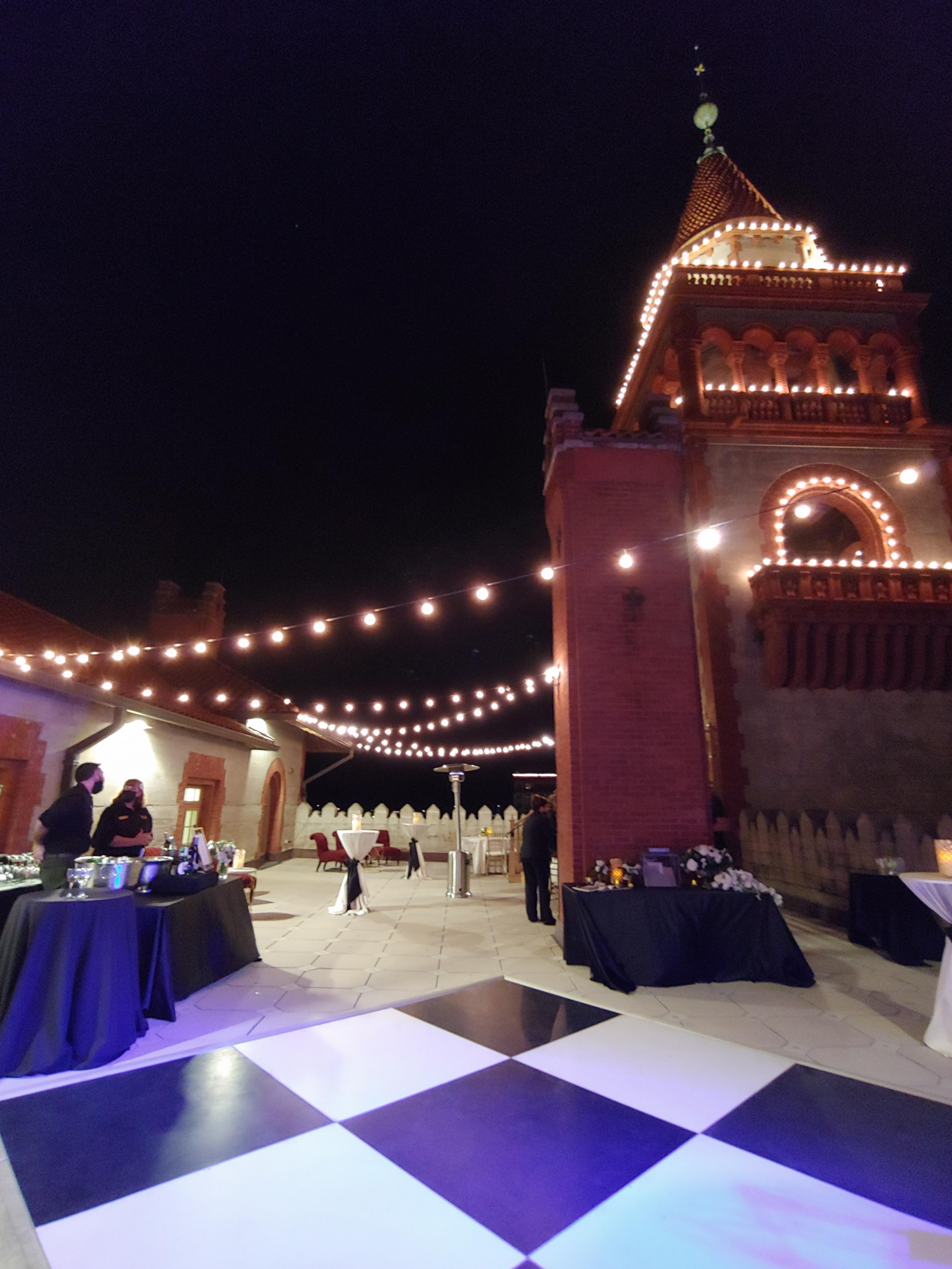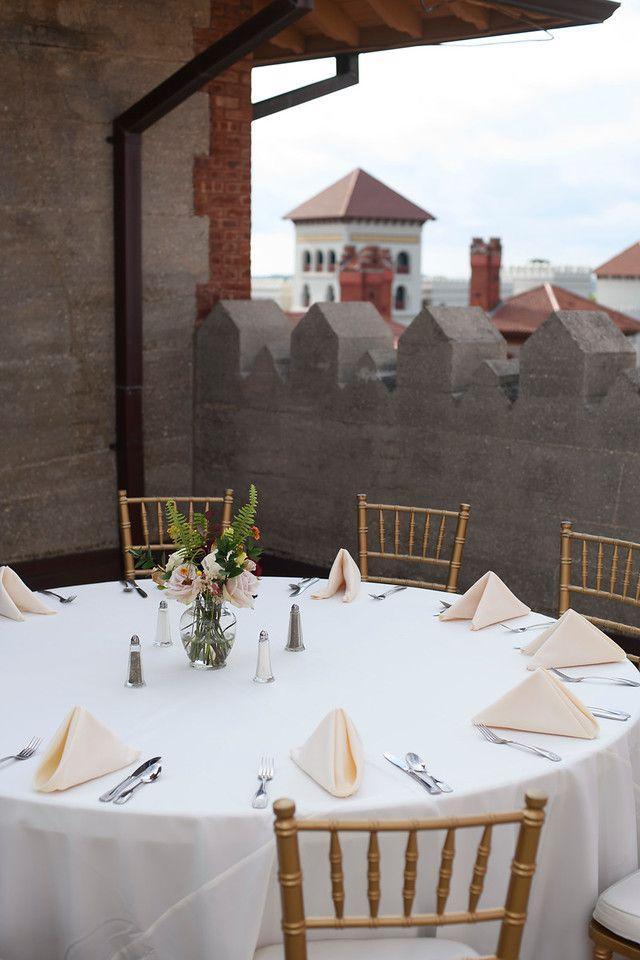 A rooftop venue overlooking the historic Ponce Hall Courtyard and all of downtown St. Augustine – your guests will be blown away by the views! It includes a round window-lined space along with two outdoor terraces that are excellent for cocktail hour and dancing. Seats max 120, however adding indoor space for buffet, etc., we recommend 80-100. For a reception rental on a Saturday, this venue is $10,500 and includes gold chivari chairs and tables. Available Year-Round on select weekends.