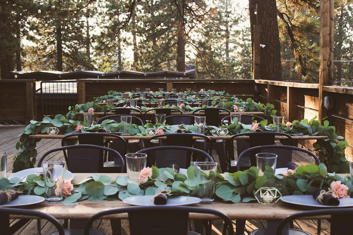 Third floor deck with sweeping mountain views and peekaboo views of Lake Tahoe. Includes rustic wooden tables with wooden benches or black metal chairs for seating, a private fire pit, and bistro lighting. Site fees start at 4 hours.