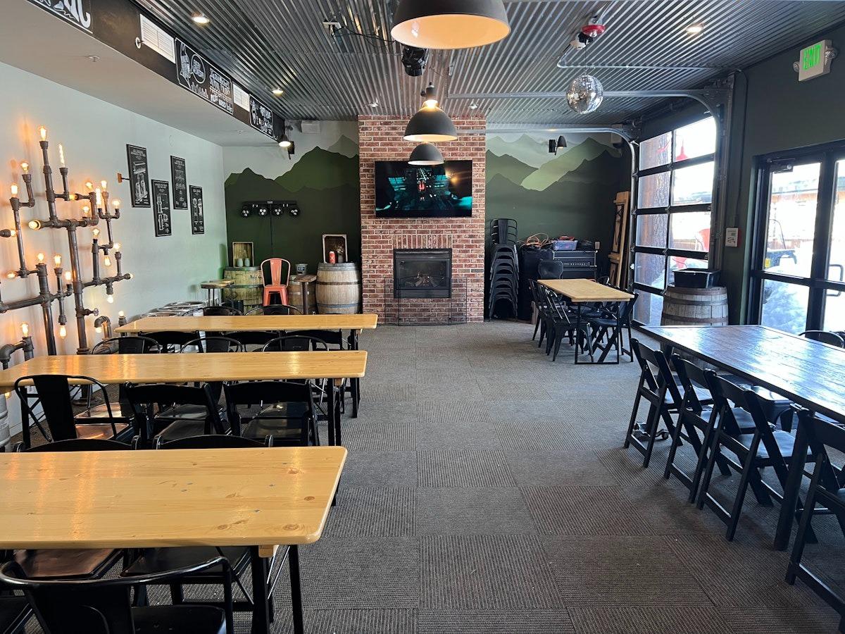 Indoor space just adjacent to taproom, separated by rustic barn doors. Includes wooden tables and black chairs for seating and Smart TV with HDMI ports. Site fees start at 4 hours.