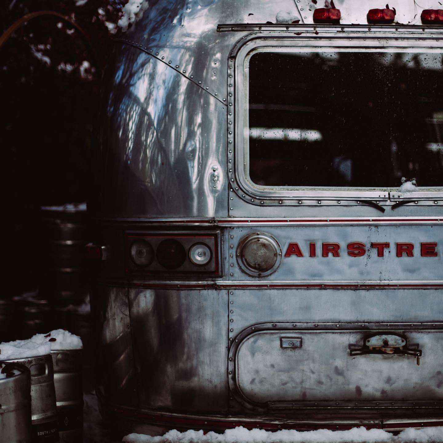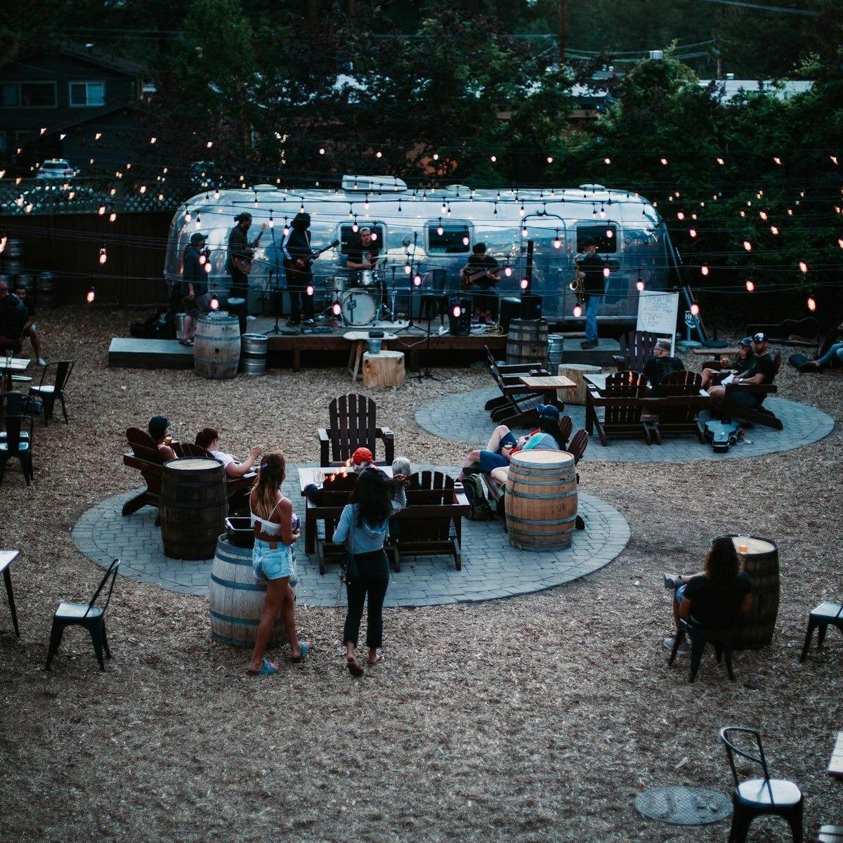 Twinkle-lit courtyard with airstream backdrop and wood chip ground covering. Includes picnic tables, stage, two private fire pits with adirondack chairs. Site fees start at 4 hours.