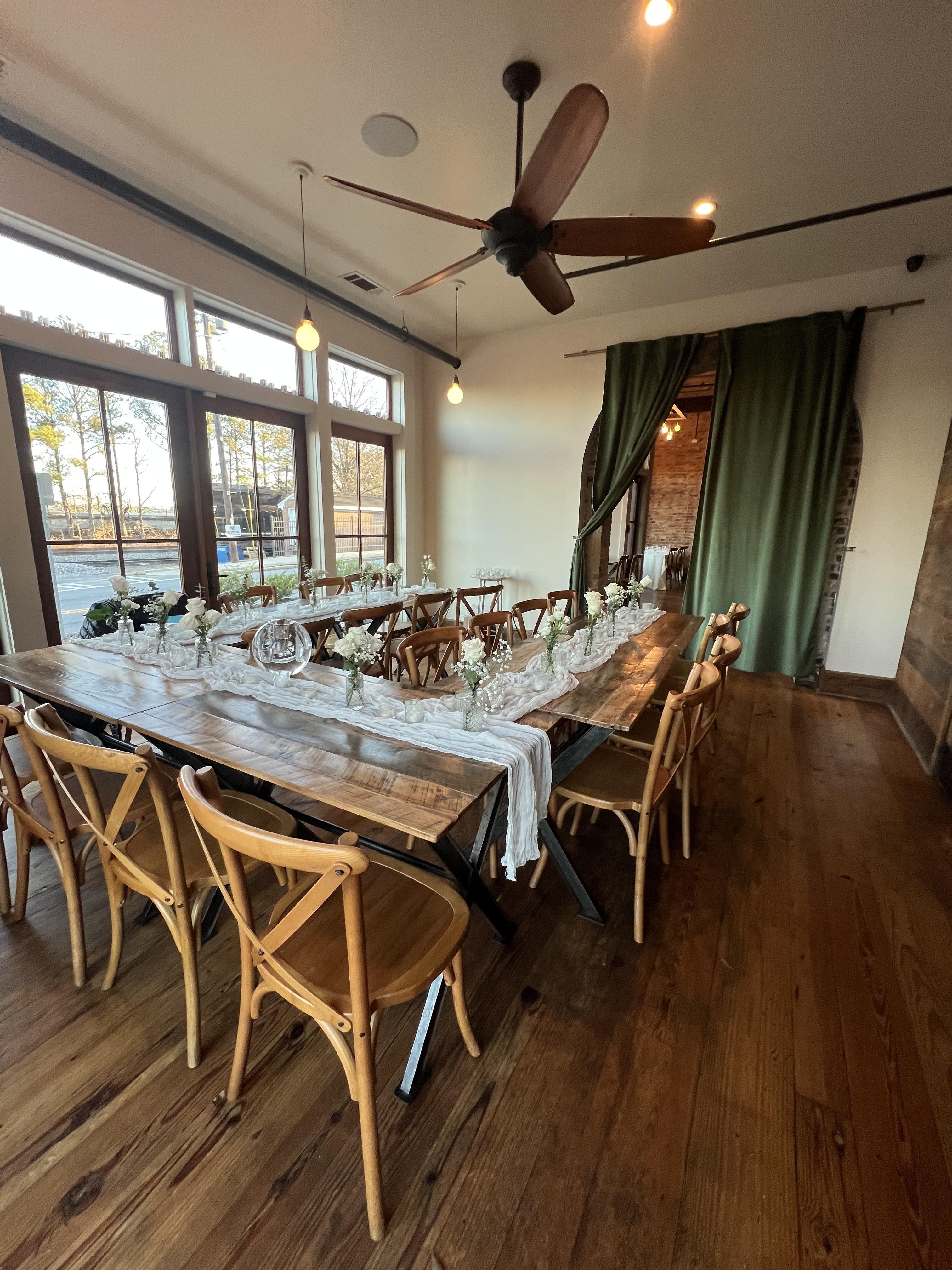 - Covered porch for overflow and additional seating - Fully restored antique bar - Dimmers for total light customization - Projector and pull-down screen - Surround sound with customizable music - 2 Restrooms - Tables and chairs for customizable set-up - Room for a dance floor - Ability to bring-in live music or DJ