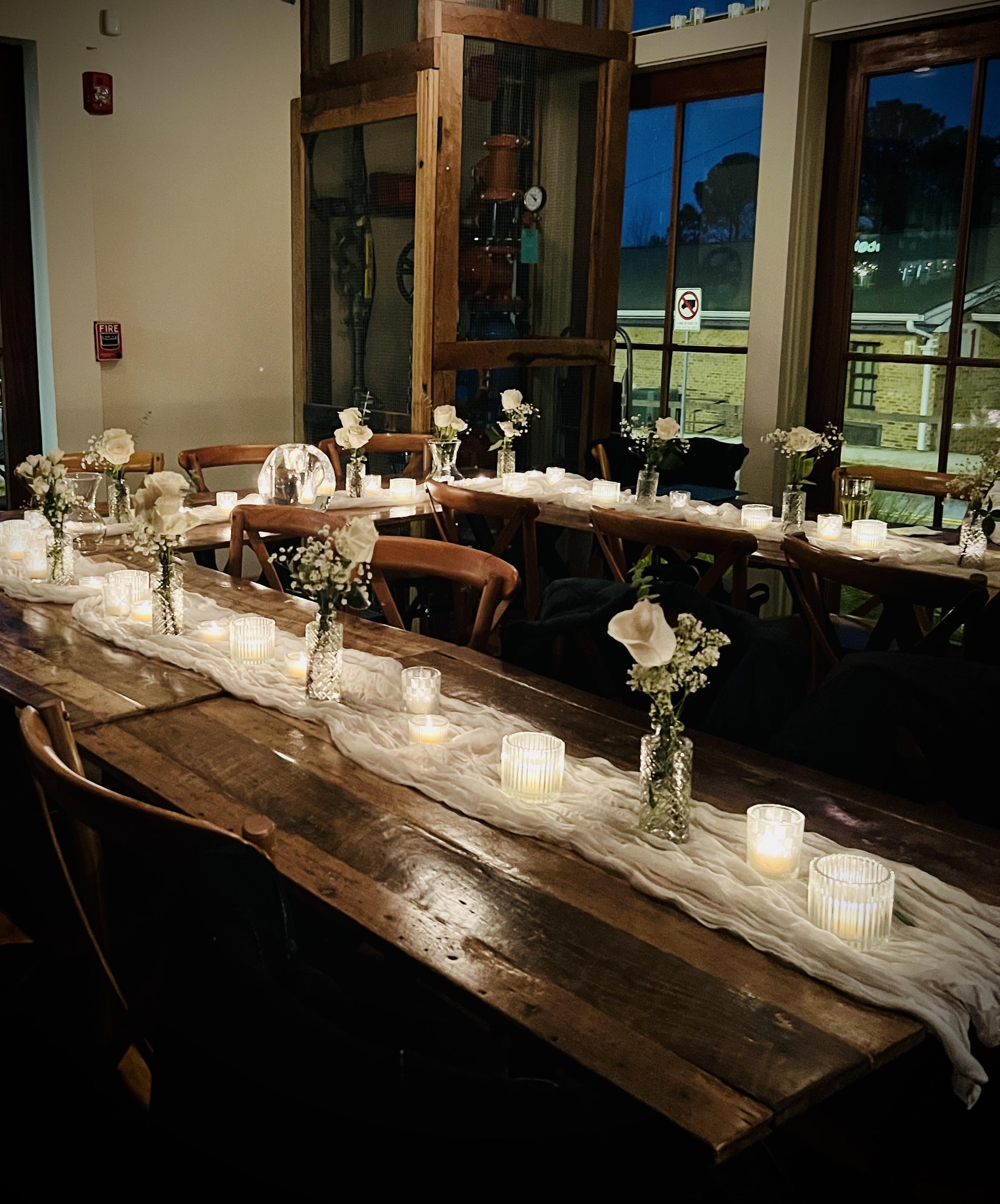 Located on the main floor of the restaurant, The Engine Room is wheelchair accessible and sits just off of the main dining room, near the kitchen. It is flanked by floor to ceiling windows and doors, including the main patio entrance. The space can seat a max of 24 people comfortably. Cake/gift tables are available for set-up, but presentation materials are not available in this room. If your party has opted to not meet the minimum spend, other guests may be seated in this area.