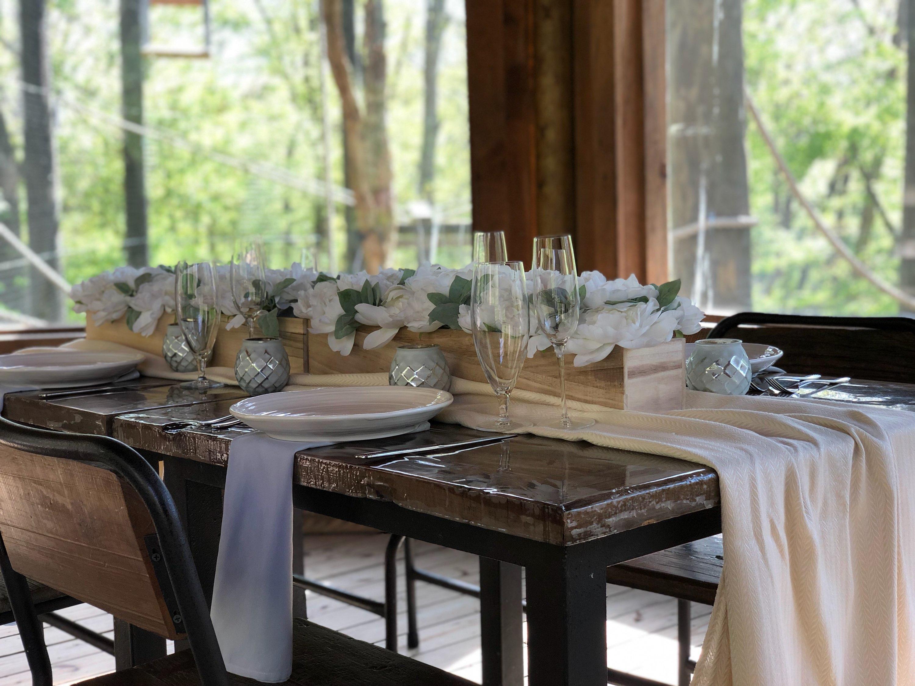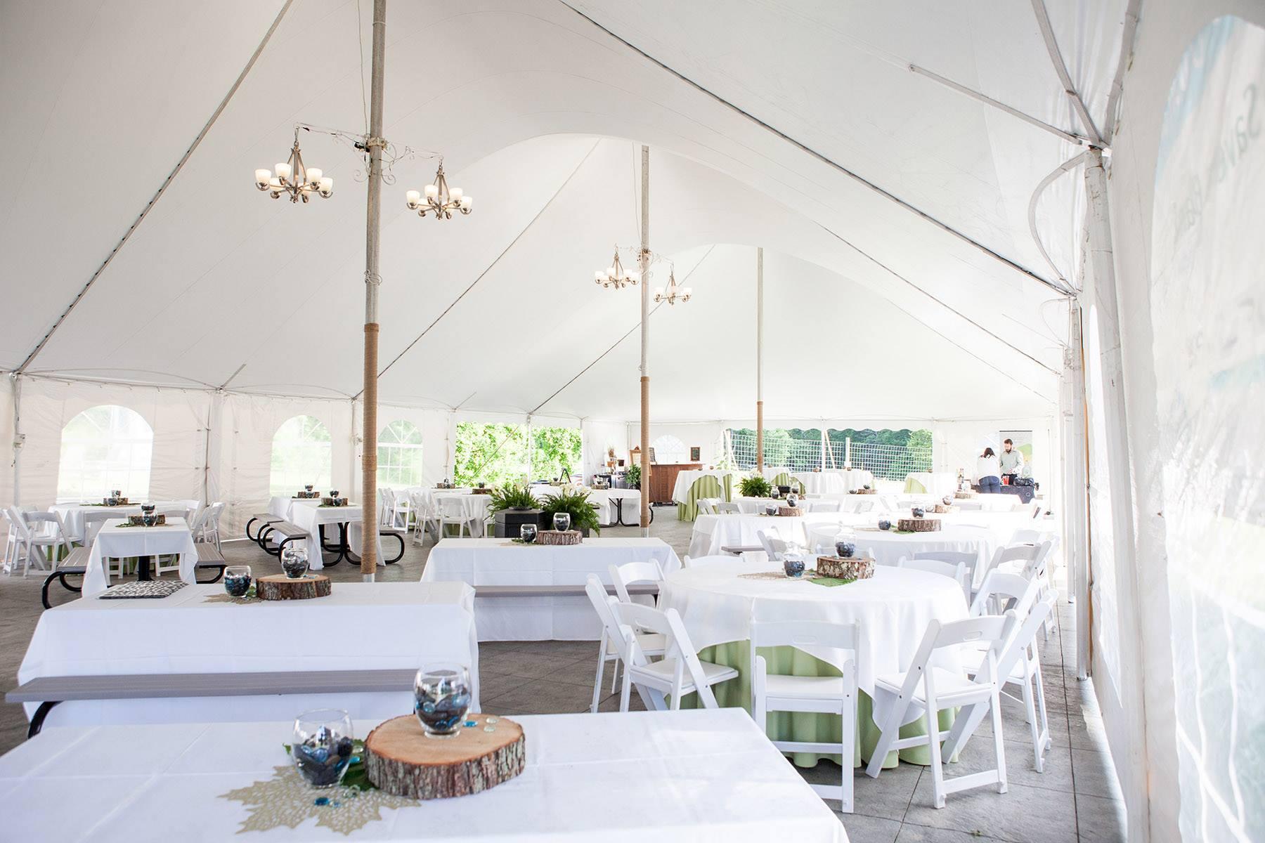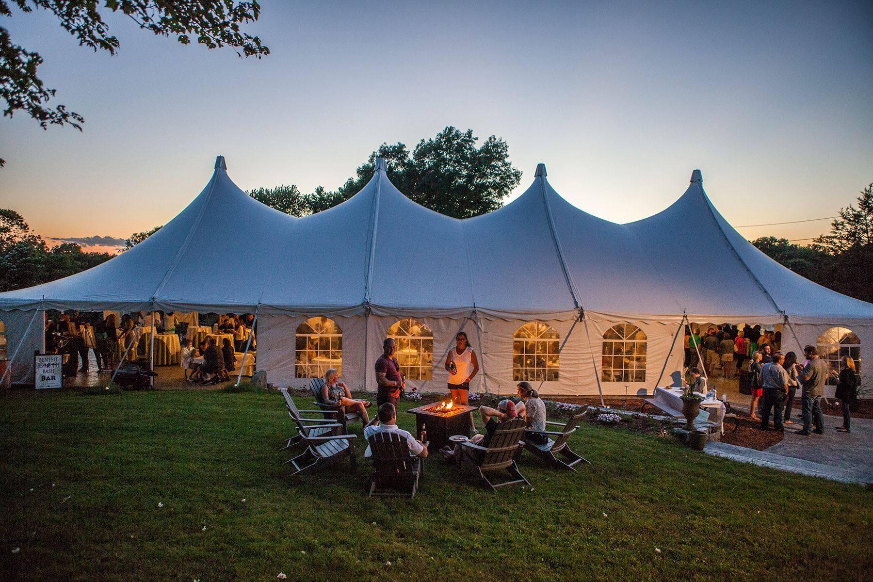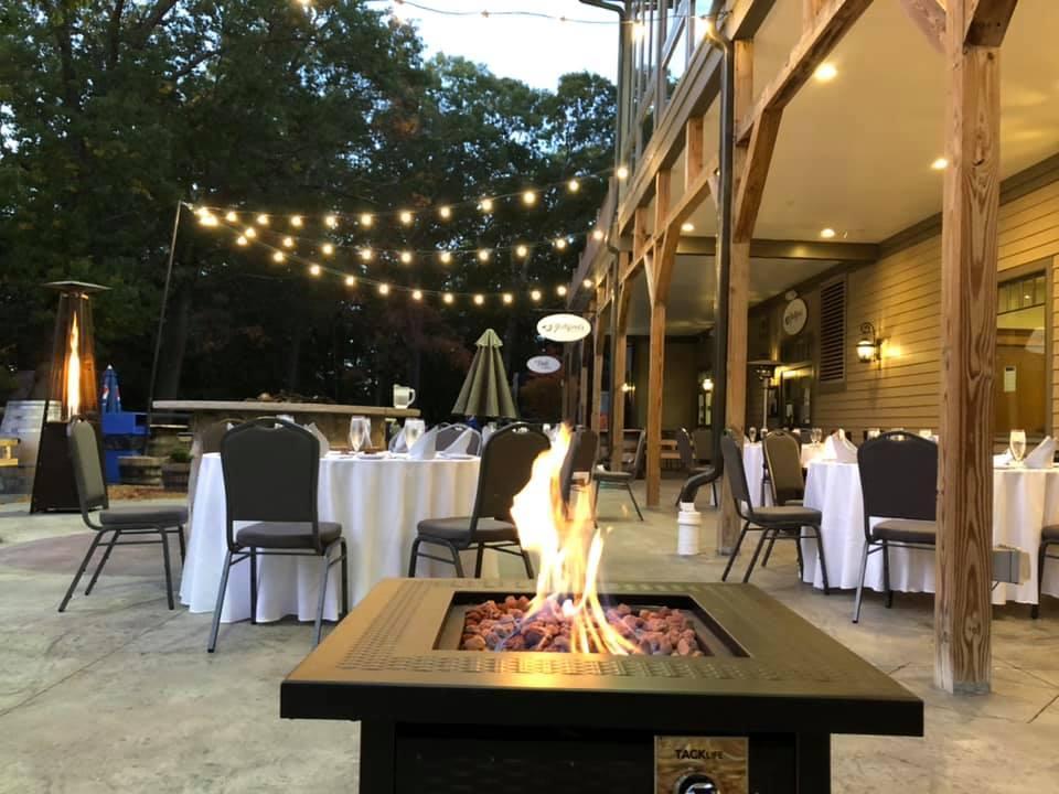 House Tables, Linen and Chairs Chandeliers Grassy Lawn space with Firepits and Adirondack Chairs