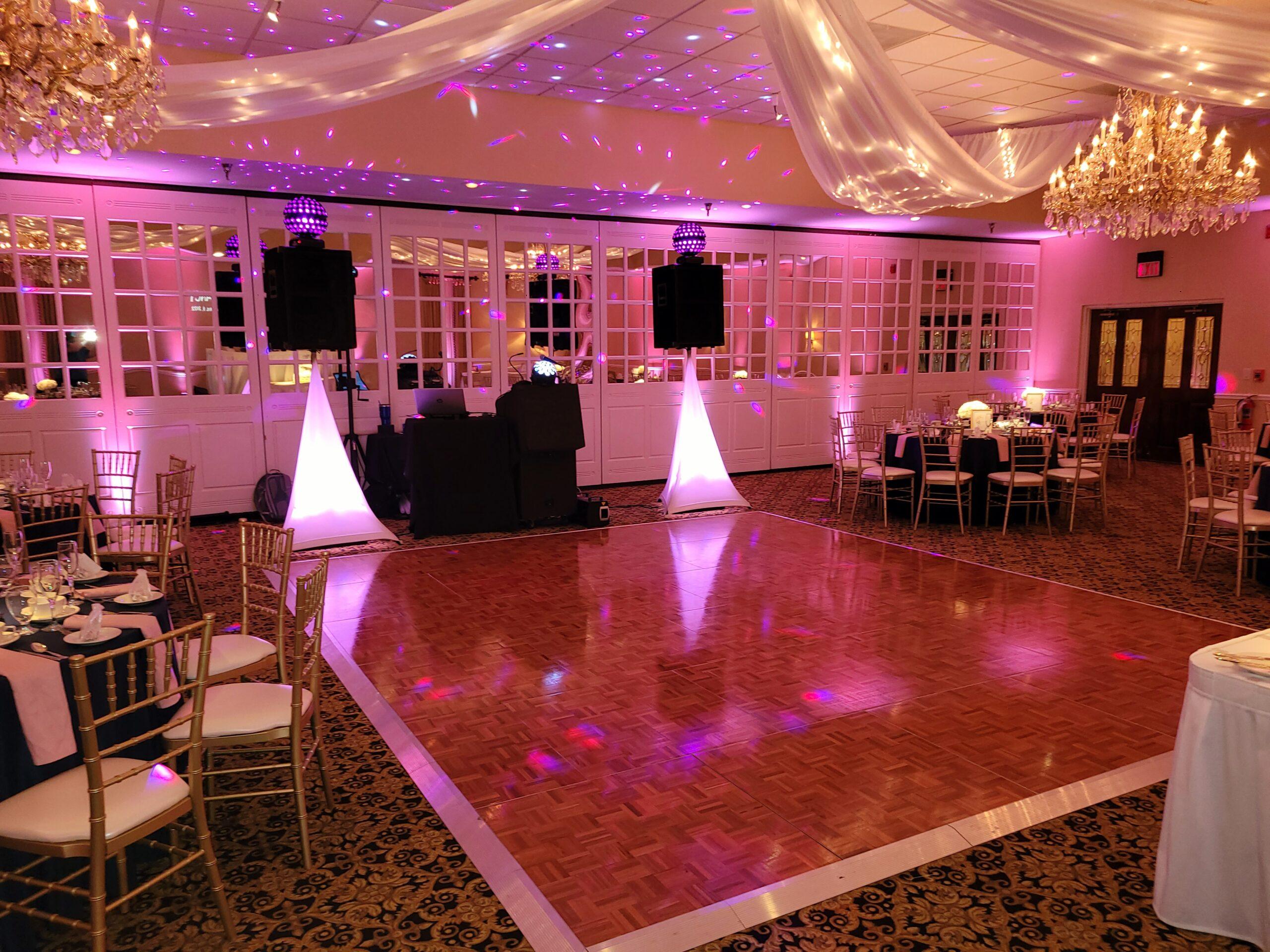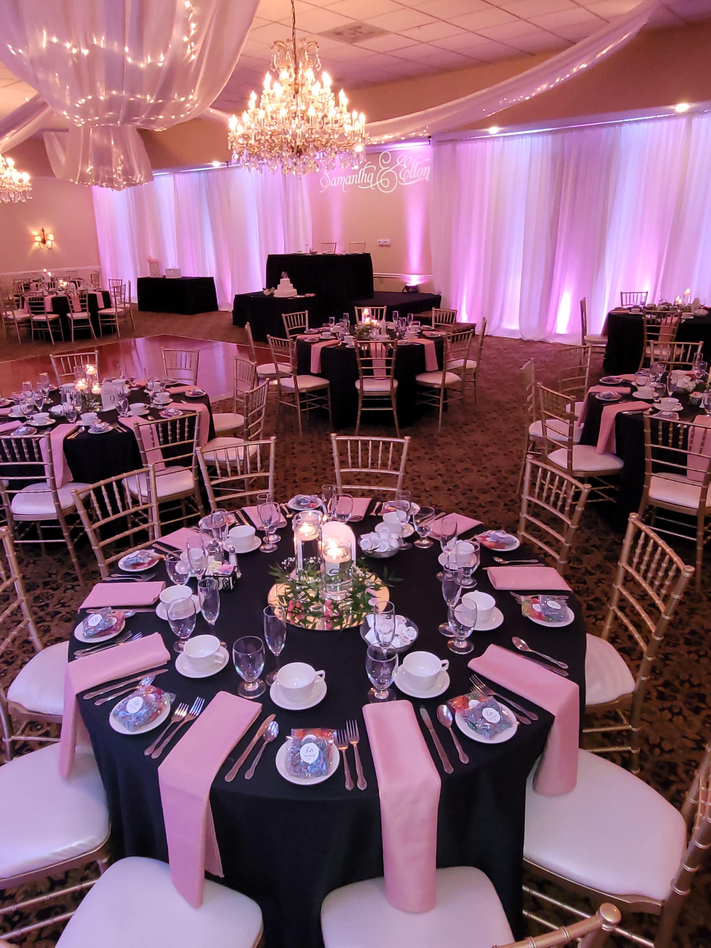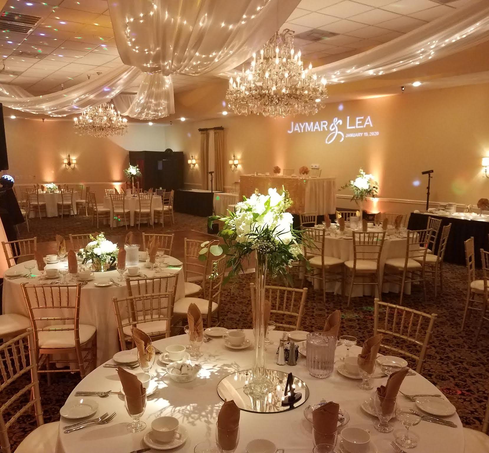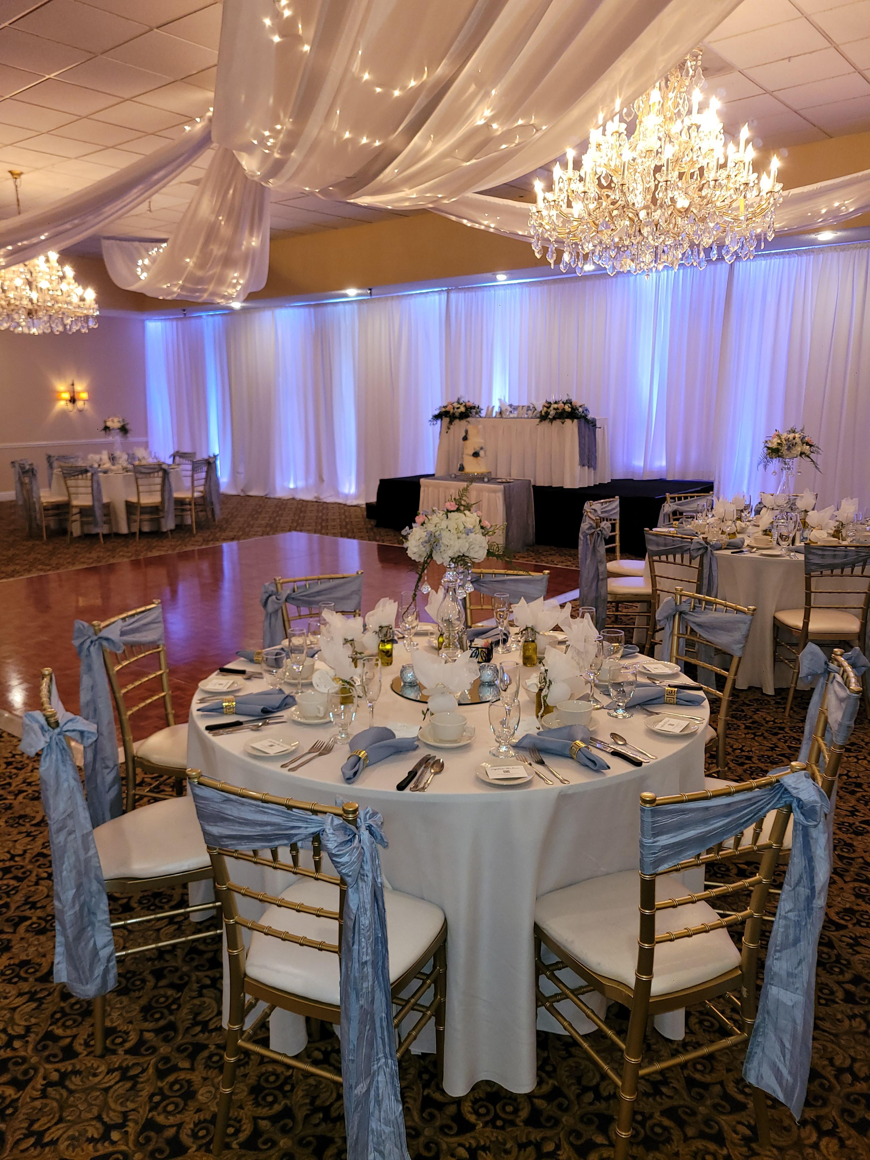 Private Ballroom, Dance floor, Chairs, Tables All Set up & Clean Up Linen tablecloths, Linen napkin, China, Glassware, Silverware Cash bar with bartender if the guest want to purchase a drink Or a bar tab to a specific amount then cash Unlimited Coffee, Ice tea, Soda Poured Champagne toast for everyone Served dinner Fresh Floral centerpiece for tables Wedding cake (You design and choose flavor) Gold Chiavari Chair OR Chair cover Service staff and Wedding coordinator