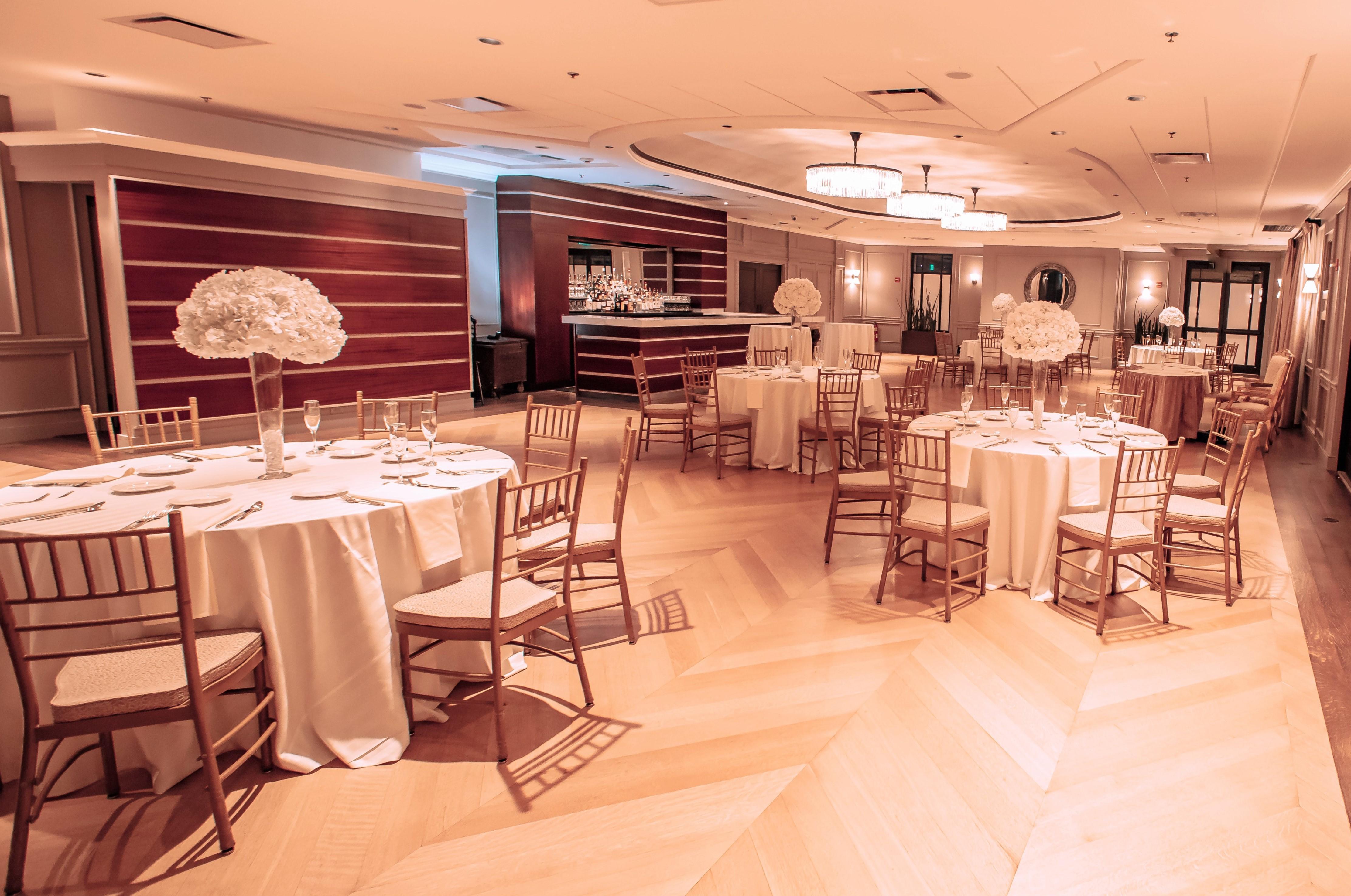-Uplighting -Gold Chiavari Chairs -Floor Length Linen -Balcony Access with high top seating