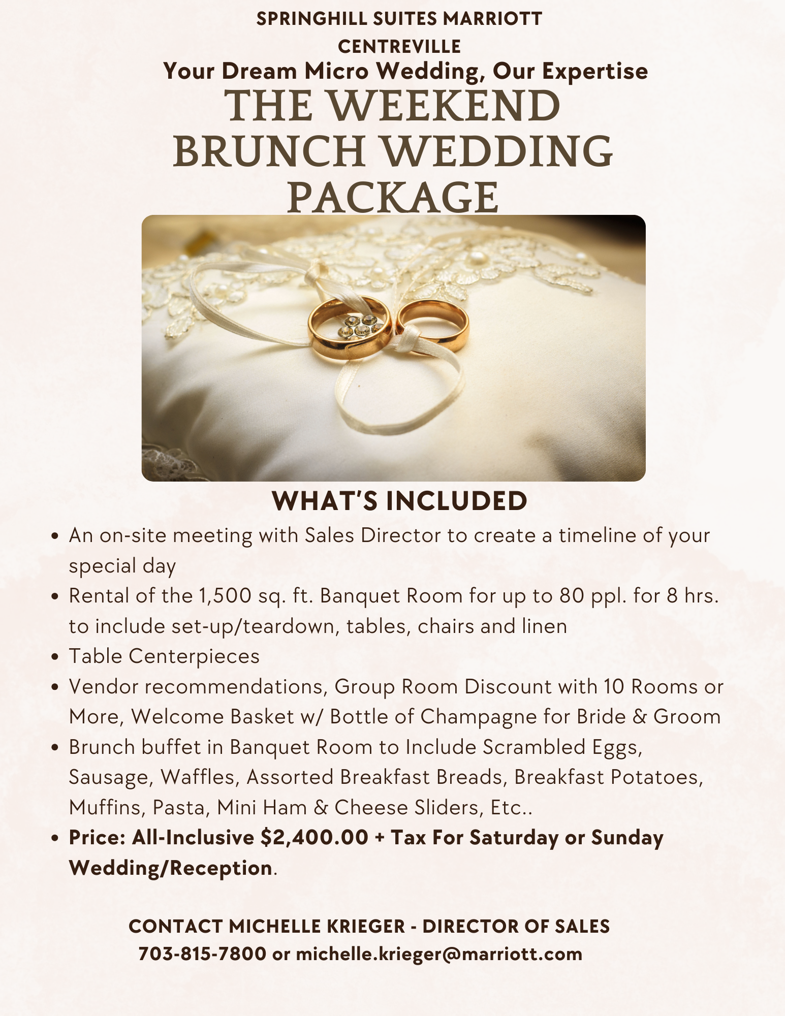 MIRCO WEDDING WEEKEND BRUNCH PACKAGE TO INCLUDE ROOM RENTAL, BRUNCH & OTHER SPECIAL AMENITIES. INQUIRE FOR ADDTIONAL DETAILS. $2,400.00 ALL INCUSIVE PLUS TAX