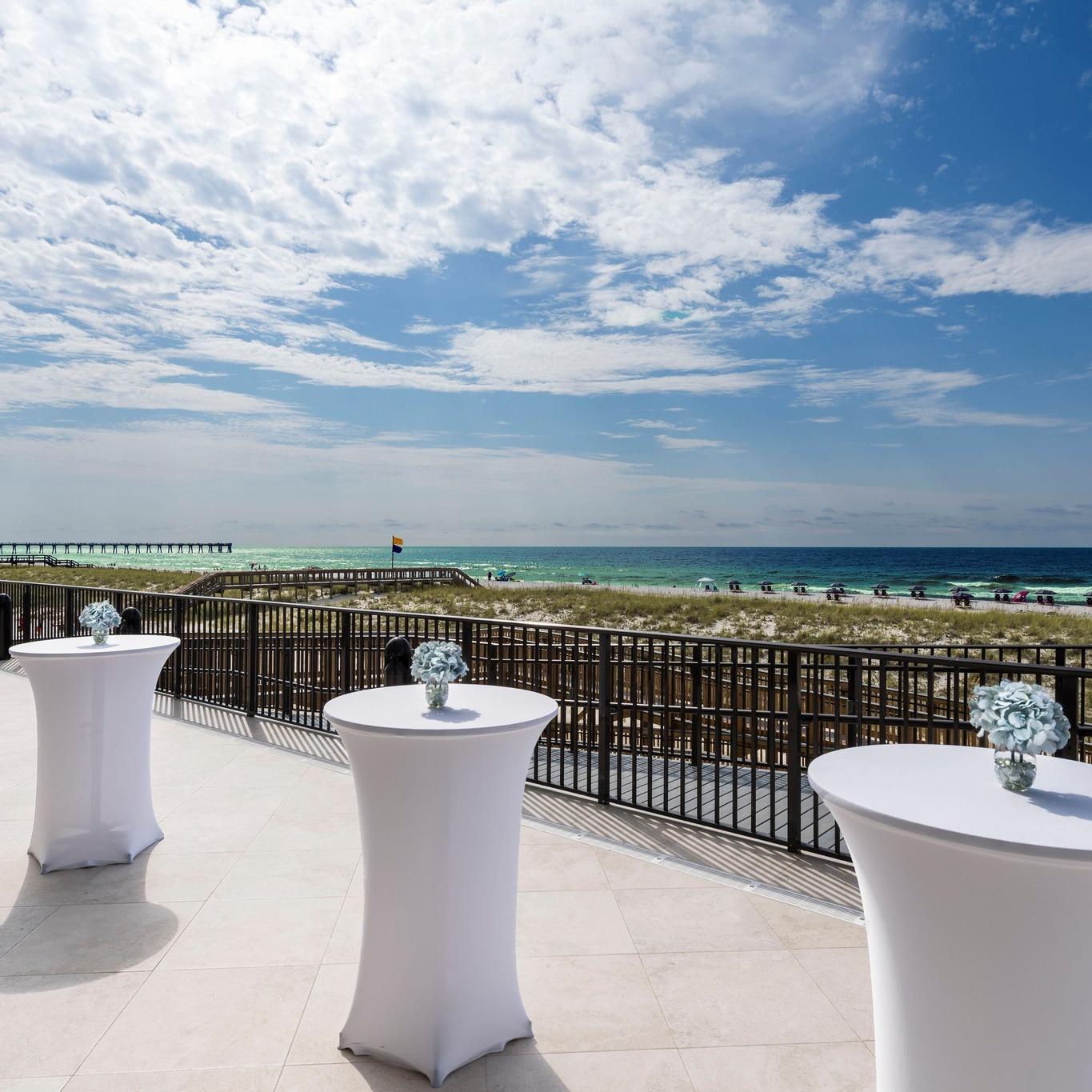 Our 1,700-square-foot ballroom features neutral and nautical tones with floor to ceiling windows that provide picturesque views of the Gulf of Mexico. Step out onto the private patio and enjoy sparkling ocean views of emerald green waters lined with white sand beaches. This space comfortably accommodates a reception of up to 80 guests with a dance floor or up to 100 without. An additional 50 guests can be accommodated with fresh Gulf air on the attached outdoor terrace.