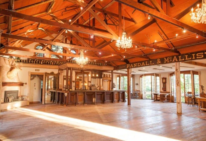 2,500+ sf of open space with cathedral ceilings, crystal chandeliers, 18’ Victorian bar, stone fireplace, and doors from Buenos Aires and Paris. Deck under old-growth redwood trees. Full commercial kitchen. Men’s and Women’s bathrooms.