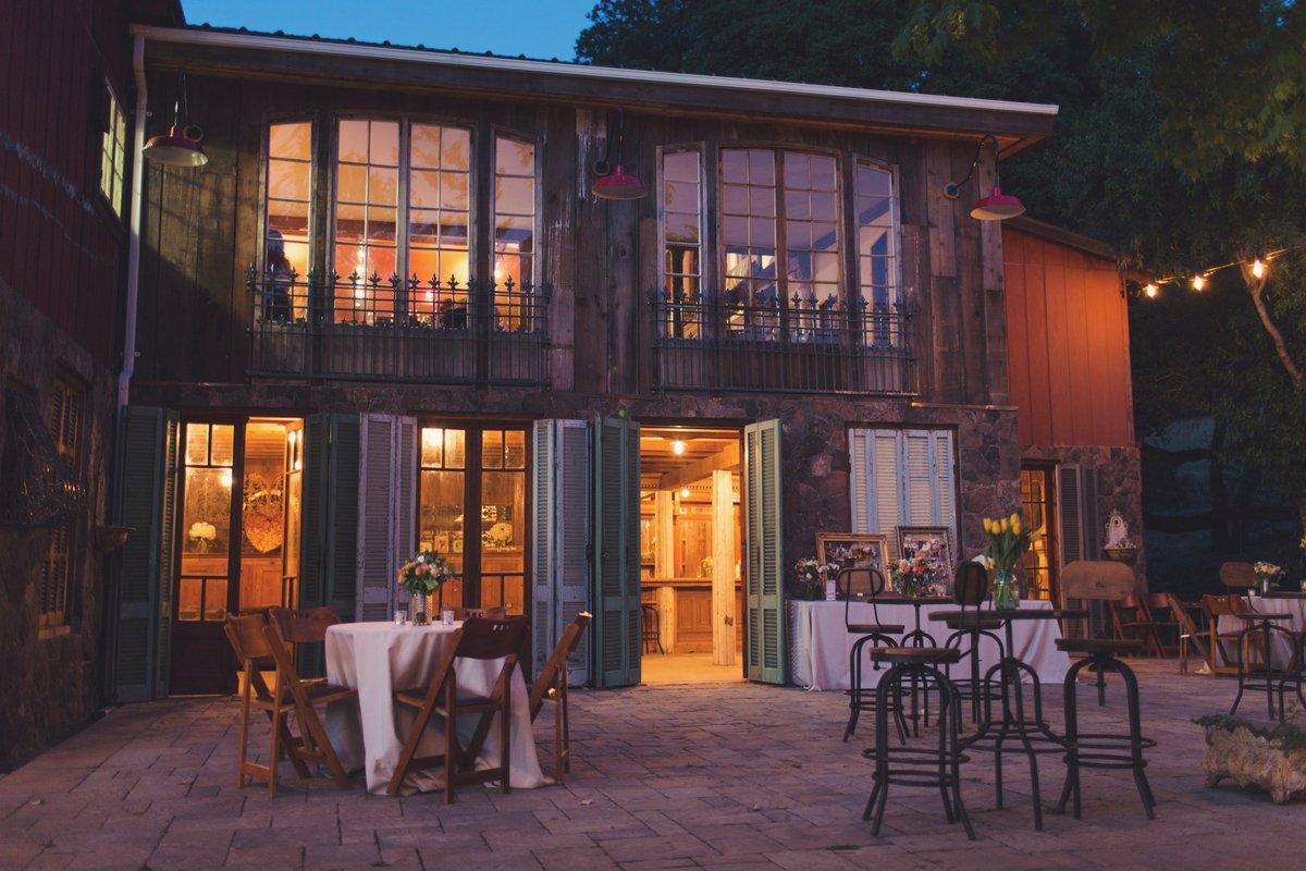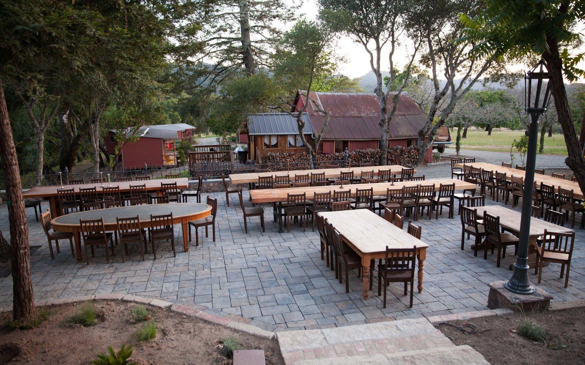 The 1,500 sf upper patio is used primarily for cocktails. Cocktails are served from the bar downstairs in the Event Barn. The 2,000 sf lower patio is used for dinning on massive farm tables. There is a wood-fired pizza oven, Argentine BBQ, and sinks. Both patios have market lighting above, antique streetlights, and vineyard and creek views. There are redwood trees that shade the patios and beautiful iron and stonework. Seating capacity up to 200 people.