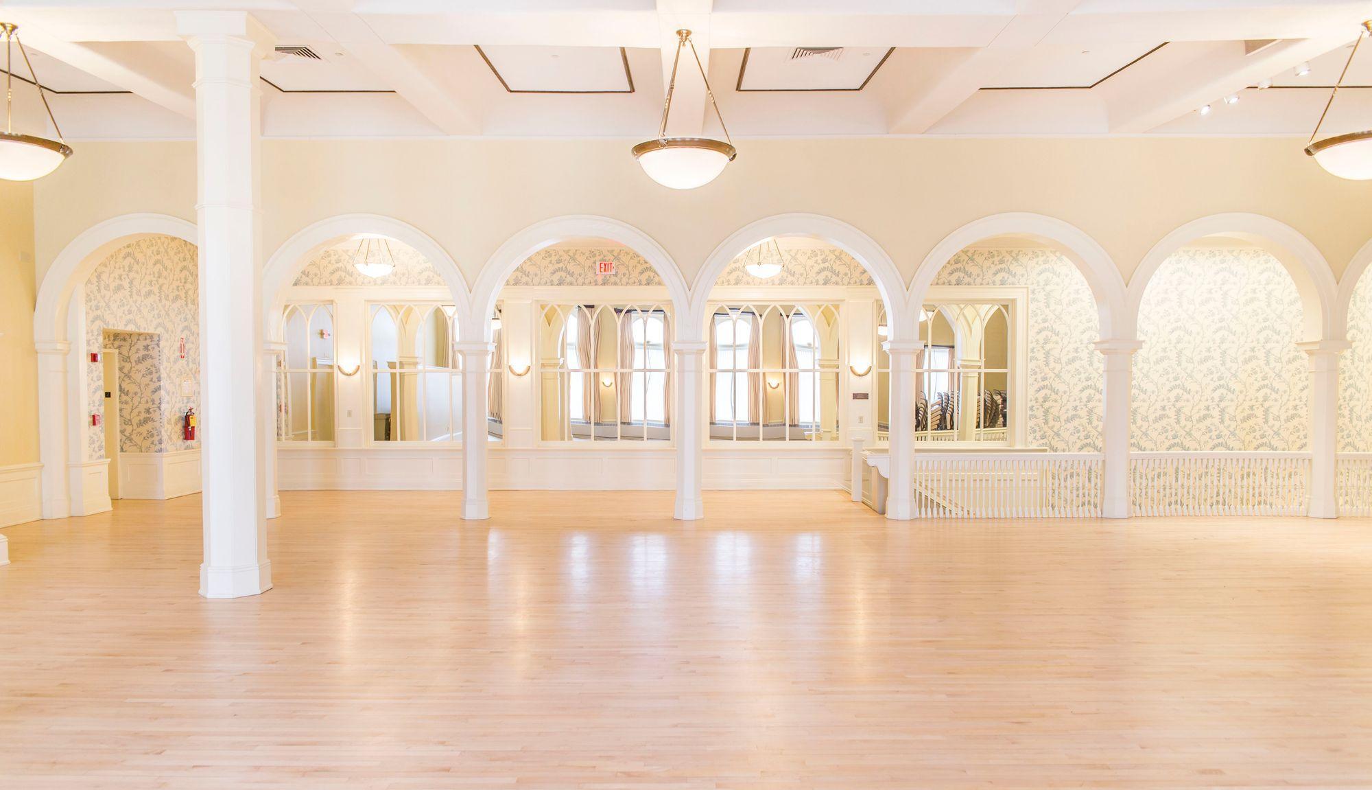 The second-floor Dexter Ballroom is our largest banquet space with two grand pianos, kitchen facilities, elevator, restrooms, hardwood floors, and sunset views. Ideal for weddings and events! Full-day rental from 12pm to 11:30pm, flat rate includes tables, chairs, and setup/teardown.